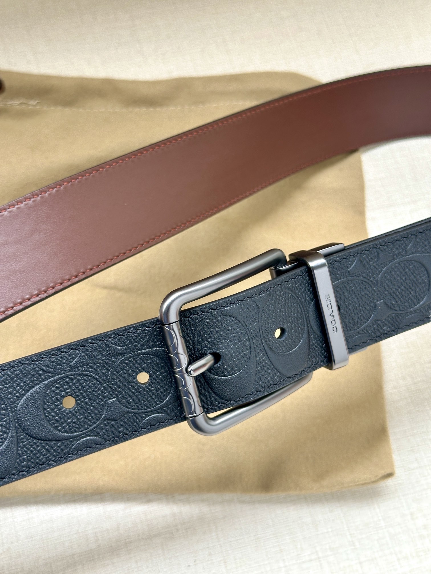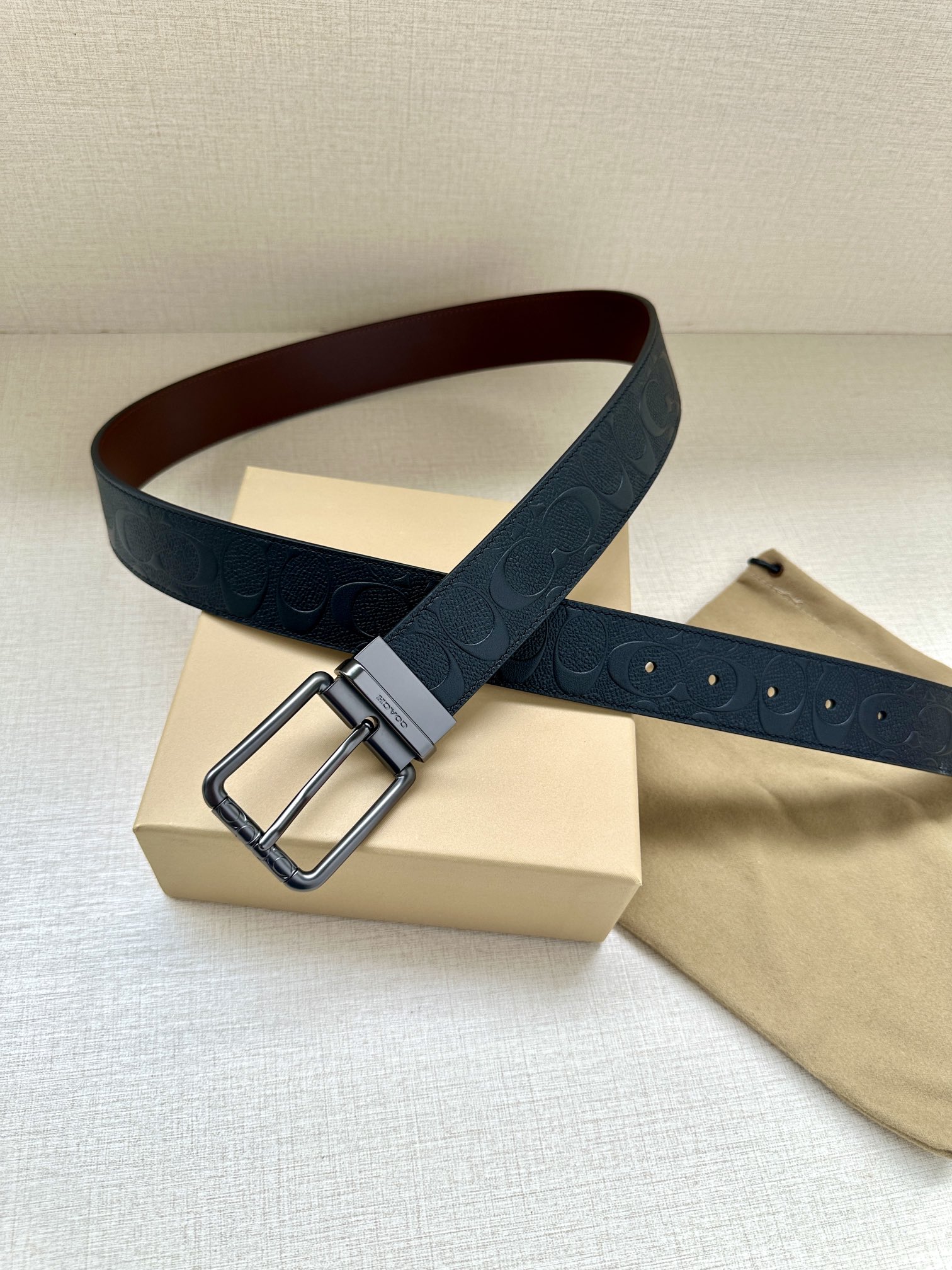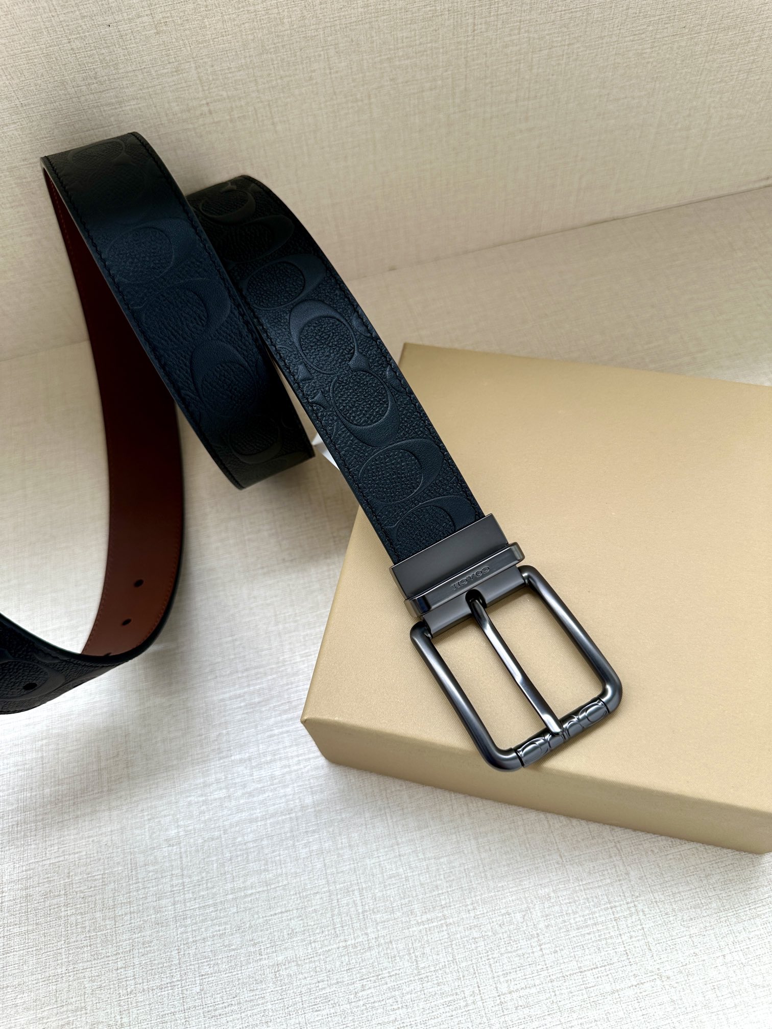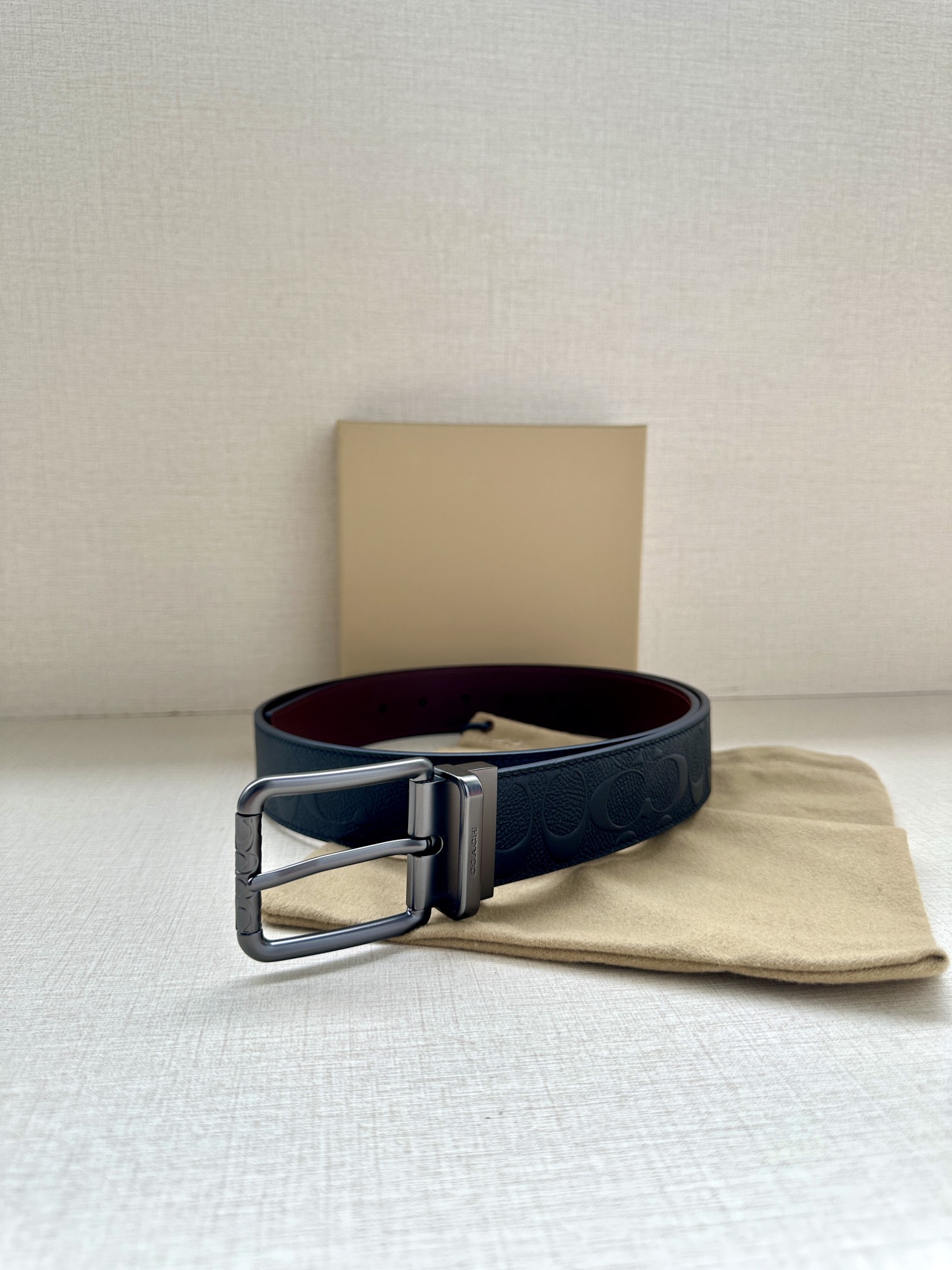 Width 3.8cm COACH This reversible belt features a classic pattern logo on one side and fine leather on the other, with a signature buckle that combines both styles. Follow simple instructions to trim with scissors for a perfect fit.