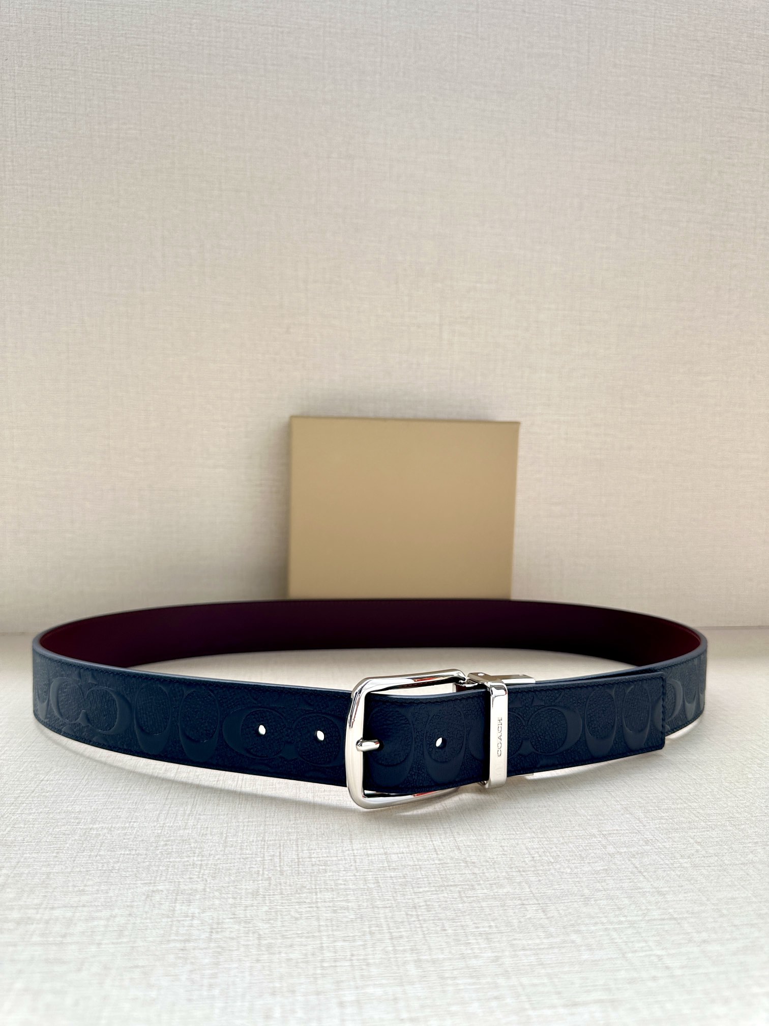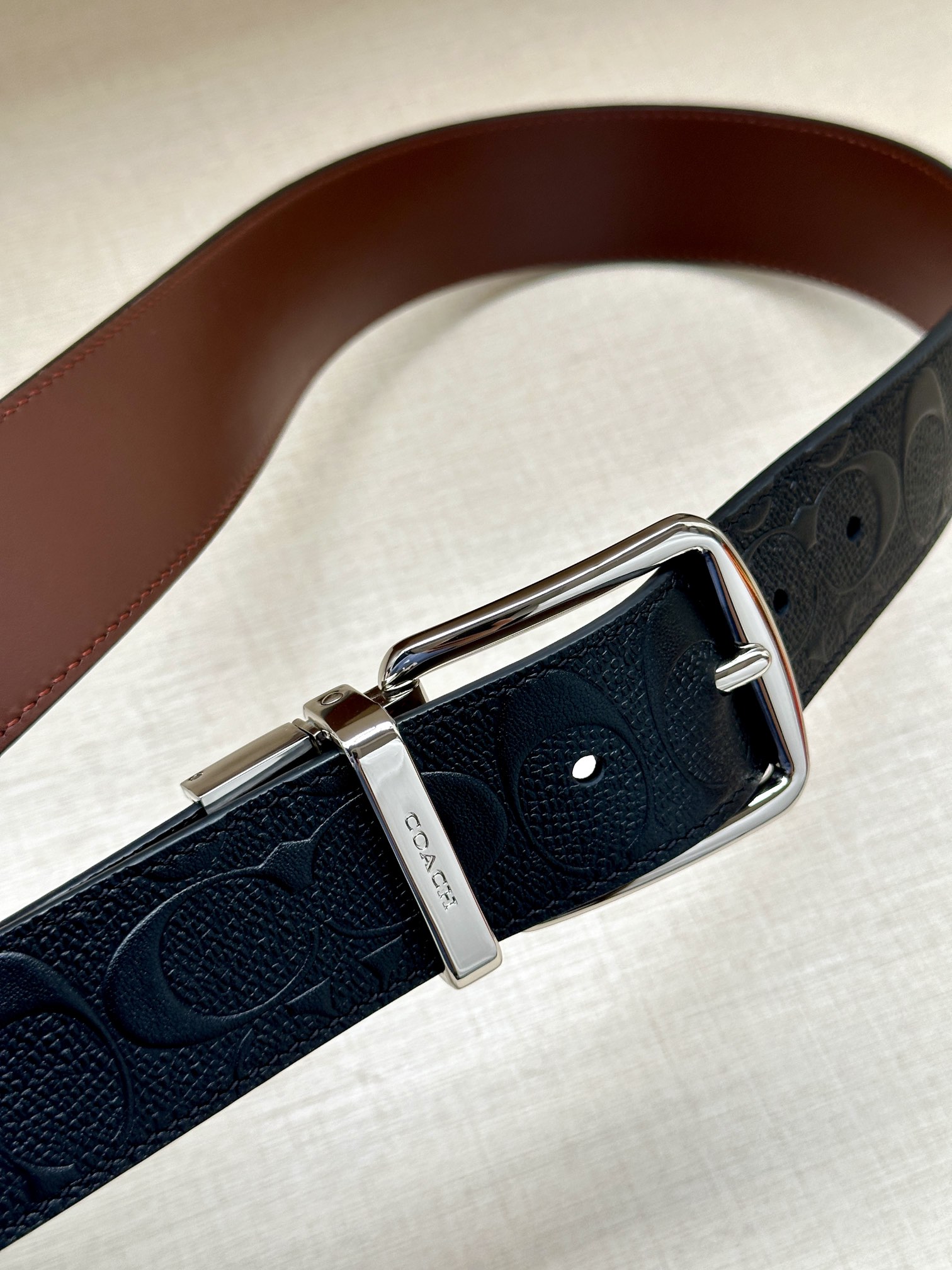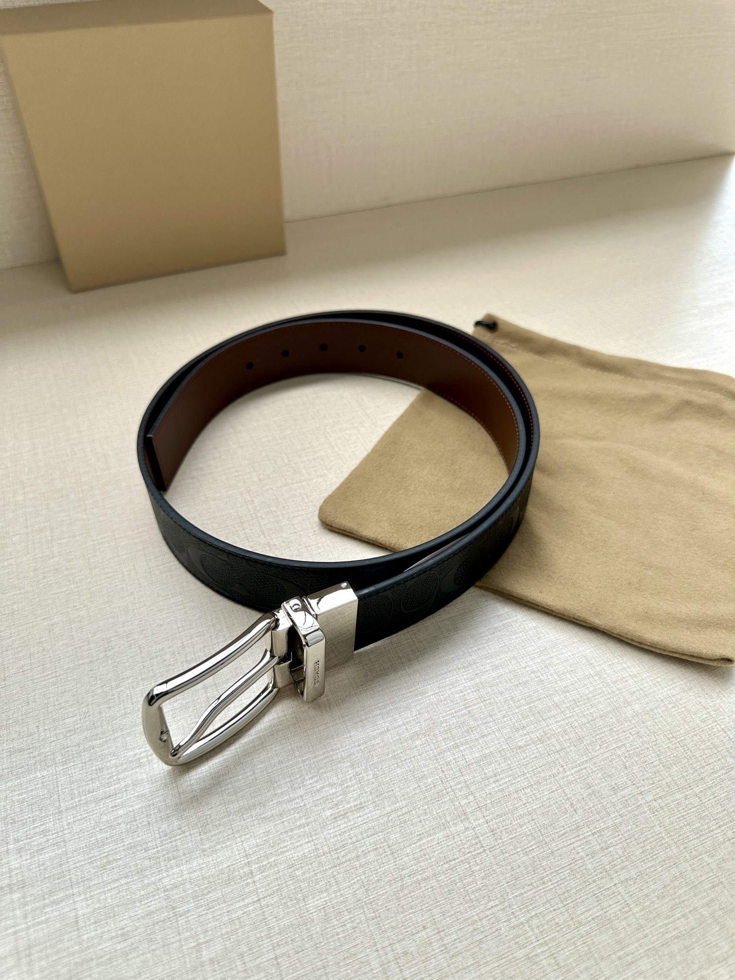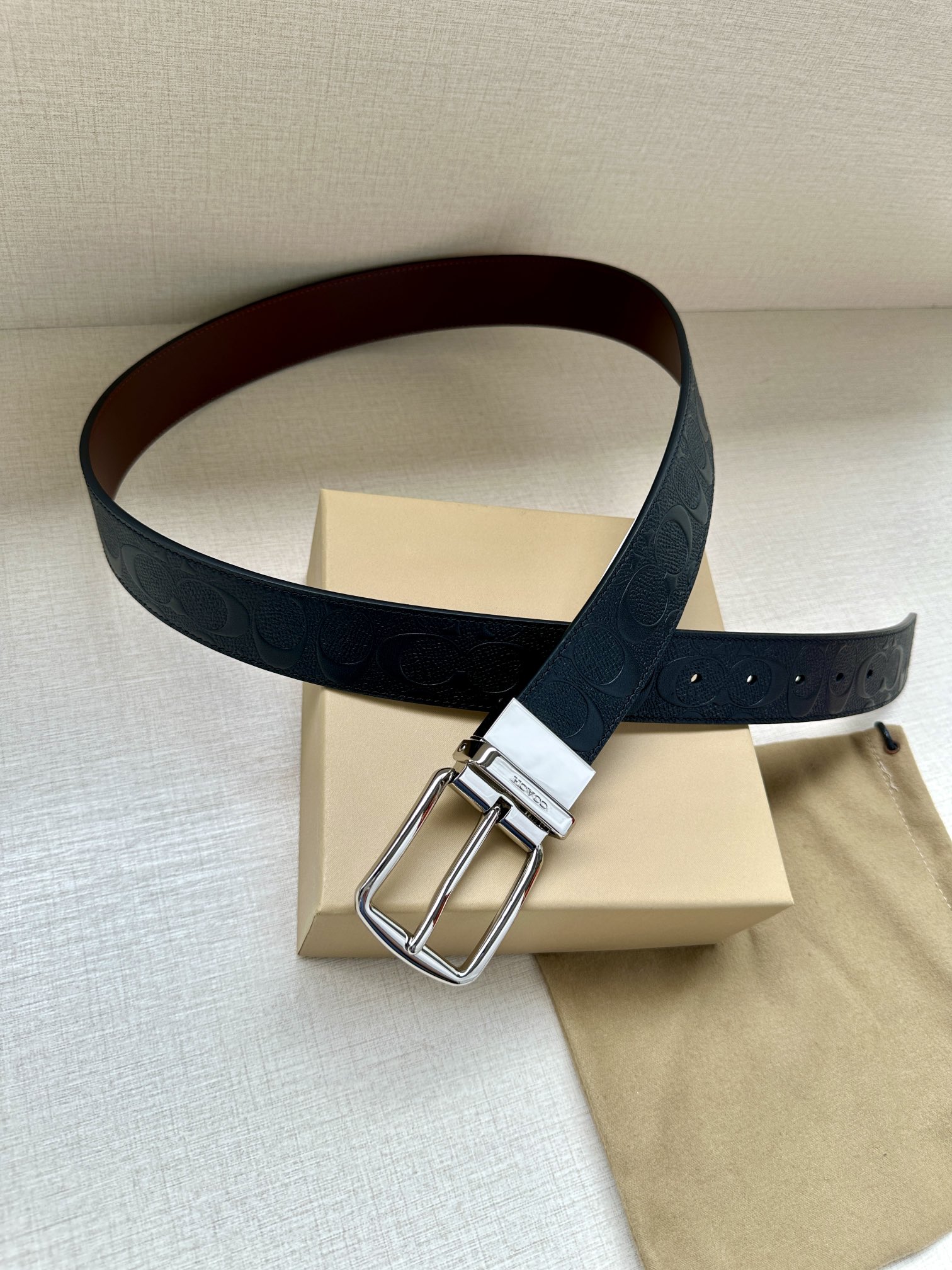 Width 3.8cm COACH This reversible double-sided belt features a classic patterned logo material on one side and refined leather material on the other, equipped with a signature buckle that combines two styles into one. With simple instructions, it can be cut with scissors for a perfect fit.