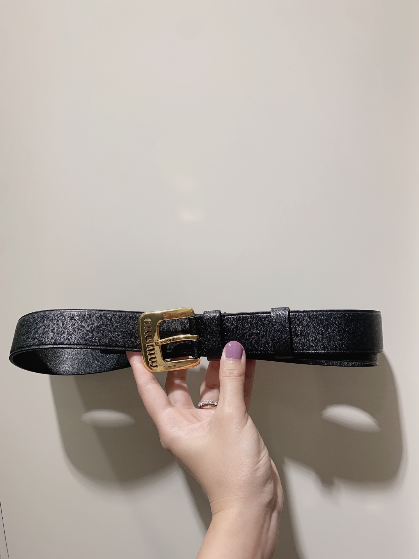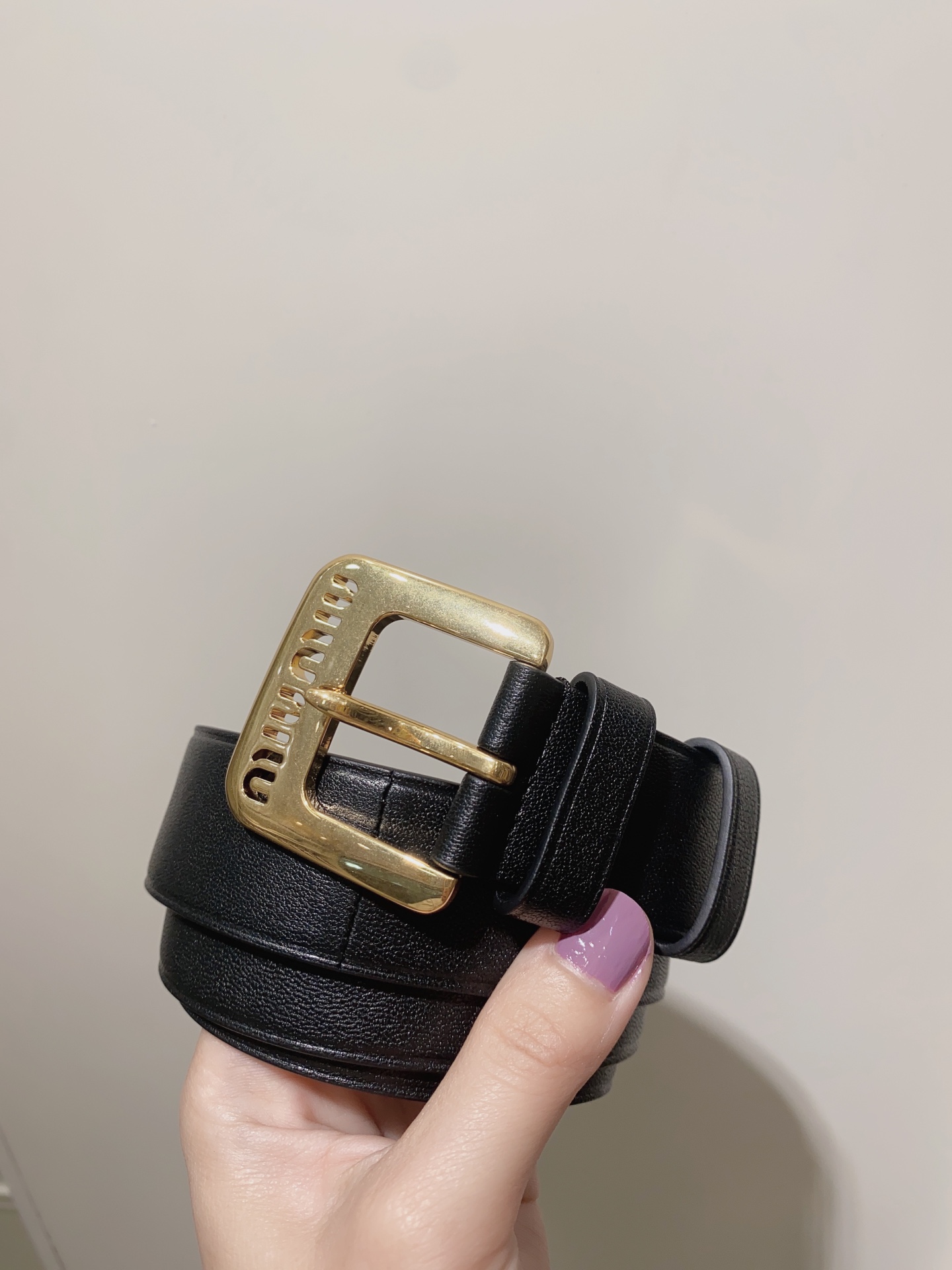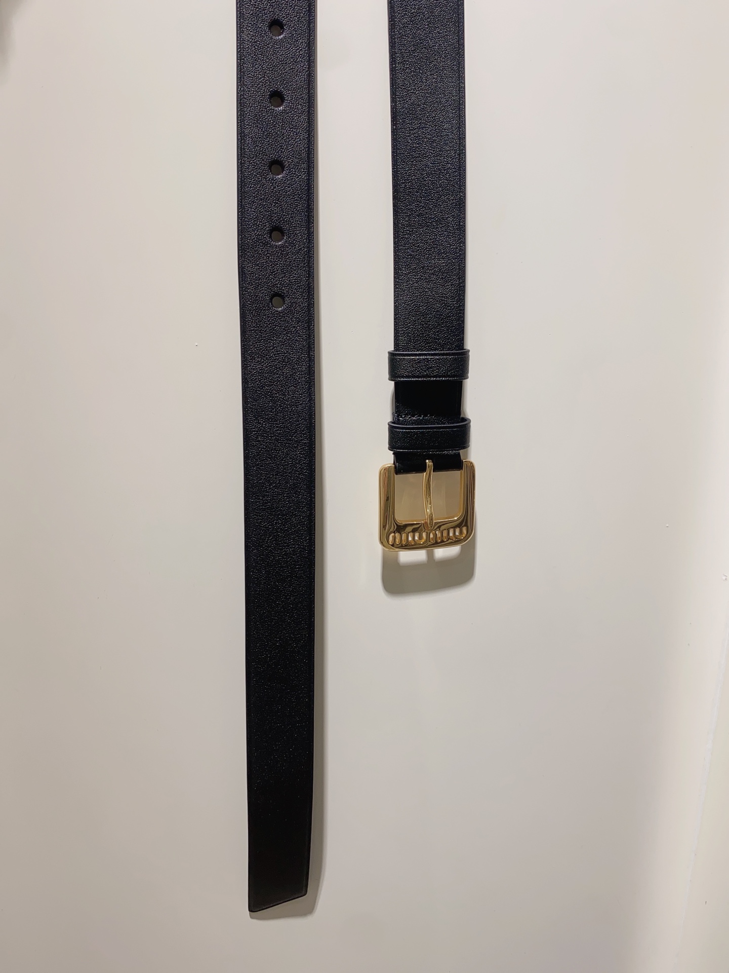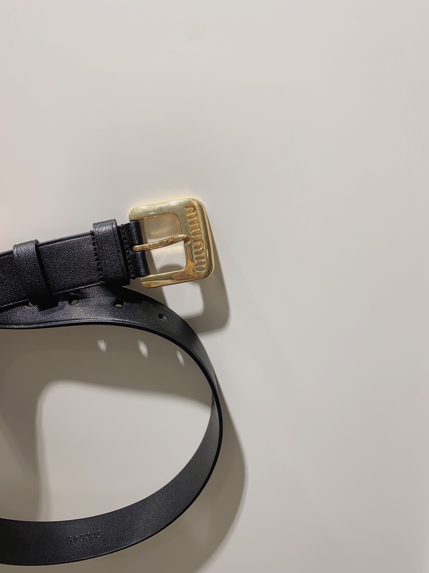 This soft leather belt features a simple and elegant design. The metal buckle is adorned with the Miu Miu logo, showcasing the brand's style at a glance. 3.0 cm
