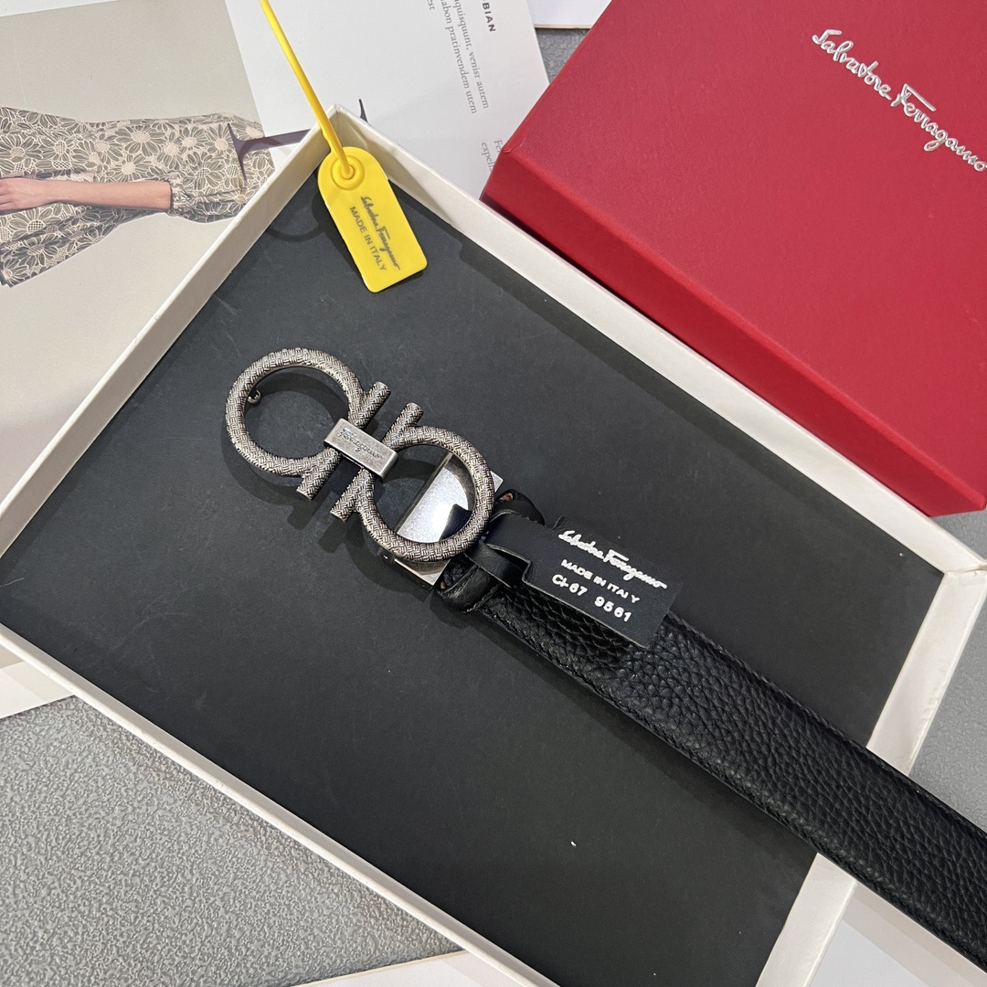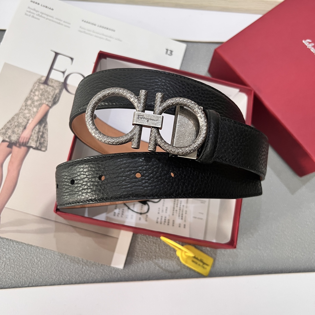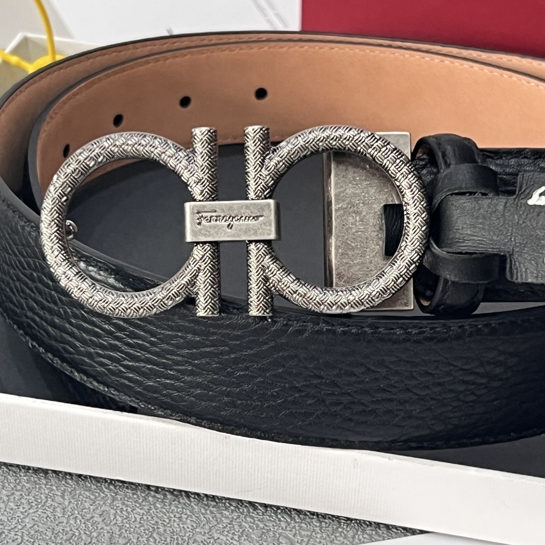 This belt has an elegant style, featuring a rectangular buckle adorned with a small Gancini. It is designed with two sides: one made of hammered texture material, and the other with an all-over Gancini embossed pattern as the base, exuding a classic charm in a low-key manner. The length is adjustable, achieving a tailored, slimming effect. 3.5 wide.