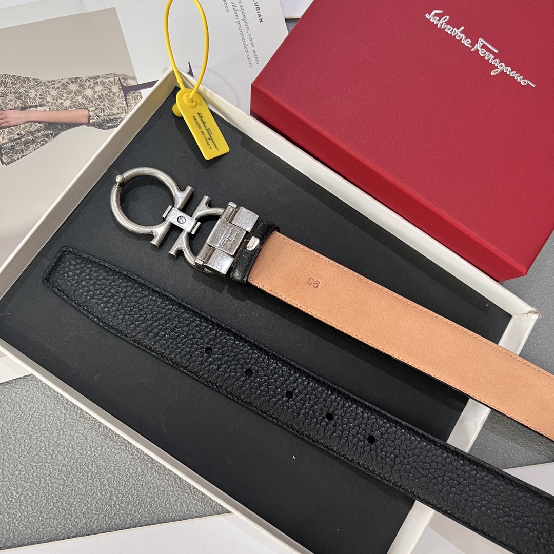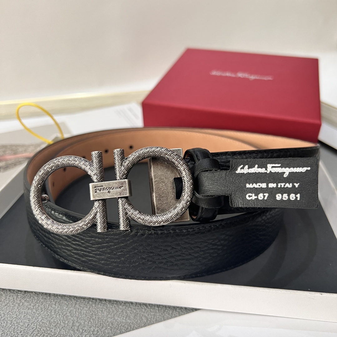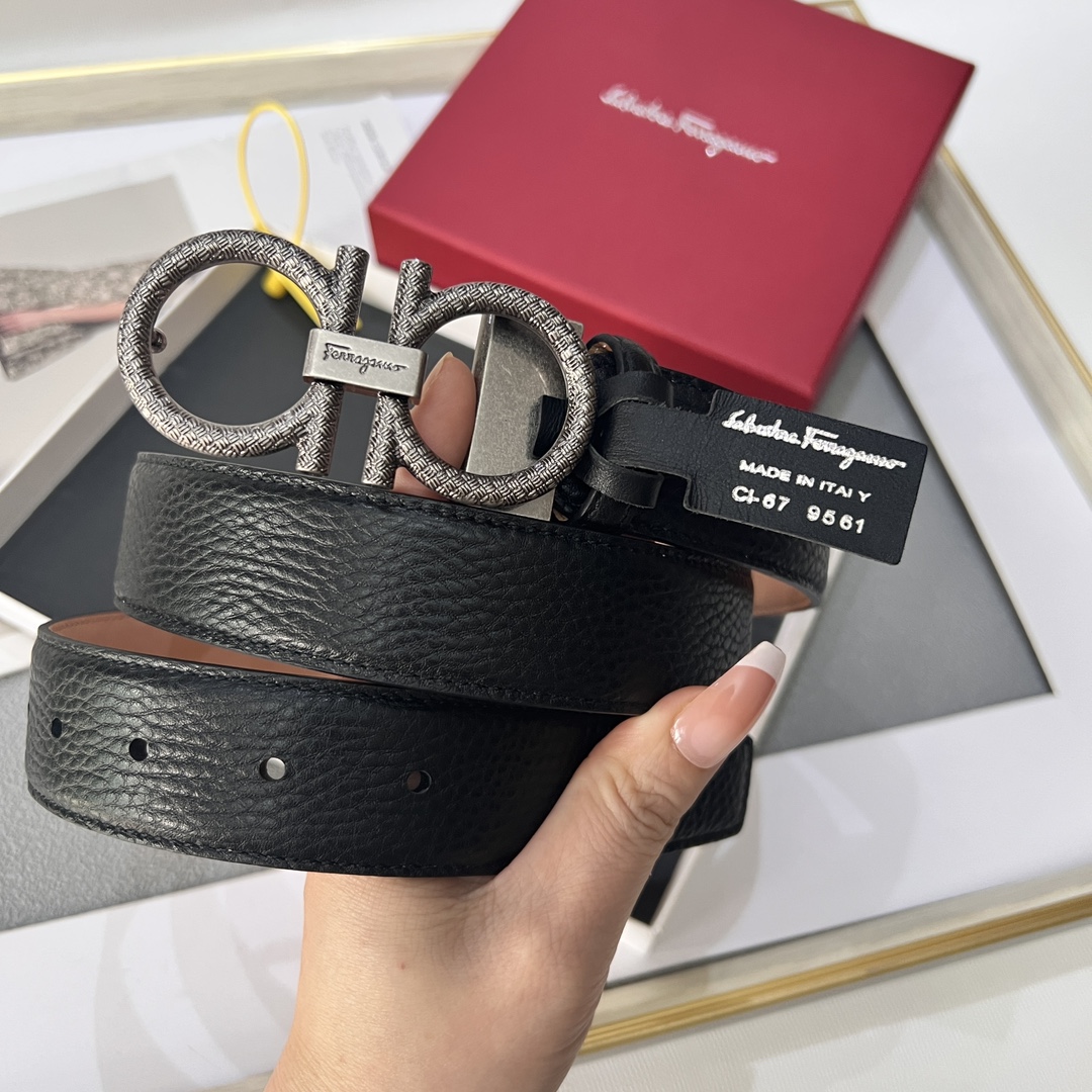 This belt has an elegant style, featuring a rectangular buckle adorned with a small Gancini. It is designed with two sides: one made of hammered texture material, and the other with an all-over Gancini embossed pattern as the base, exuding a classic charm in a low-key manner. The length is adjustable, achieving a tailored, slimming effect. 3.5 wide.