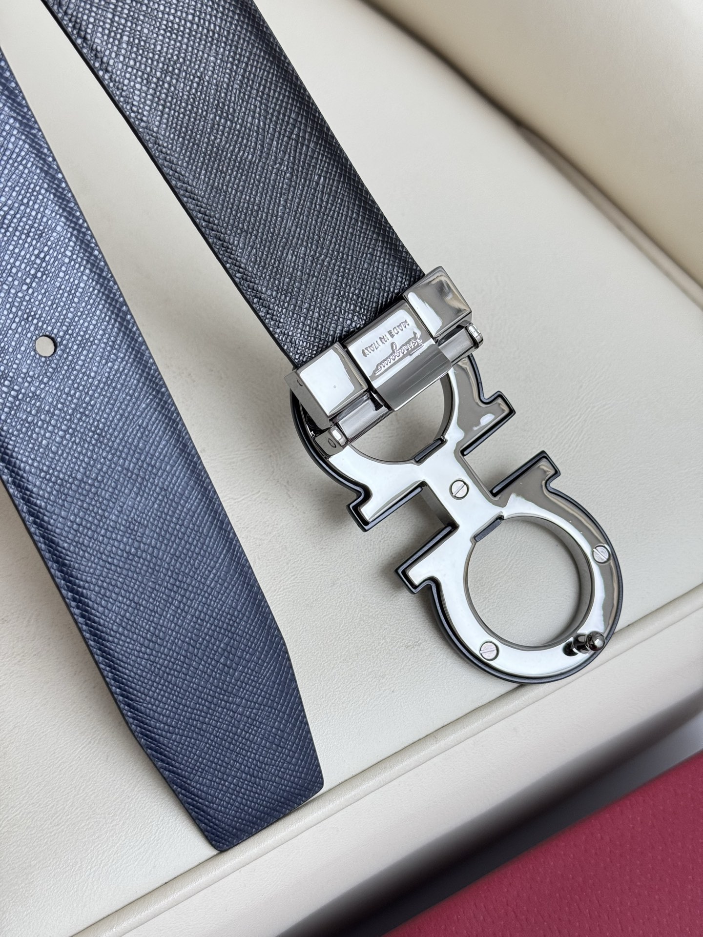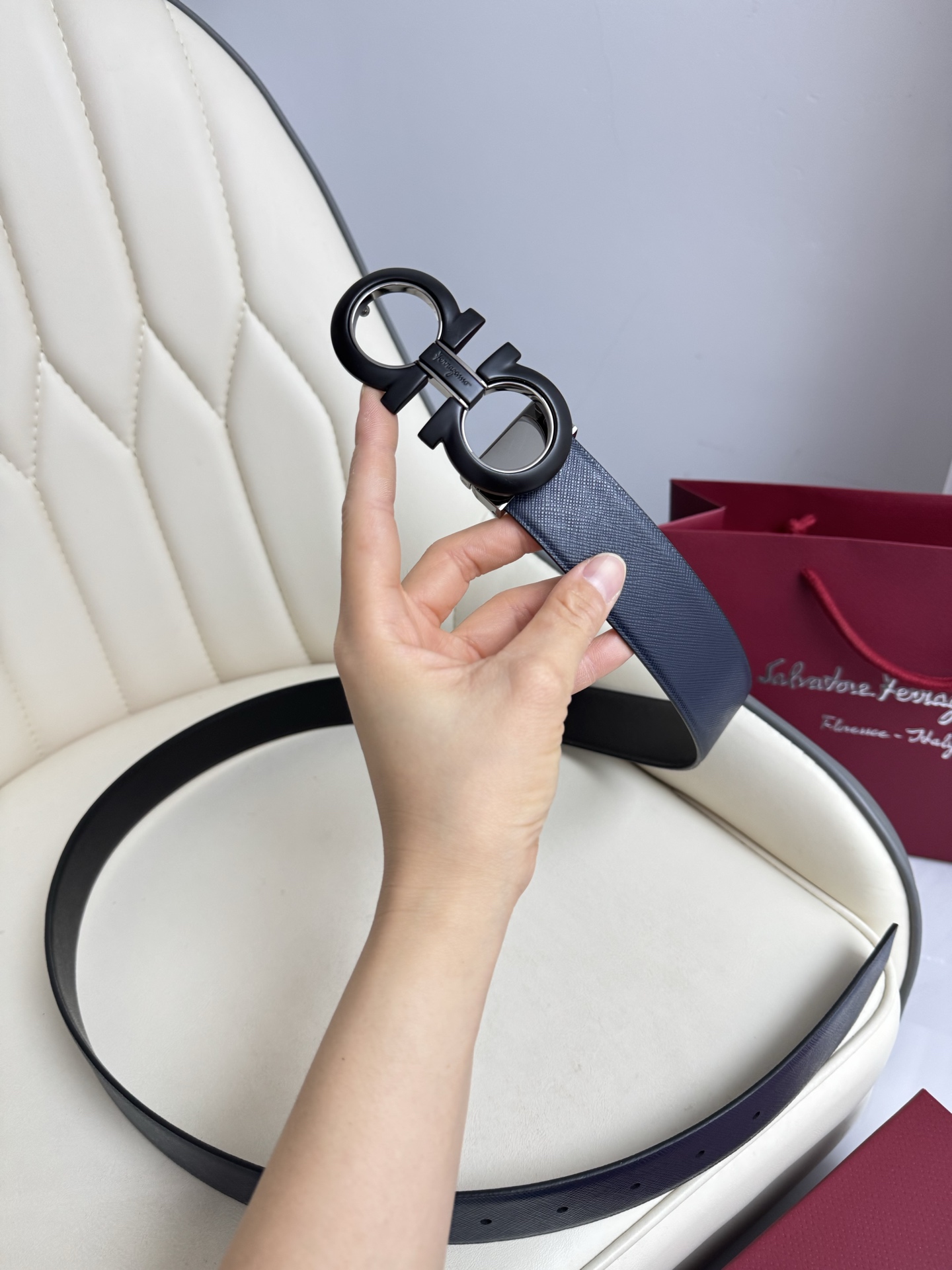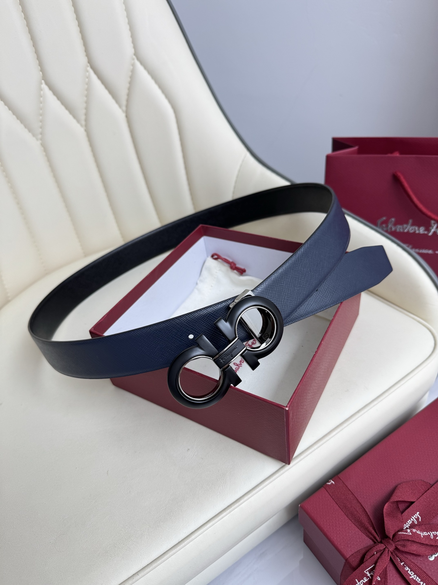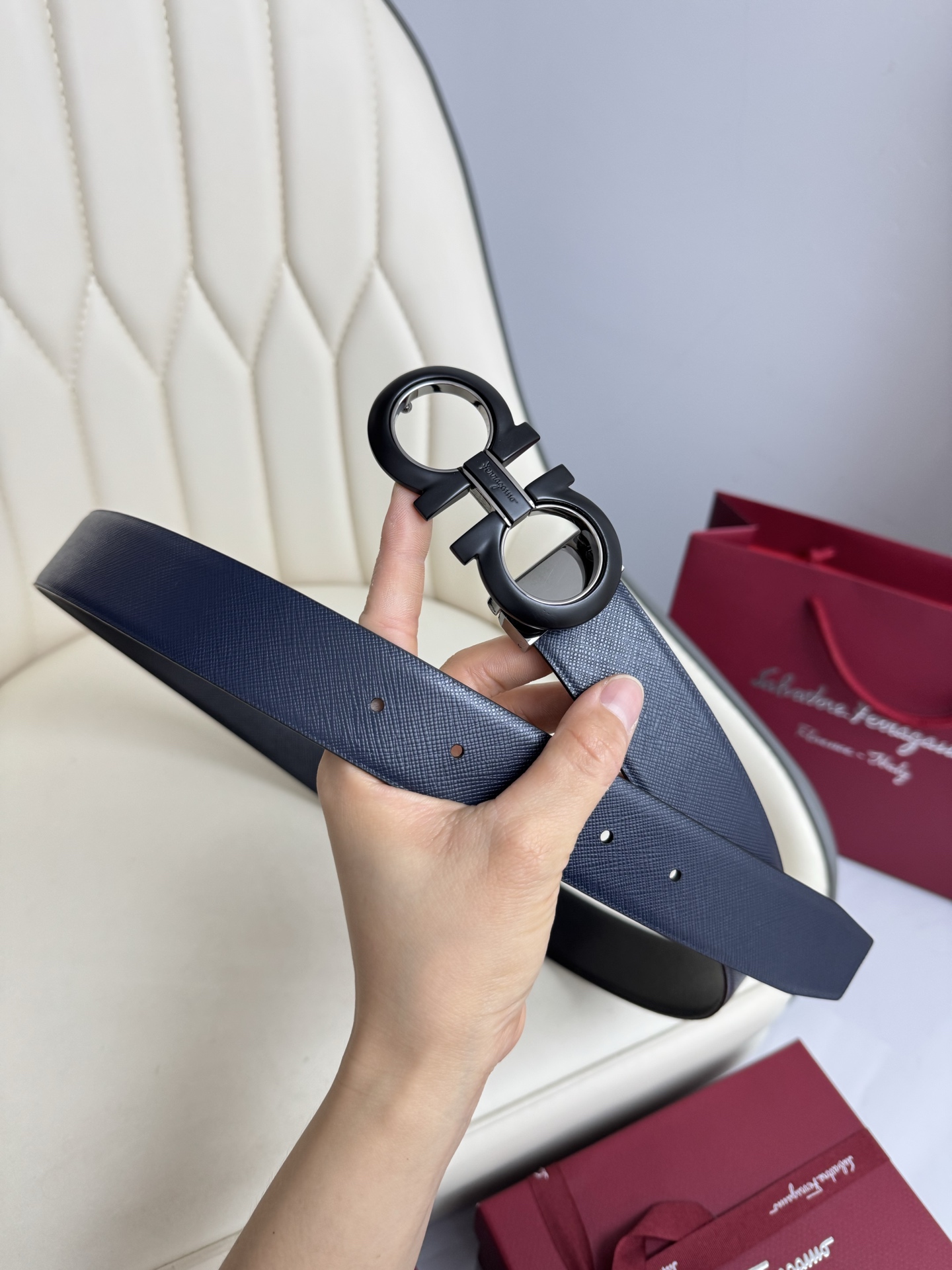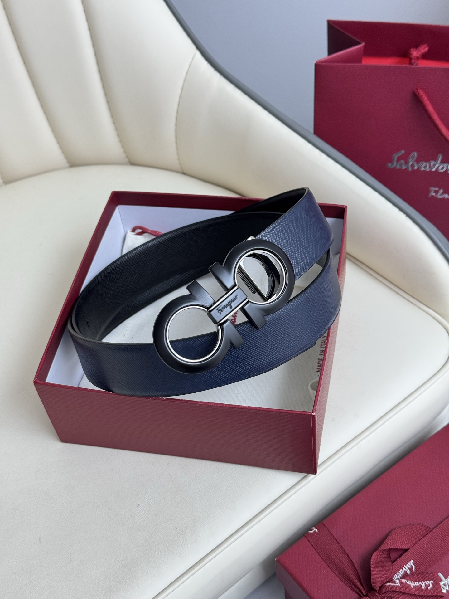 Home • Belt • Ferragamo double-sided genuine leather belt with vacuum electroplated brass buckle. Versatile, stylish, and comes with full packaging. Width 3.5cm.