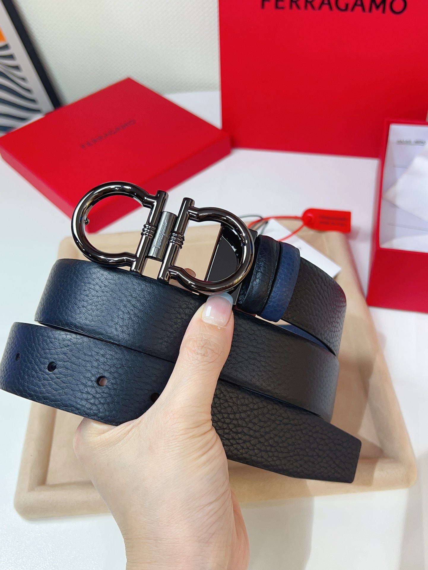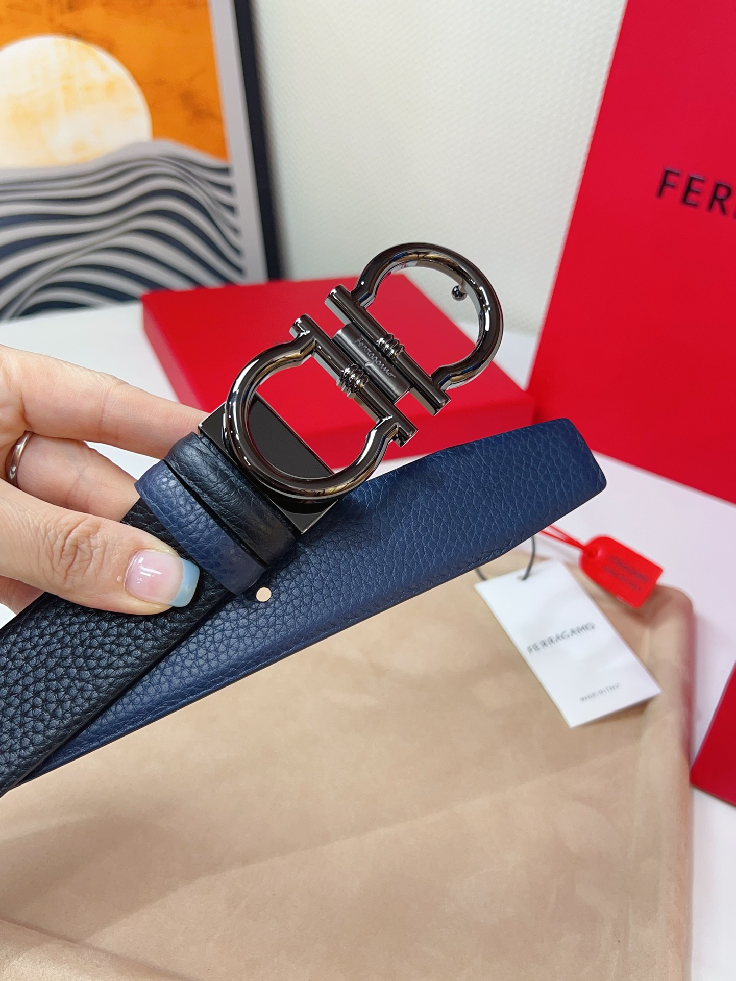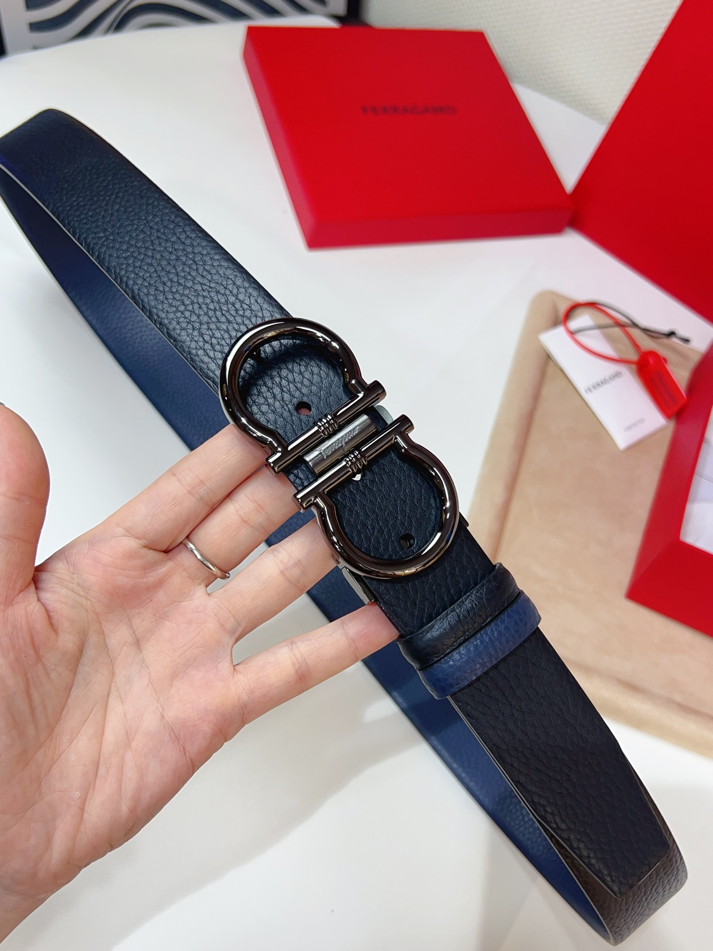 This double-sided belt is stylish and versatile, an indispensable men's accessory item. One side is made of hammered calfskin, while the other side is made of selected natural grain calfskin, adorned with a gold-finished Gancini buckle to add a touch of elegance. The interior features exquisite satin decorative details. The length is adjustable. The belt can be trimmed or additional eyelets can be added to create a tight or loose fit, 3.5 wide.