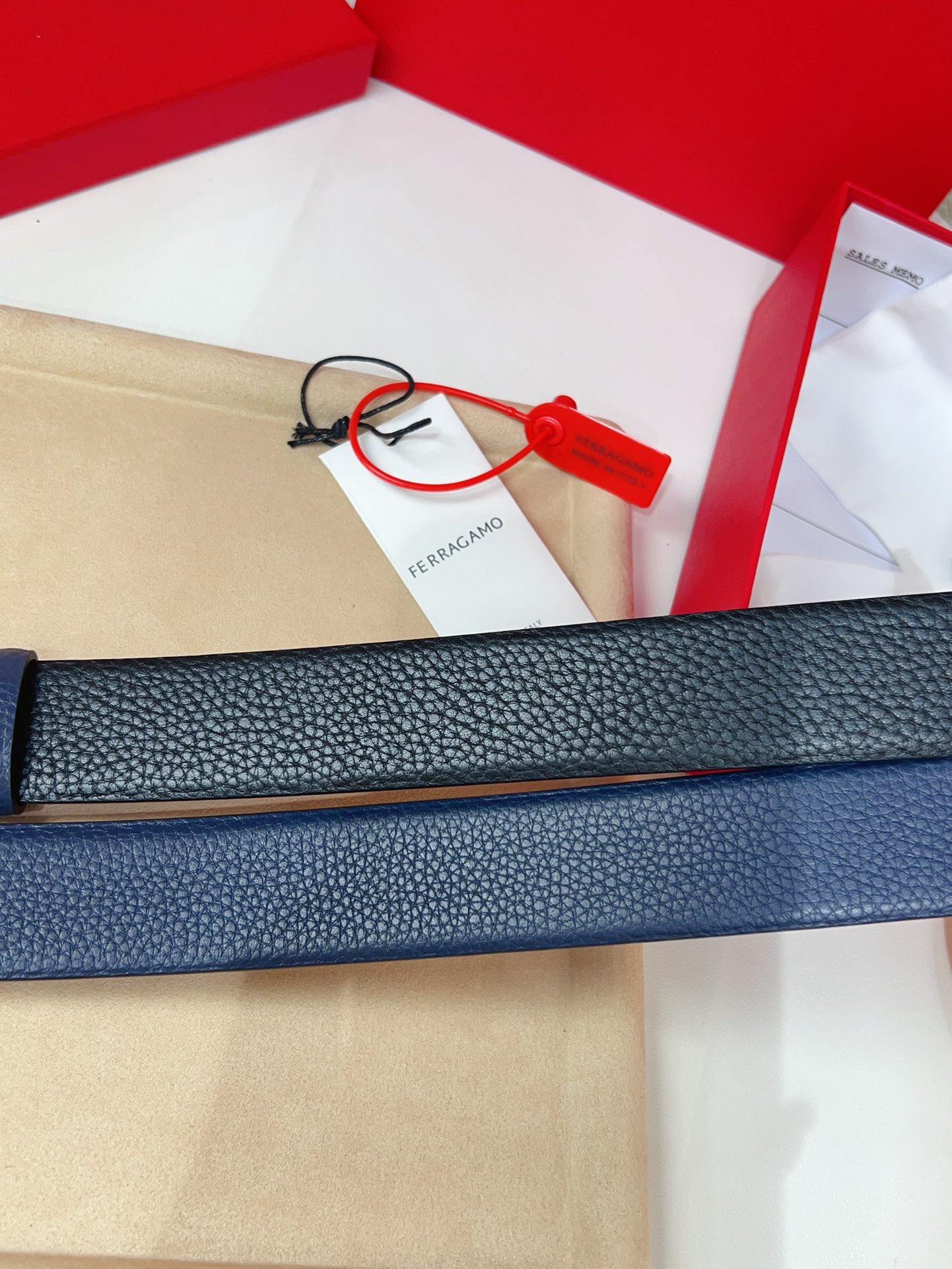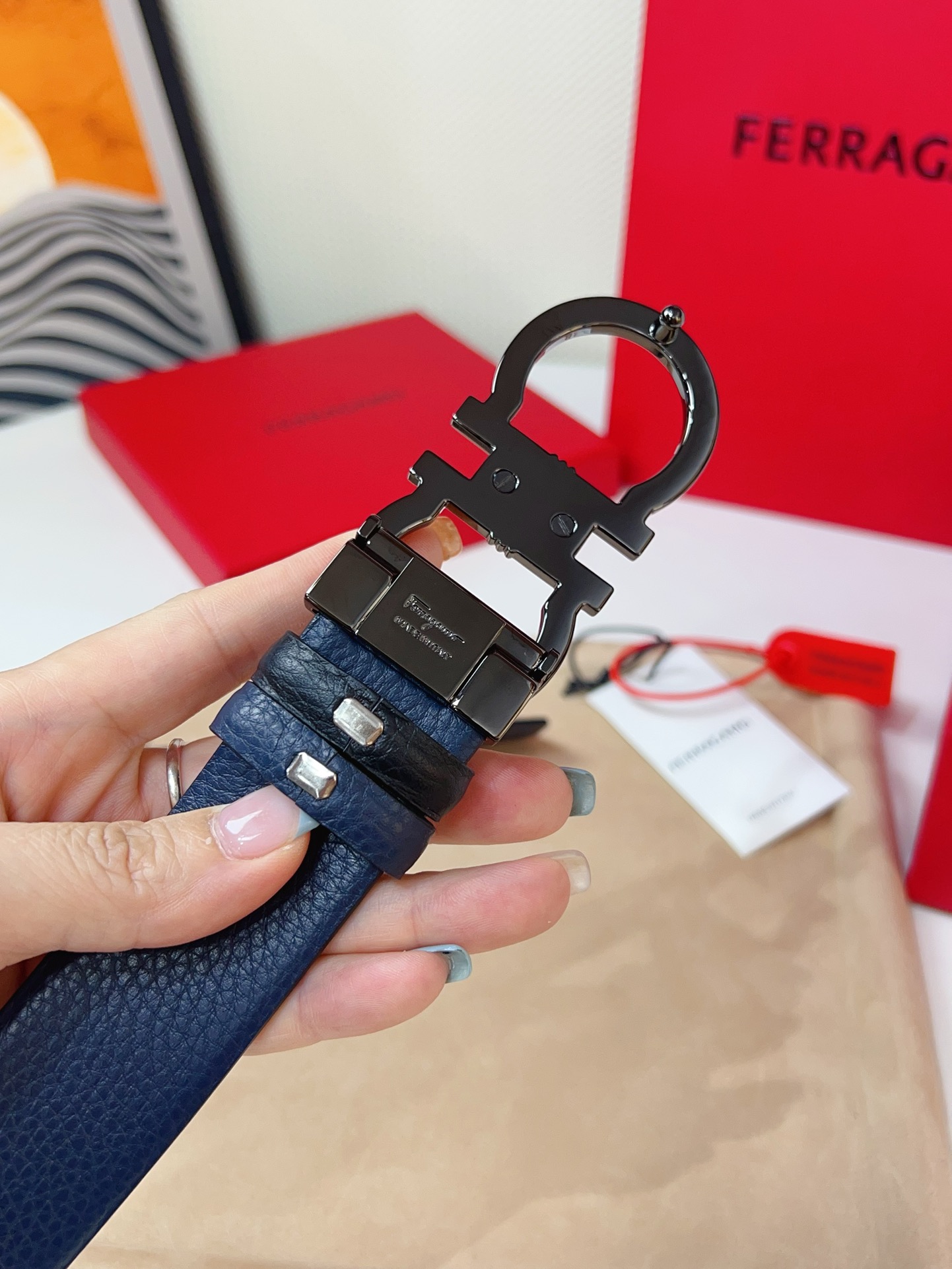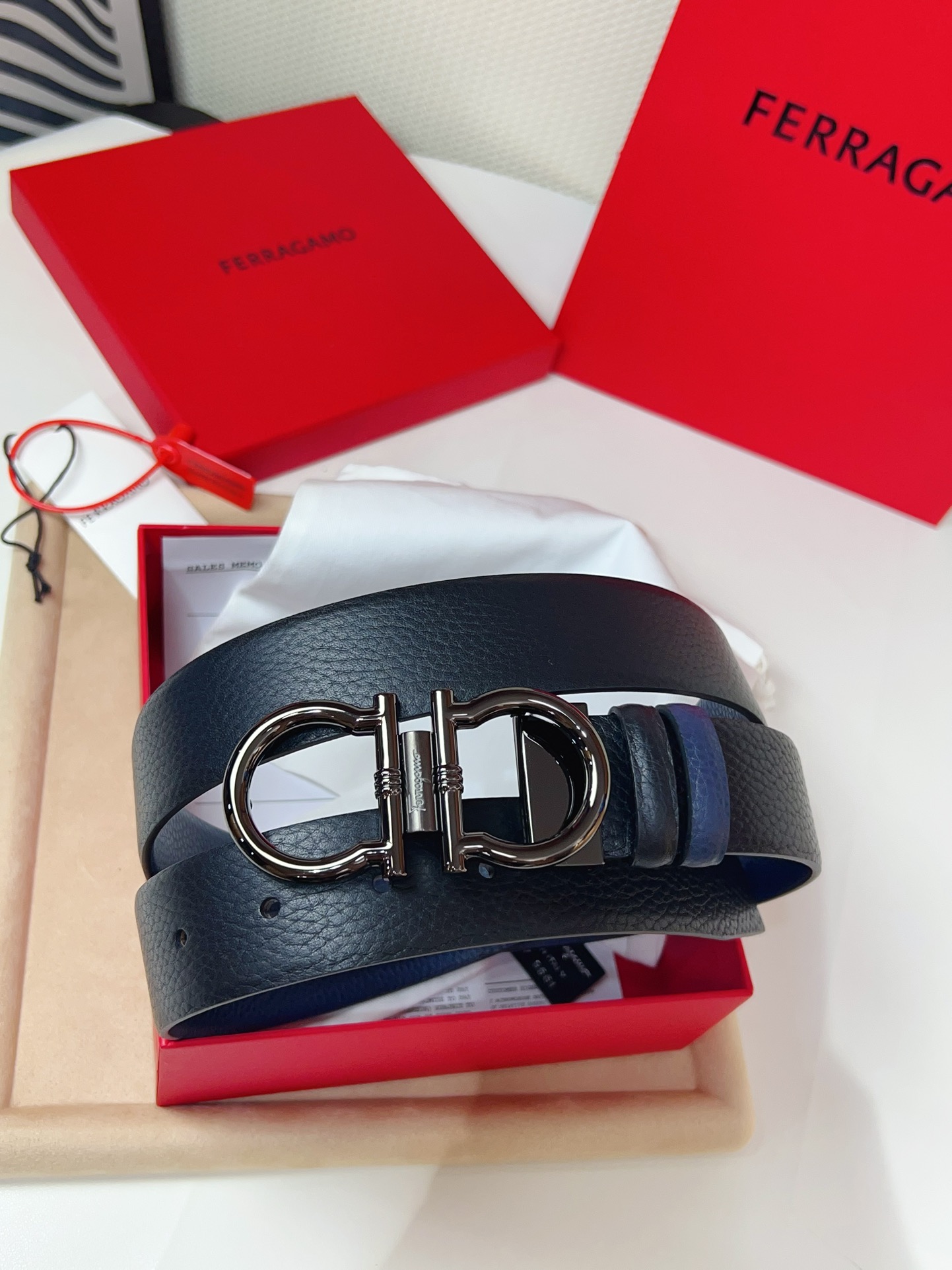 This double-sided belt is stylish and versatile, an indispensable men's accessory item. One side is made of hammered calfskin, while the other side is made of selected natural grain calfskin, adorned with a gold-finished Gancini buckle to add a touch of elegance. The interior features exquisite satin decorative details. The length is adjustable. The belt can be trimmed or additional eyelets can be added to create a tight or loose fit, 3.5 wide.