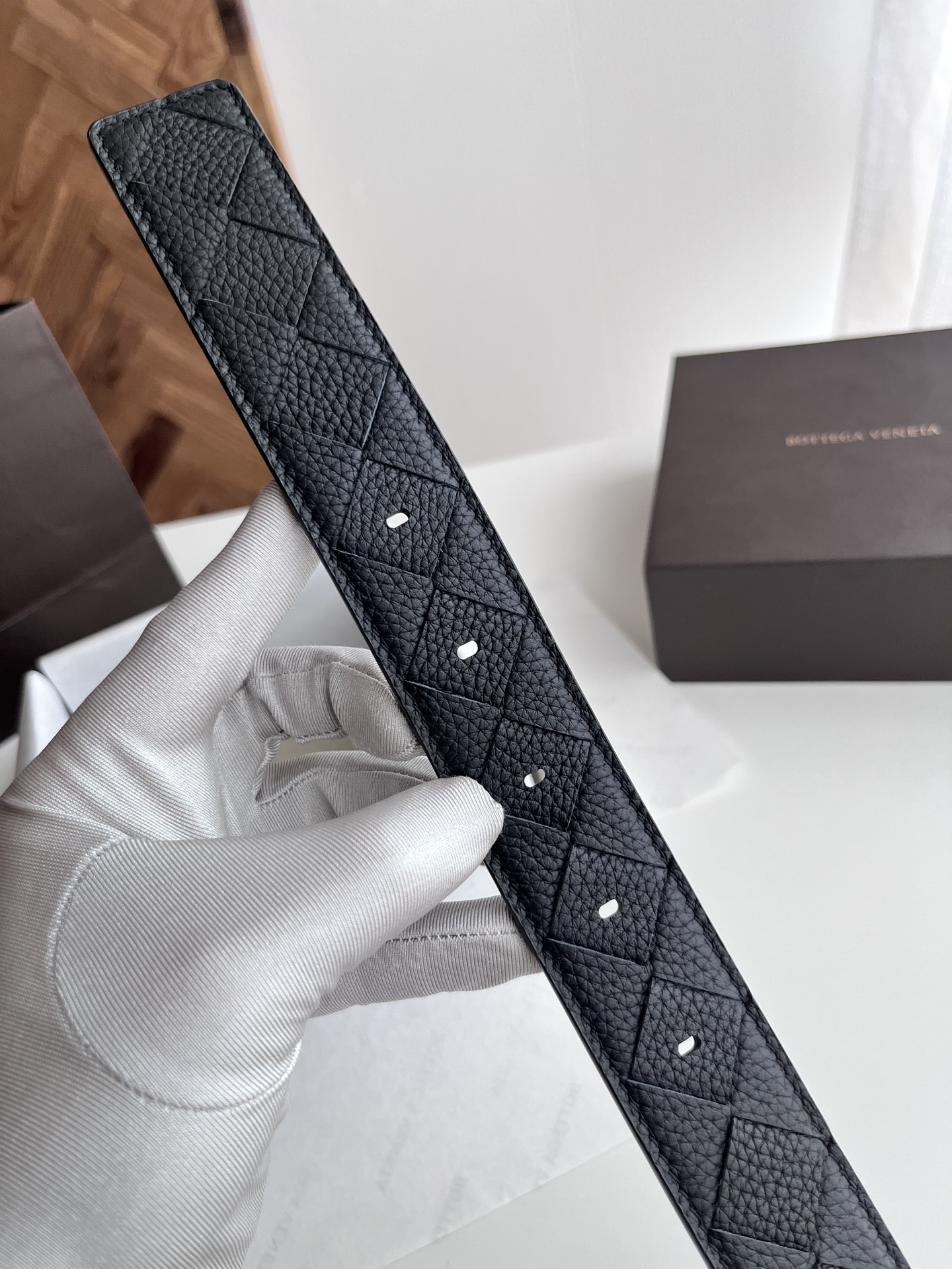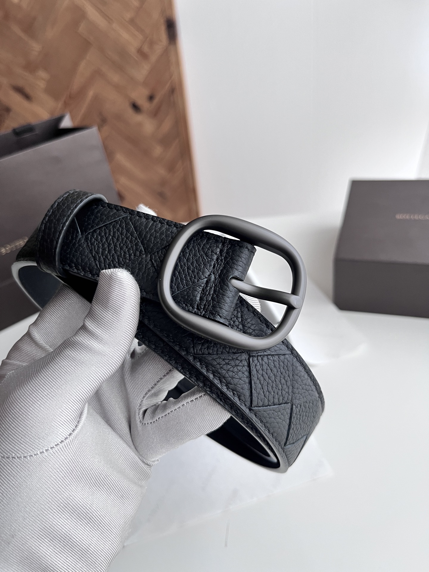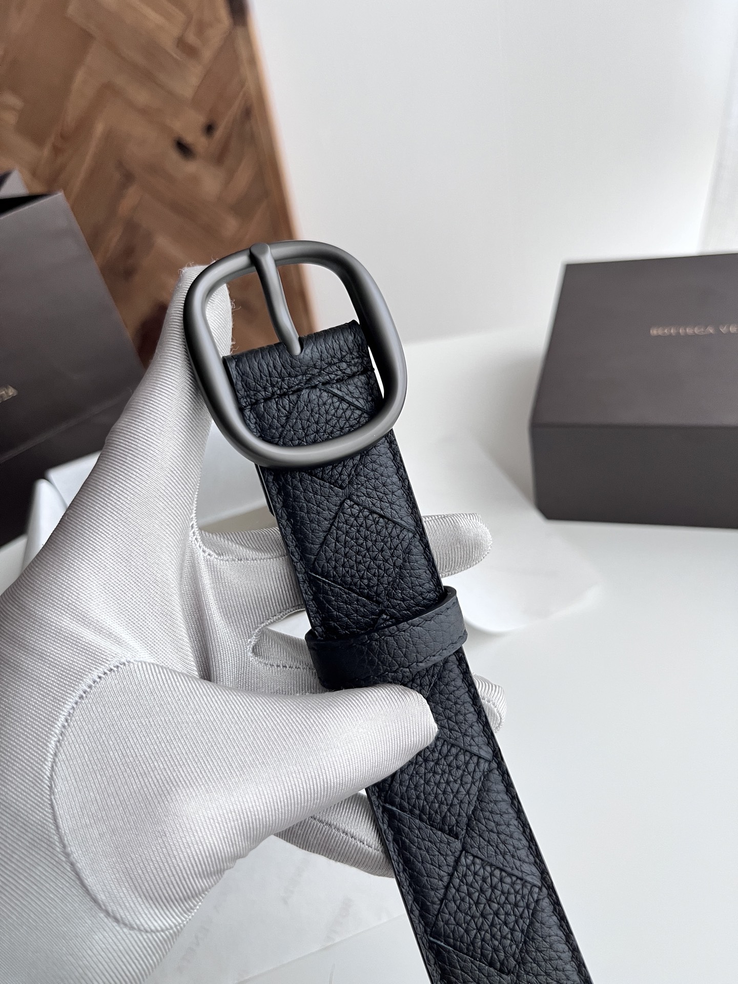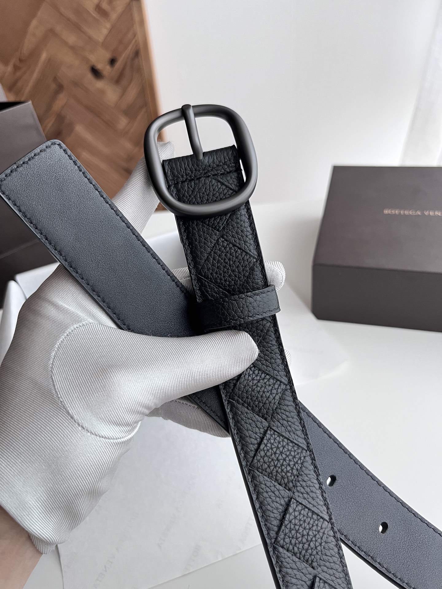 Bv 2025 latest men's woven belt, pure handmade intreccio large grid weaving, Italian lychee grain calfskin paired with an oval gunmetal pin buckle, side logo, movable leather loop, width 35MM, color: black