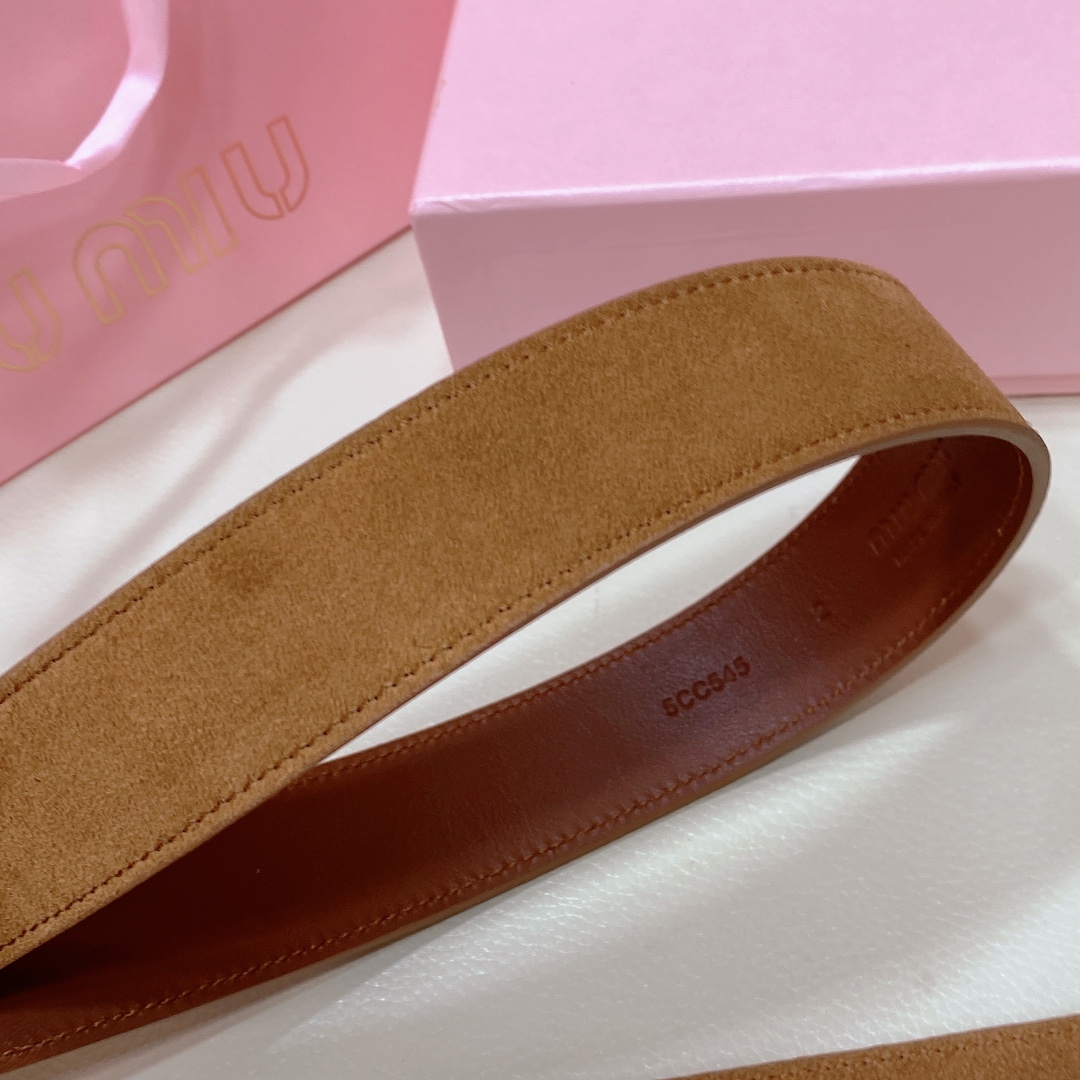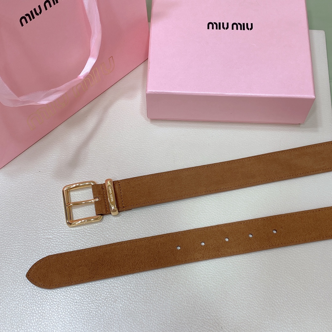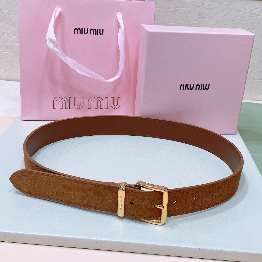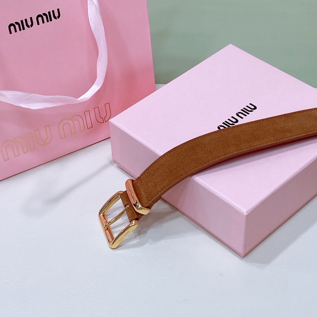 miumiu 25 metal buckle. The belt loop is adorned with a laser-engraved logo. This leather belt features a simple and elegant design, with the belt loop accompanied by the Miu Miu logo. Imported cowhide belt 3.5cm.