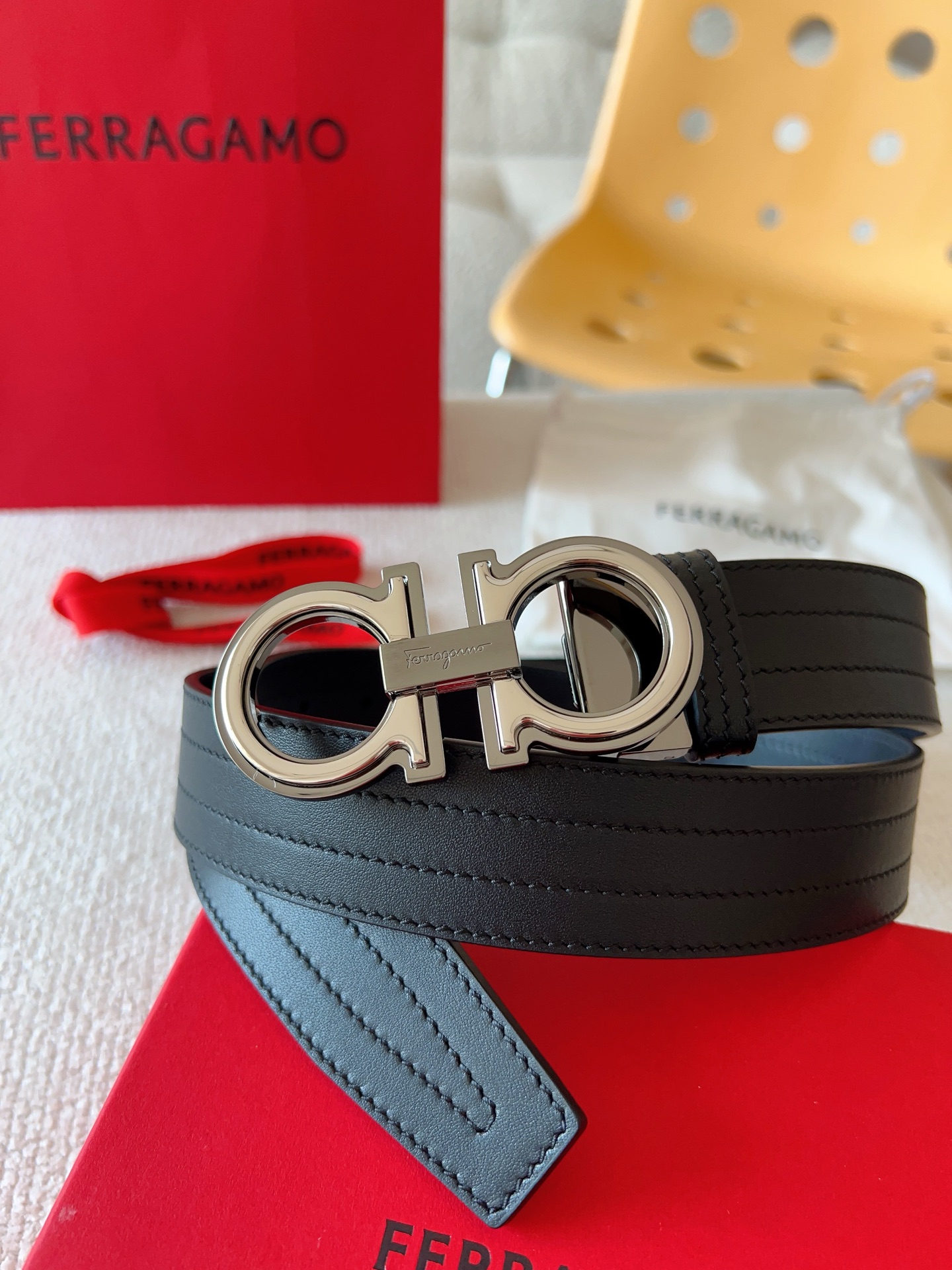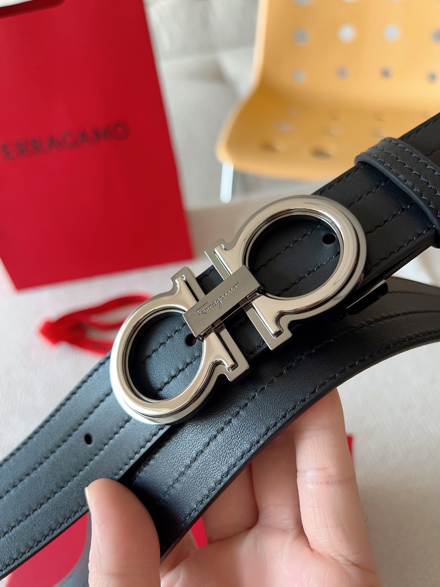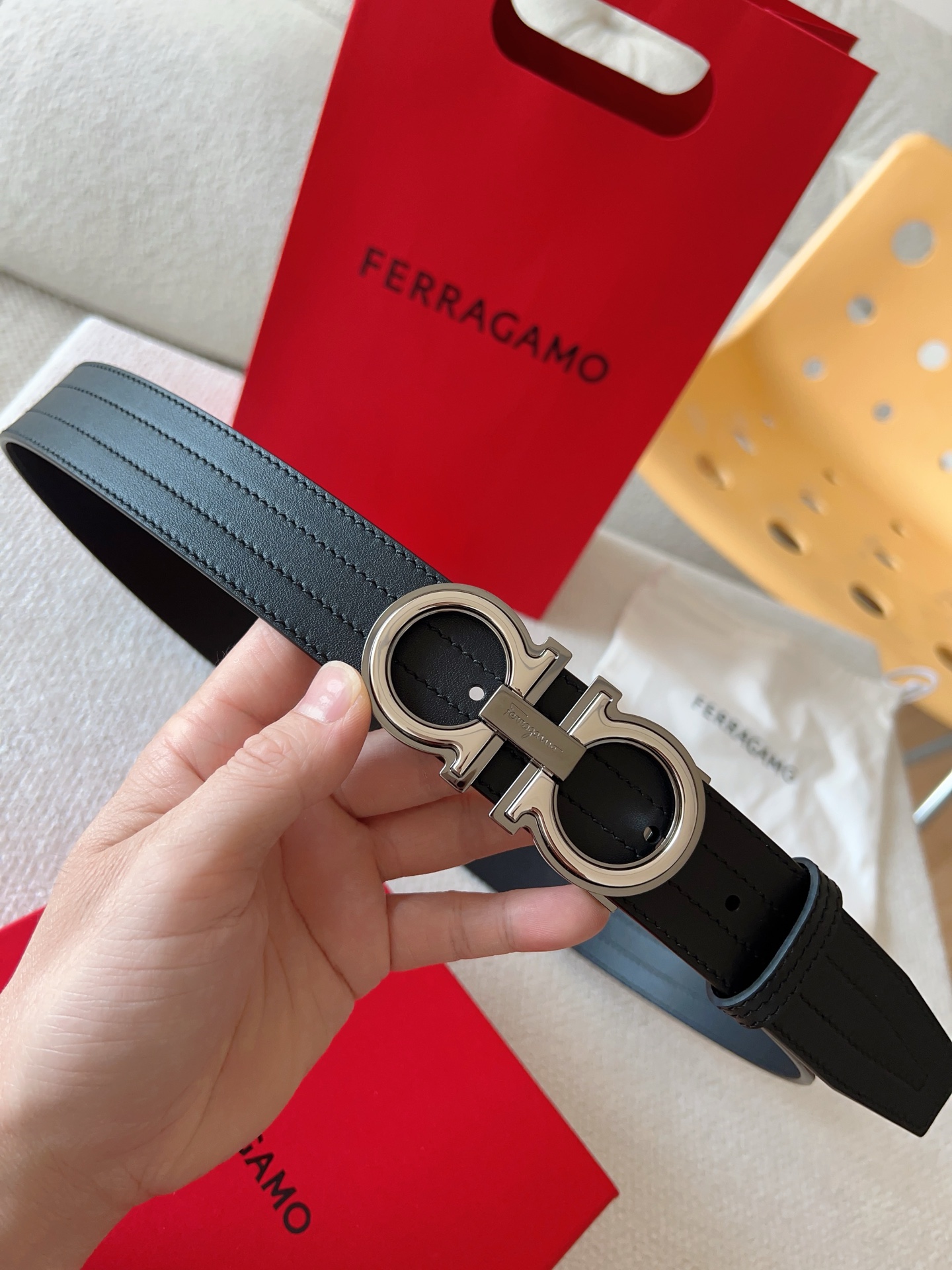 New (Ferragamo) Ferragamo belt with Gancio buckle, eye-catching and outstanding. The buckle features a double-layer structure design, adding a touch of avant-garde modernity to the classic buckle design. The two-tone leather belt adds unique details, creating a modern and stylish look, with adjustable length. Width: 35mm