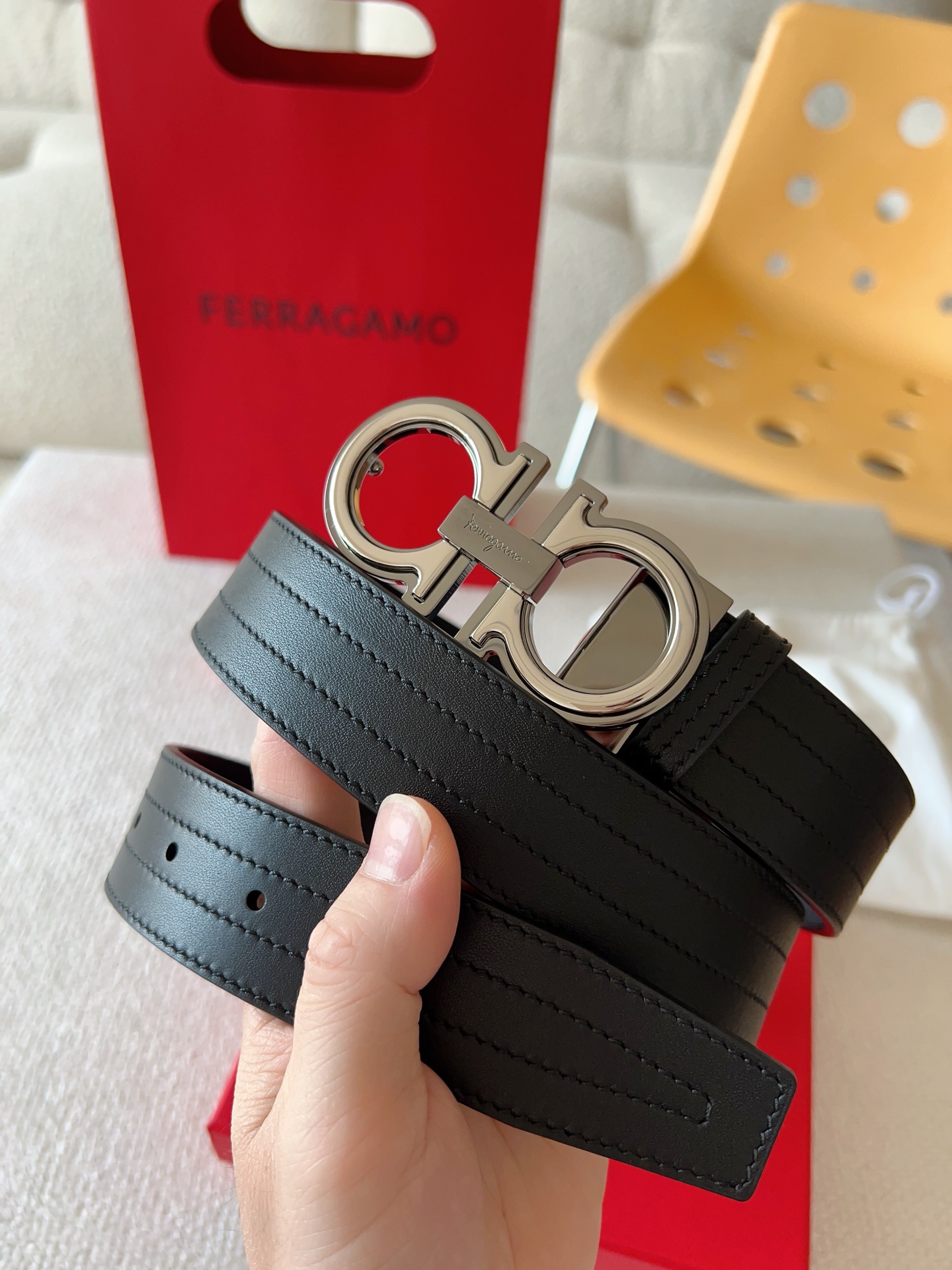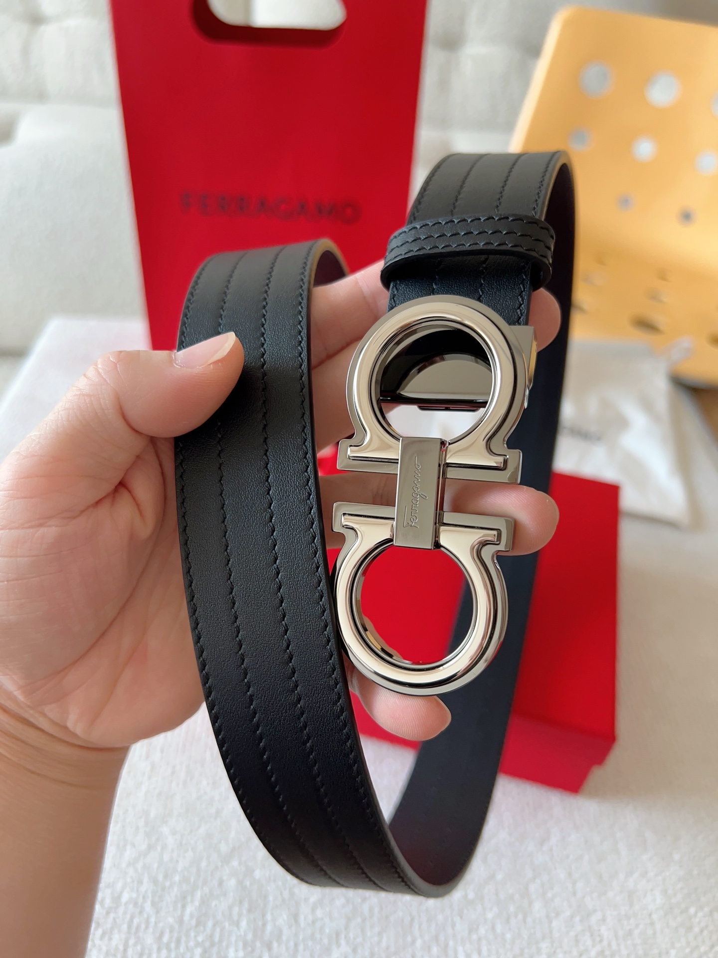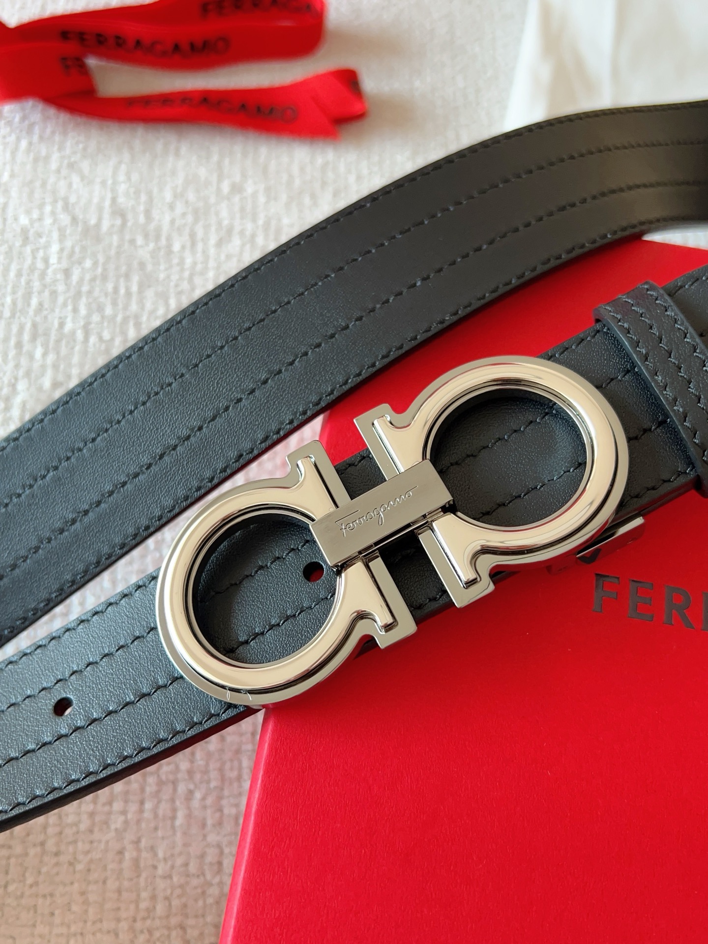 New (Ferragamo) Ferragamo belt with Gancio buckle, eye-catching and outstanding. The buckle features a double-layer structure design, adding a touch of avant-garde modernity to the classic buckle design. The two-tone leather belt adds unique details, creating a modern and stylish look, with adjustable length. Width: 35mm