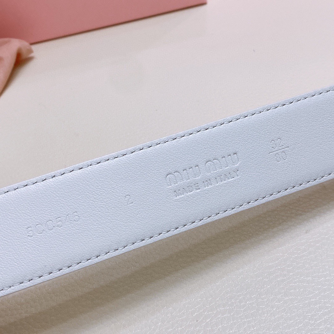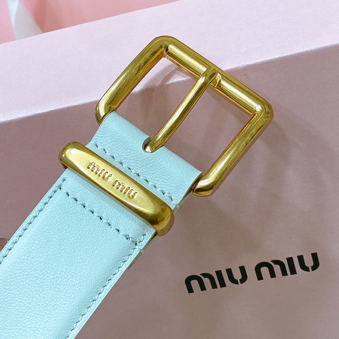 Miu Miu metal buckle. The belt loop is adorned with a laser-engraved logo. This leather belt features a simple and elegant design, with the belt loop accompanied by the Miu Miu logo. Imported cowhide belt 3.5cm