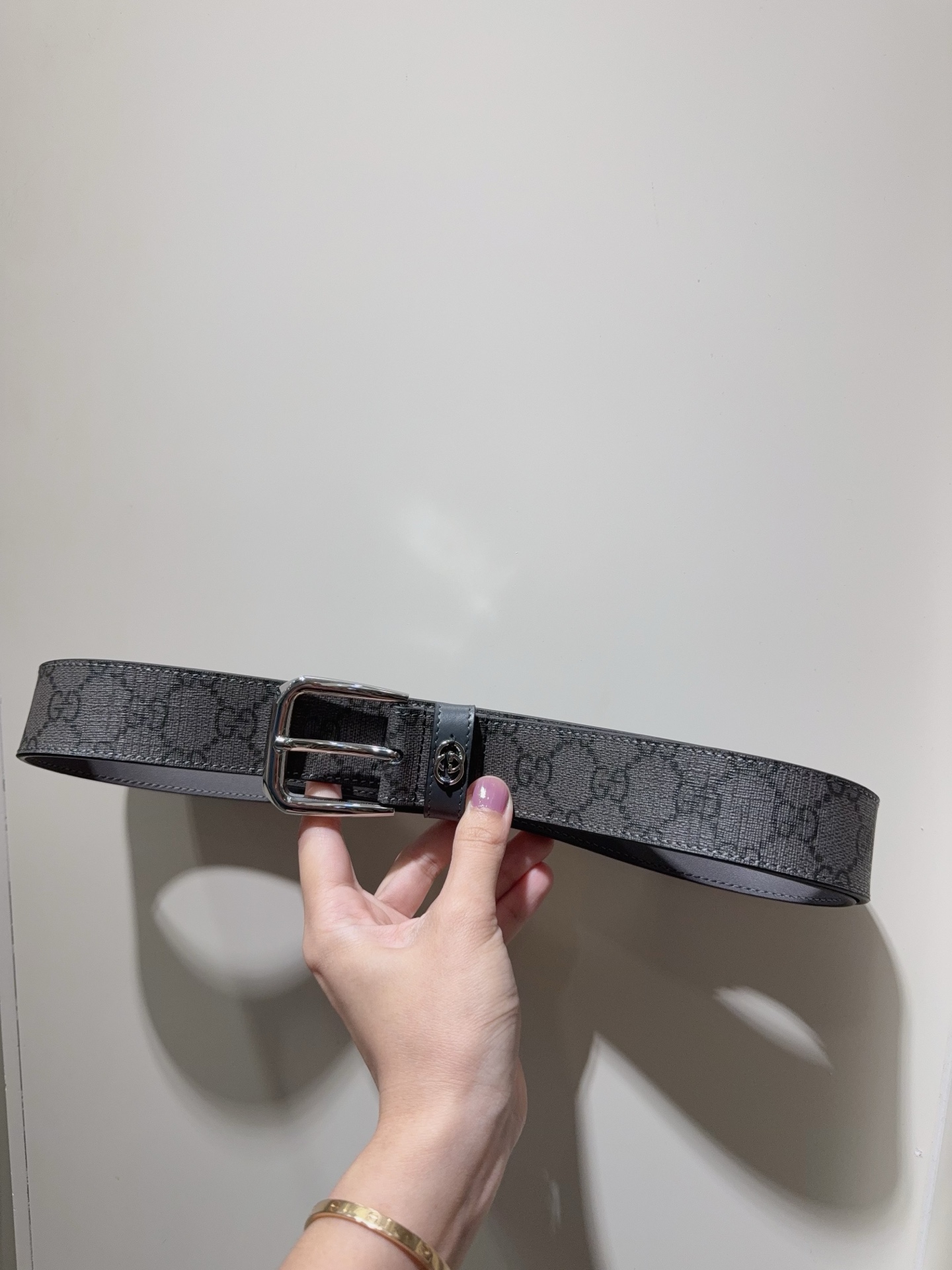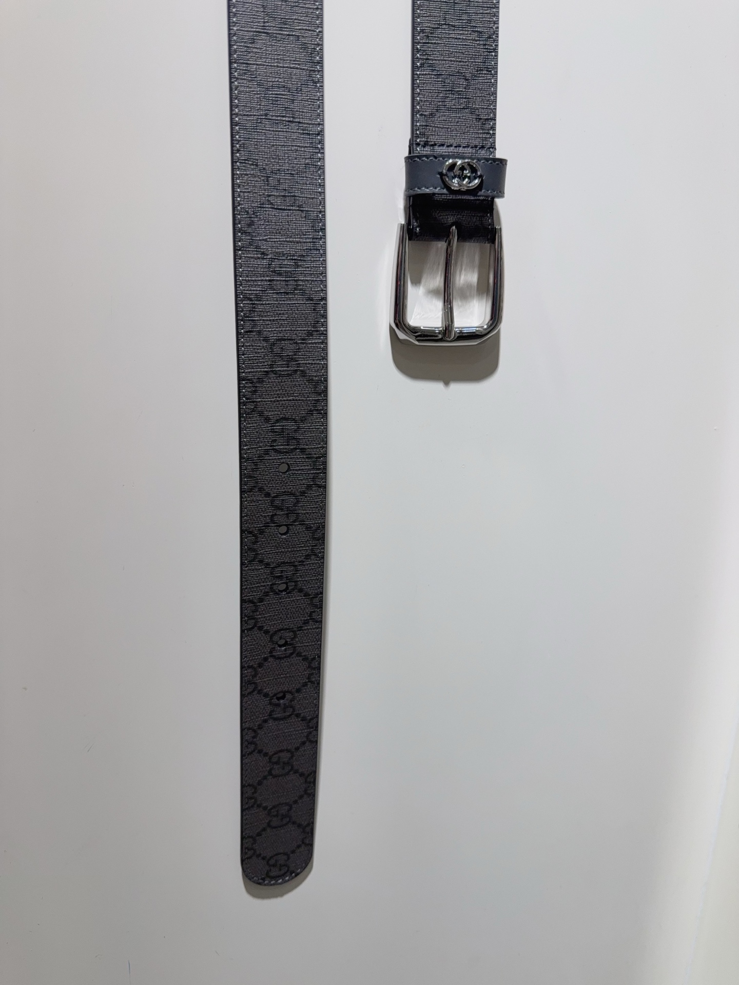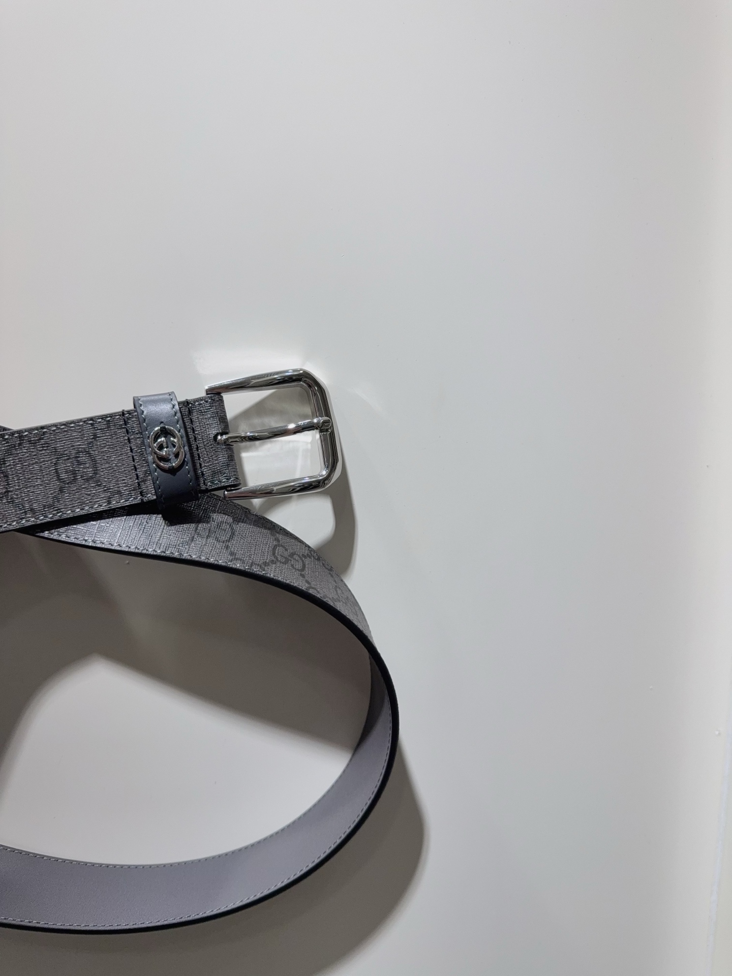 Belt with interlocking double G details GG Supreme canvas is reinterpreted in novel ways each season. This season, this iconic material infuses the brand's essence into this classic men's belt featuring a dark GG monogram pattern. The interlocking double G details add signature meaning to the overall design.