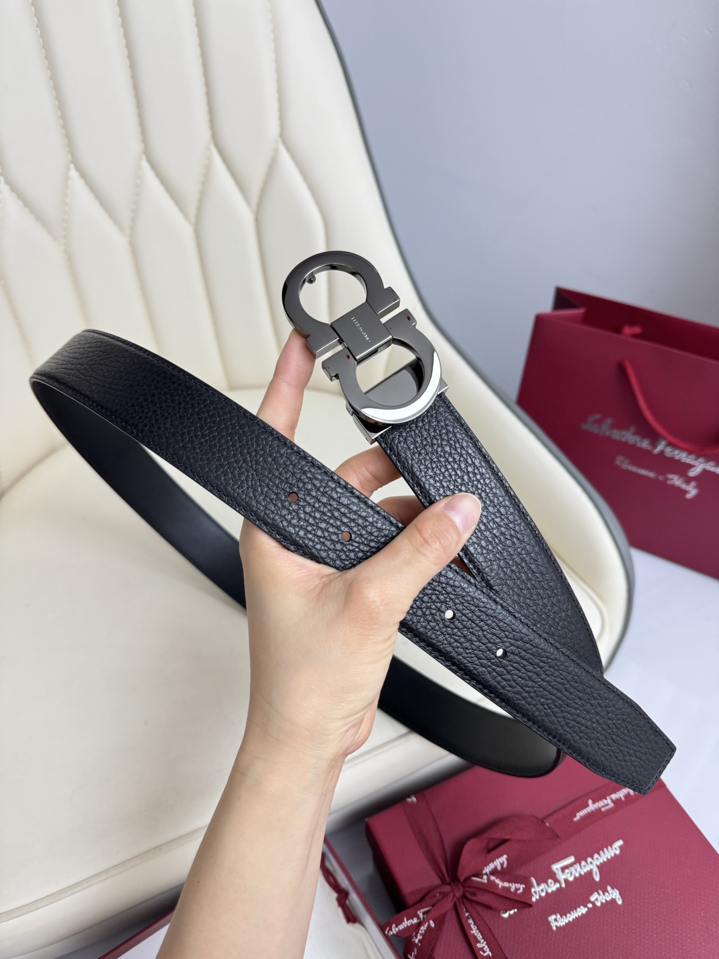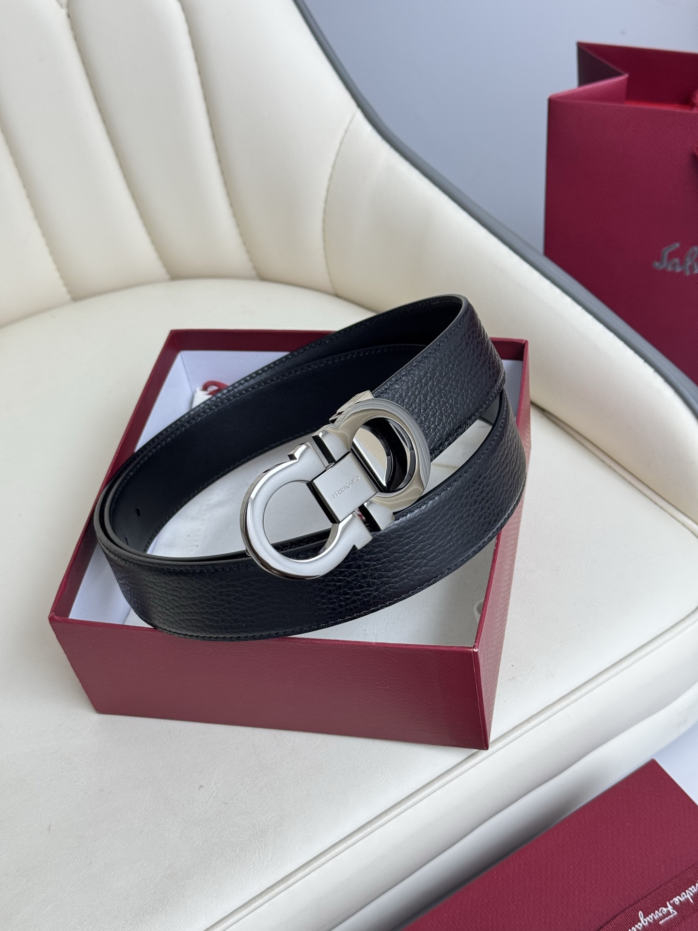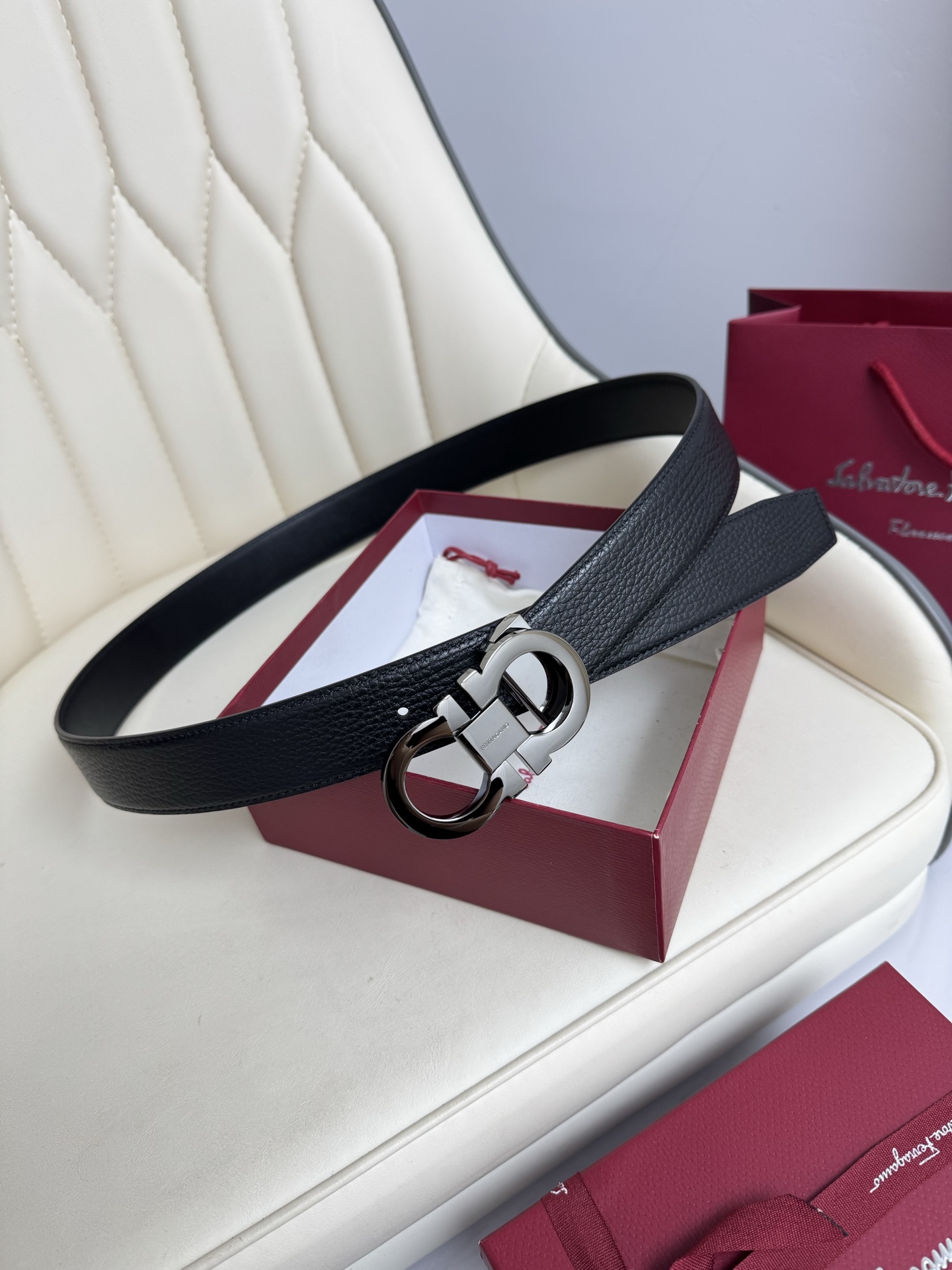 Home • Belt • Ferragamo double-sided genuine leather belt with vacuum electroplated brass buckle, 3.5cm width.