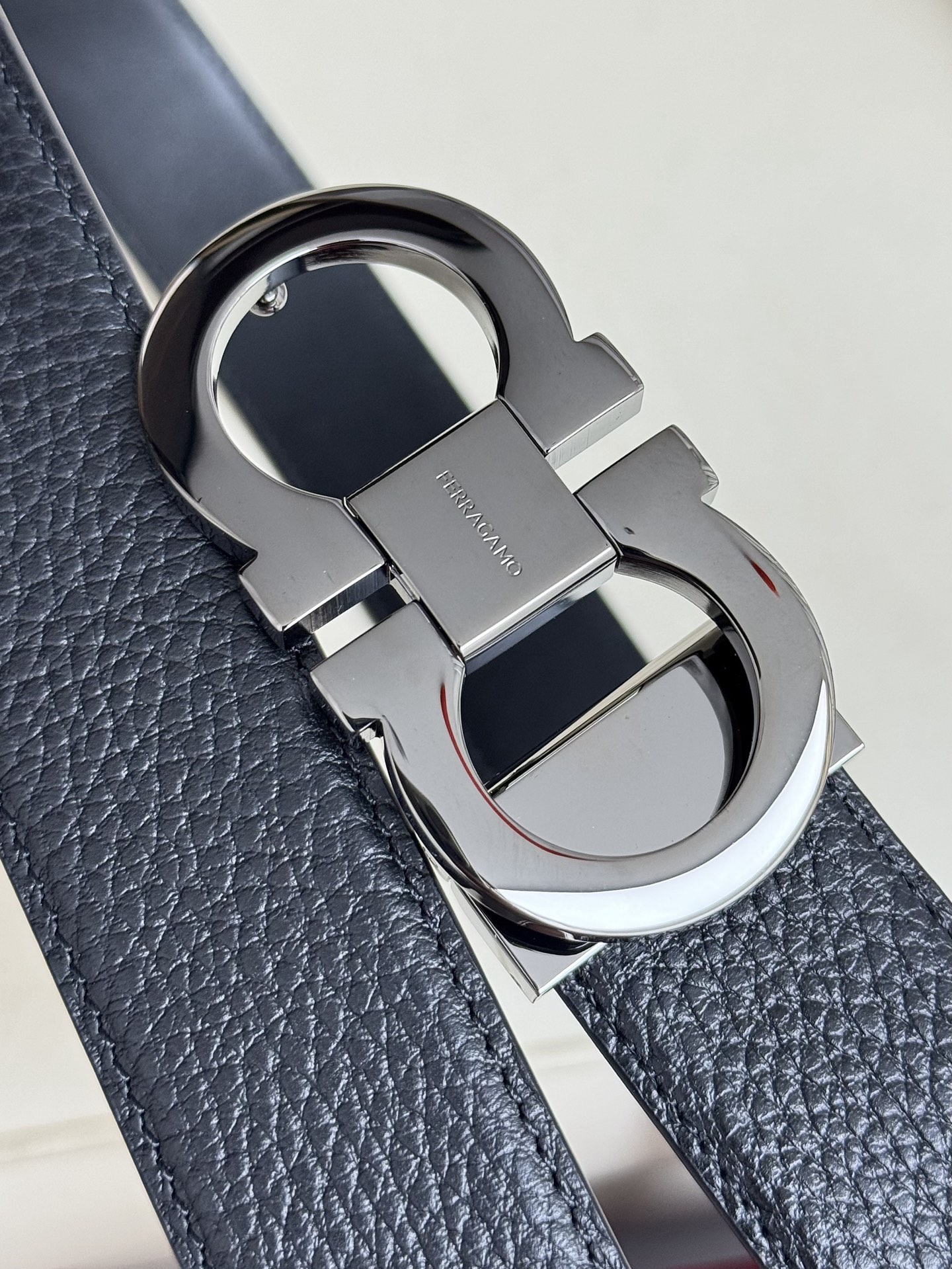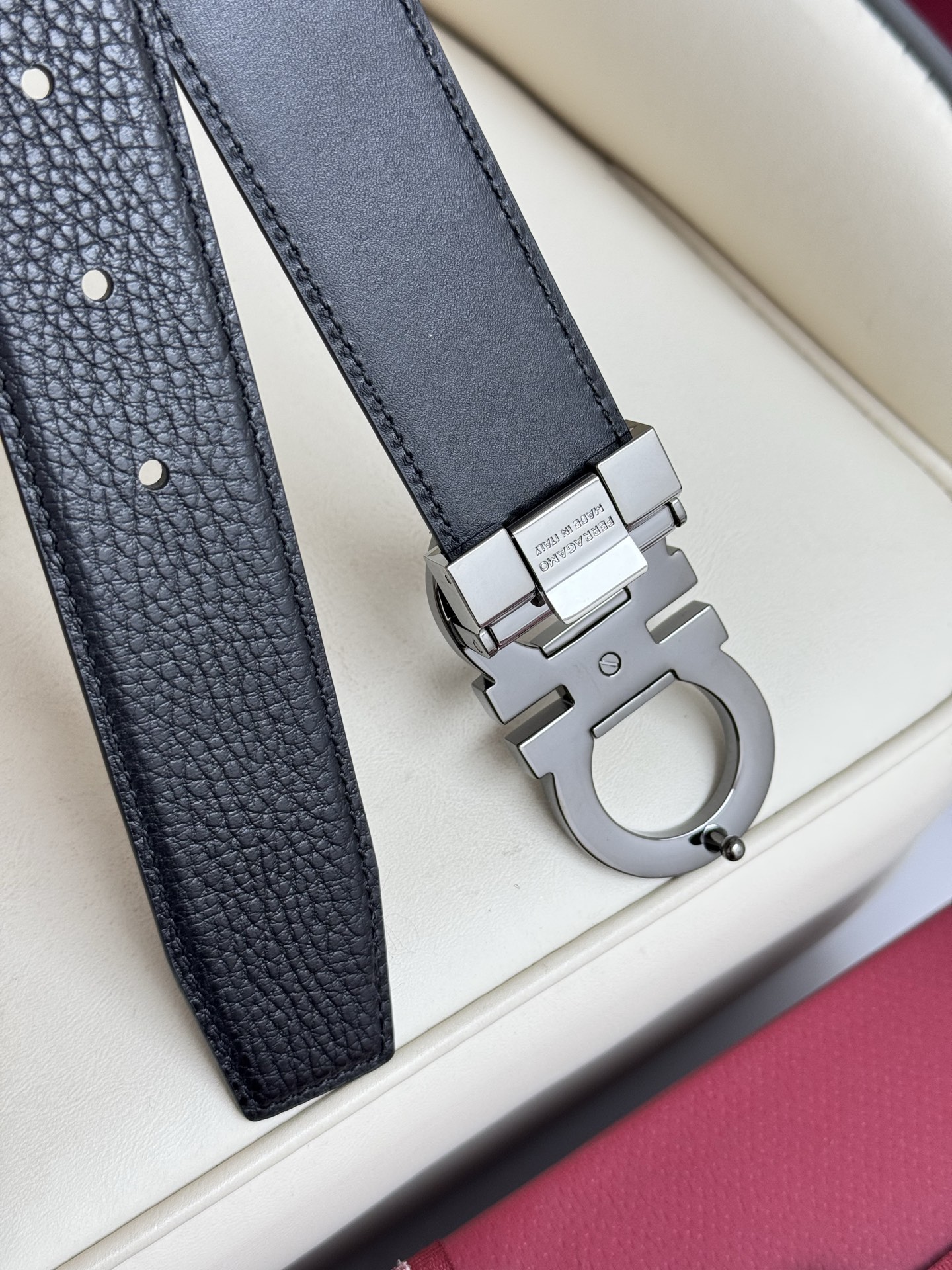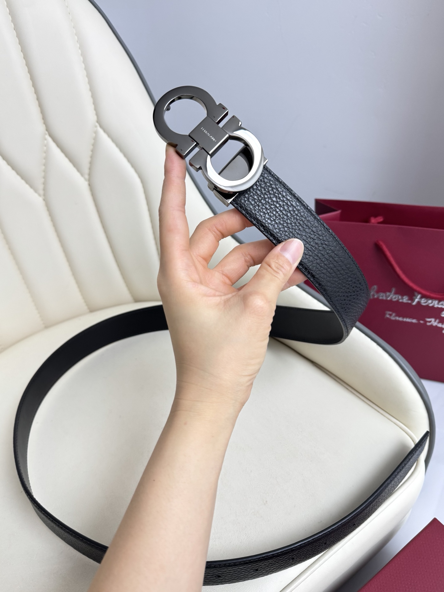 Home • Belt • Ferragamo double-sided genuine leather belt with vacuum electroplated brass buckle, 3.5cm width.