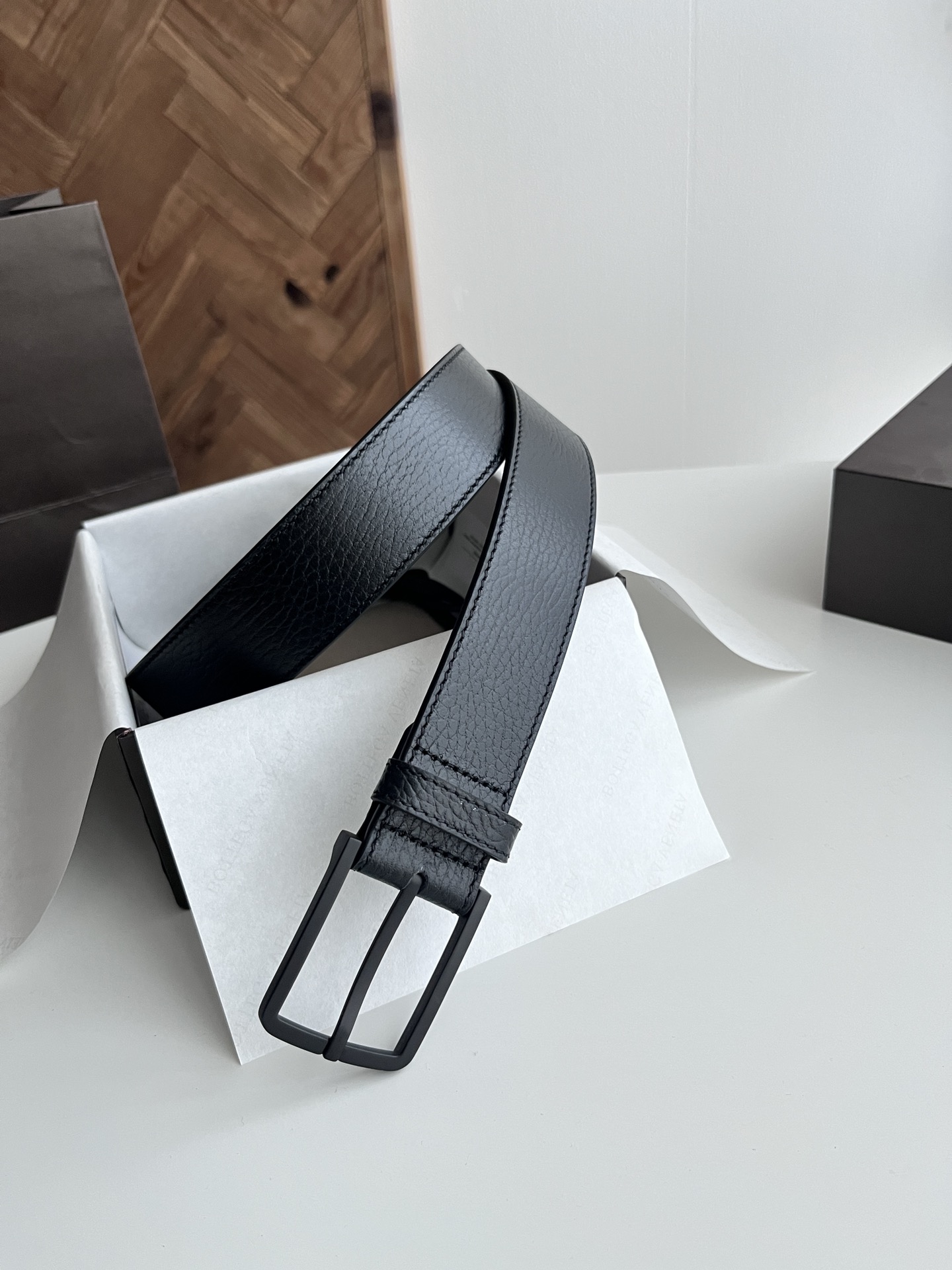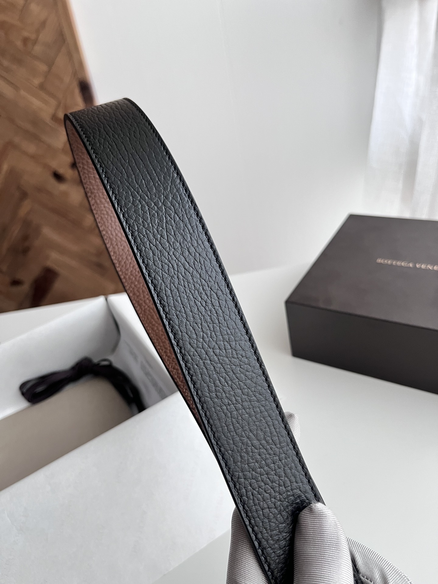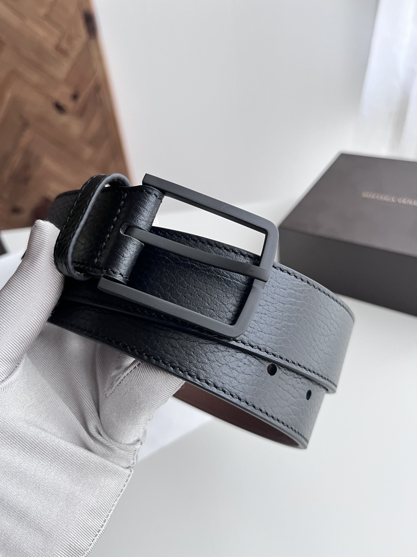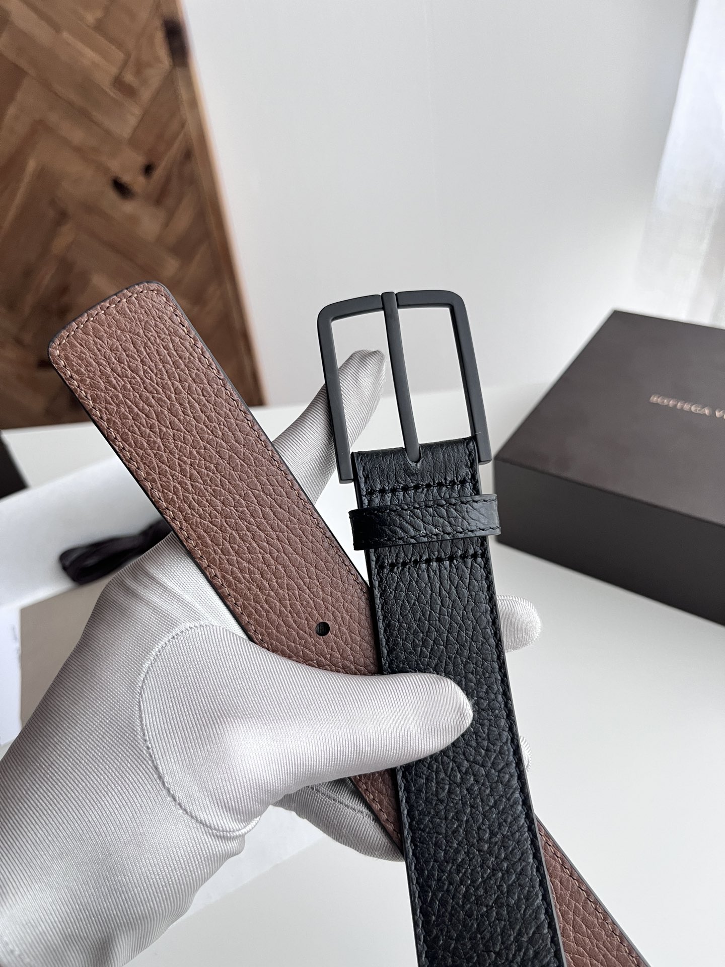 Bv 2024 latest men's flat belt double-sided Italian pebble grain calfskin with vacuum gunmetal pin buckle side with logo width 35MM color: black plus golden brown