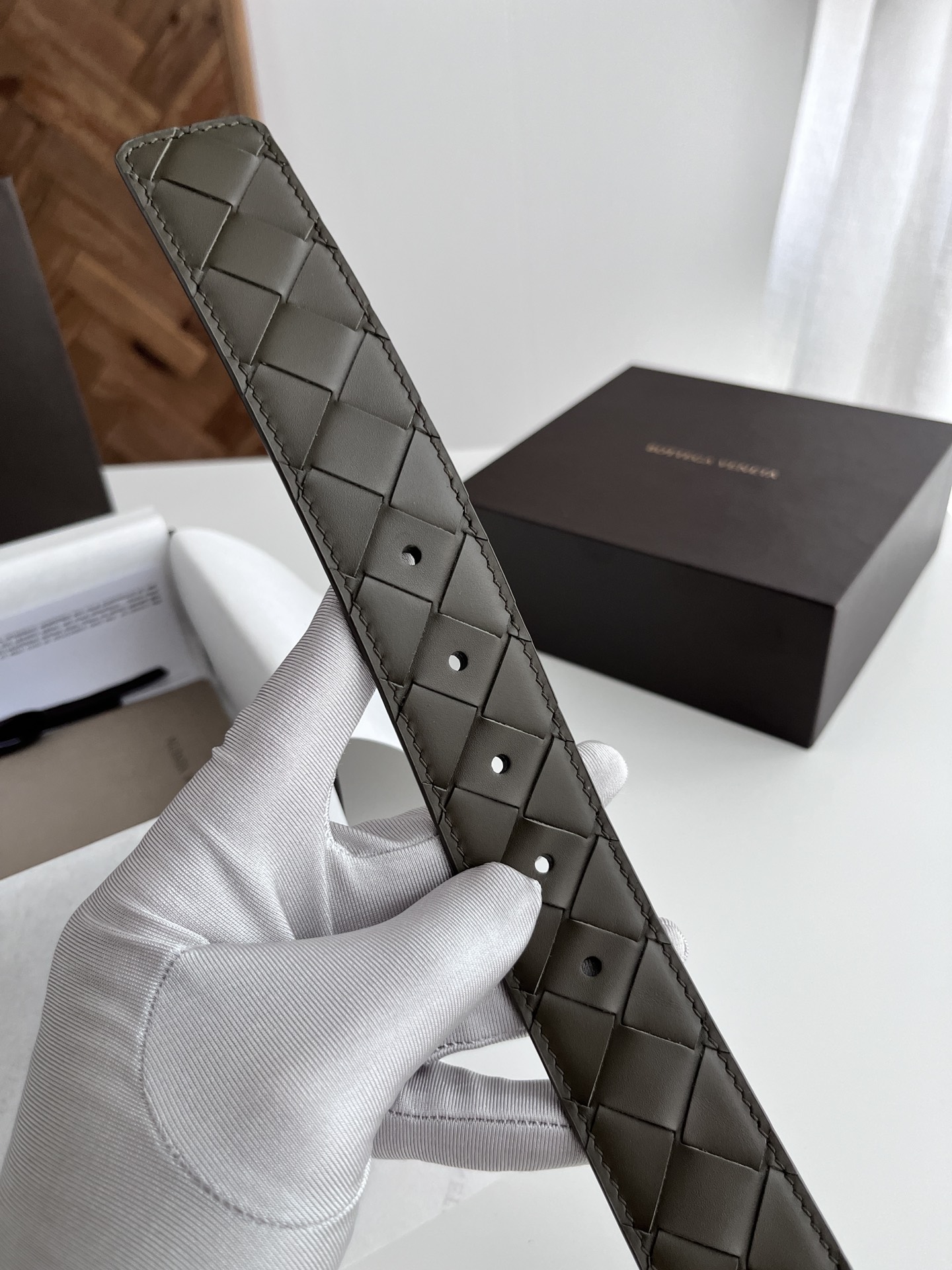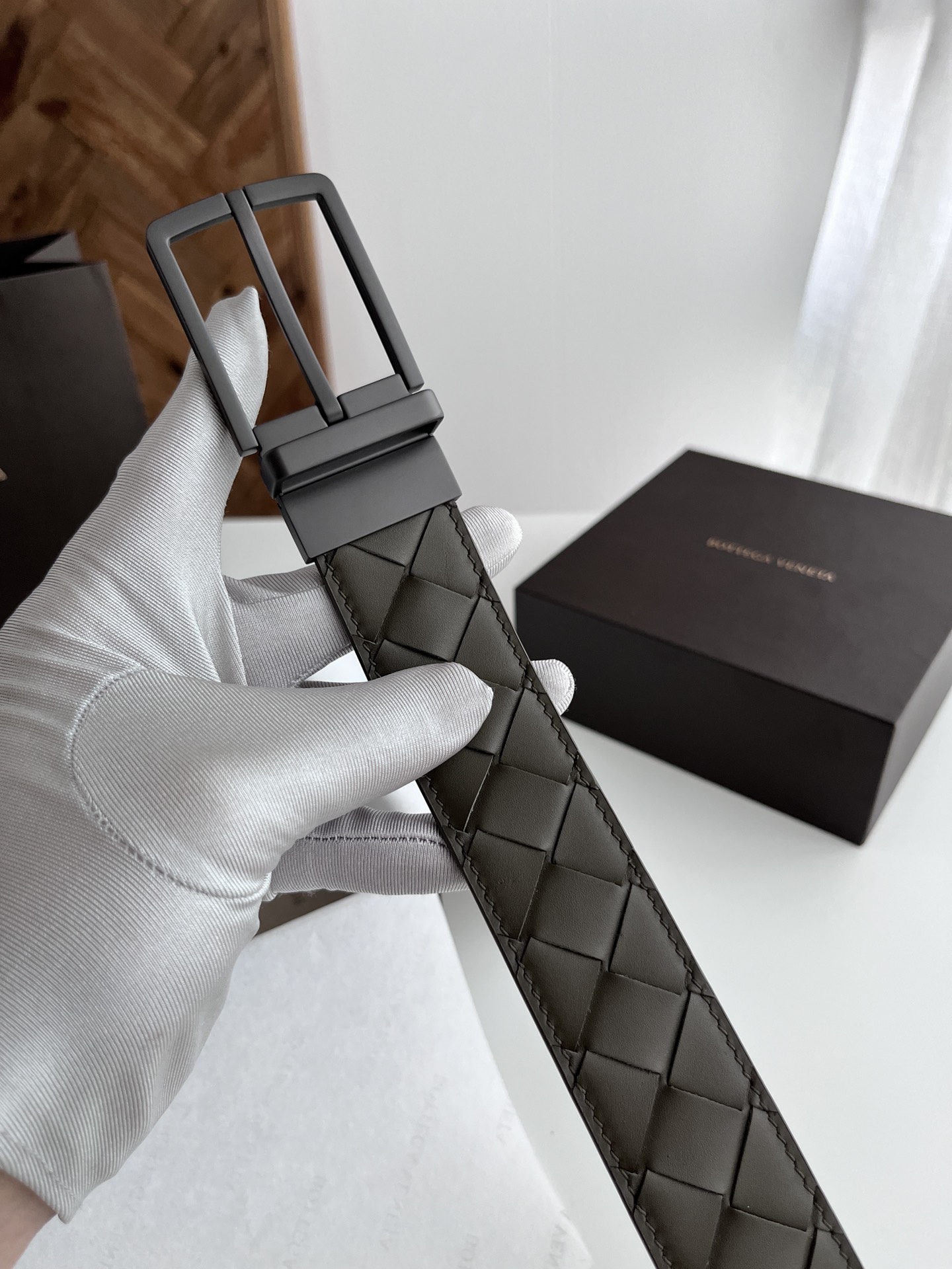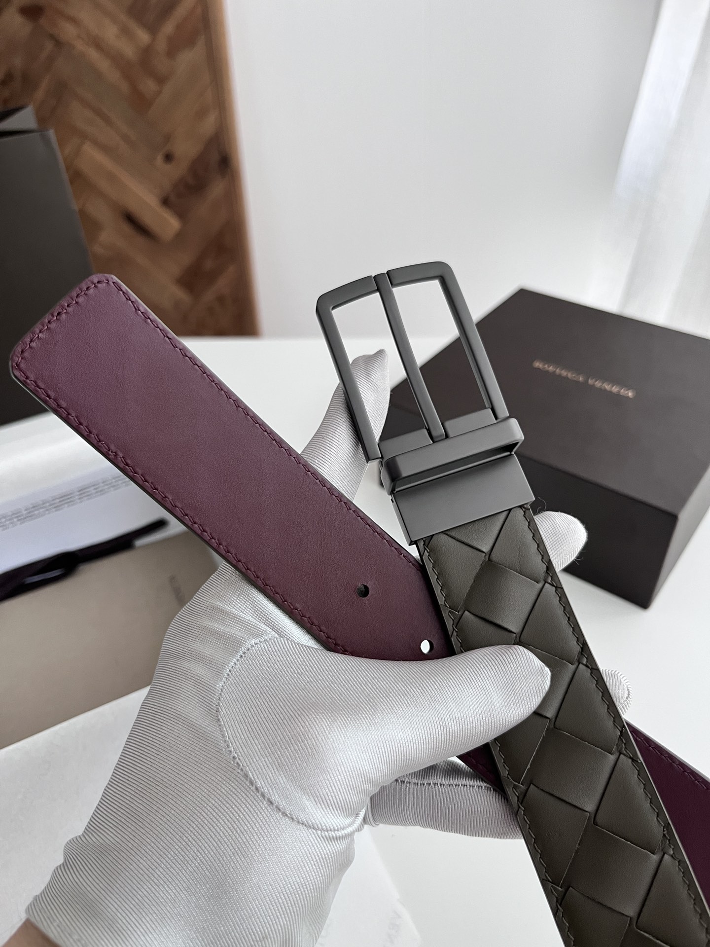 Bv latest men's woven belt double-sided use pure handmade intreccio large grid weaving double-sided Italian calfskin with vacuum gun color rotatable needle buckle width 35MM color: military green ➕ Barolo wine red