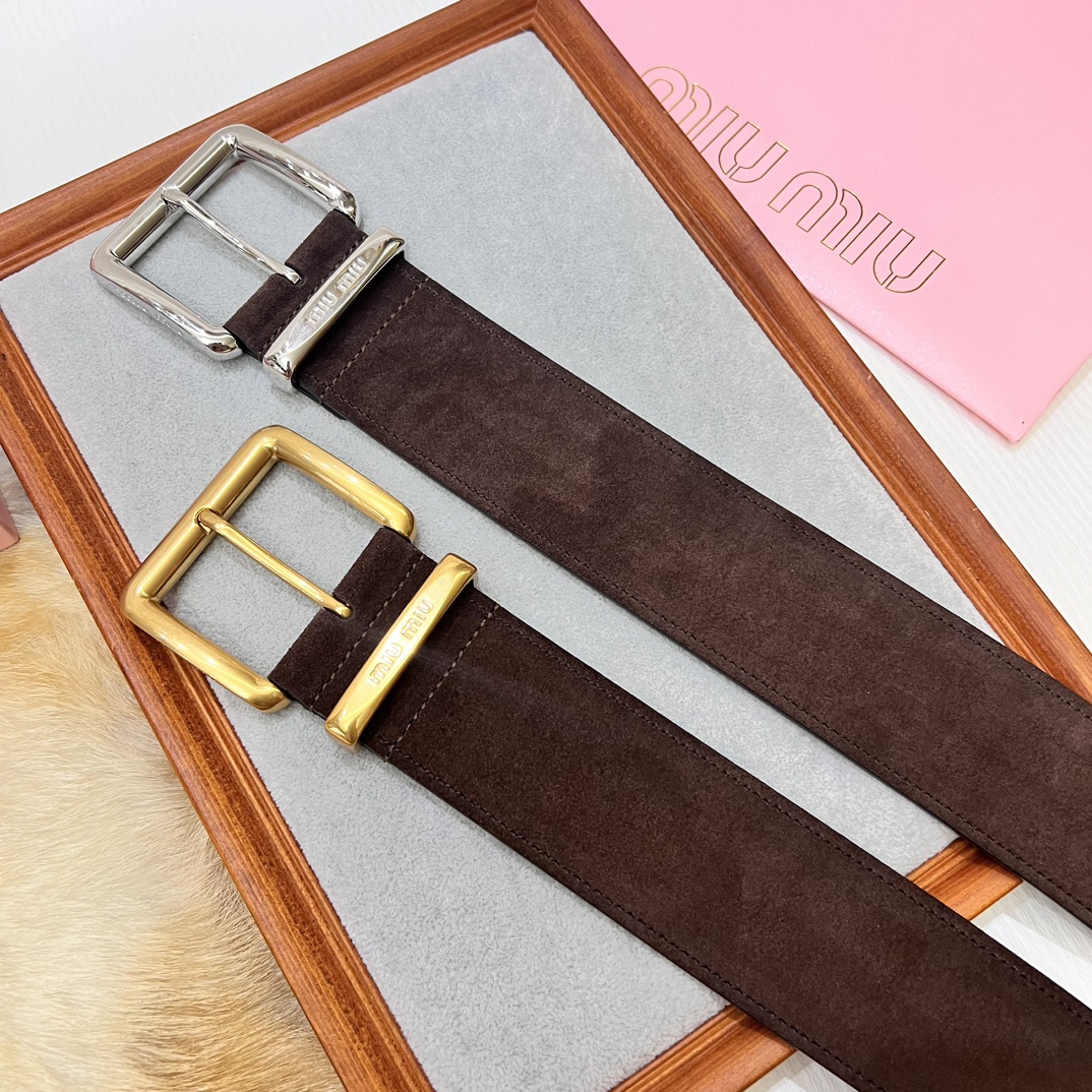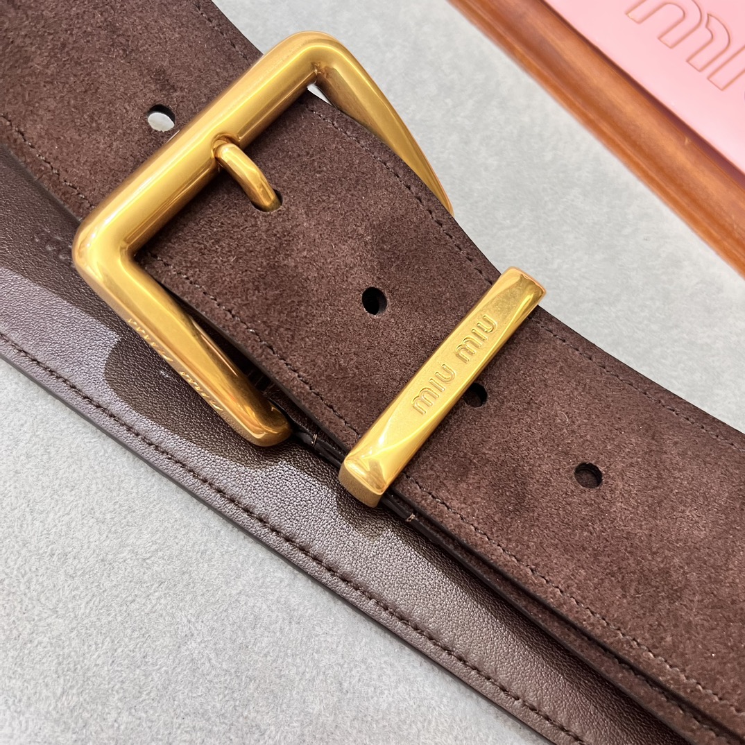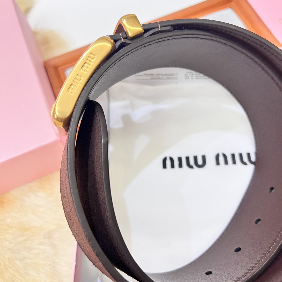 24 metal buckles. The belt loop is adorned with a laser-engraved logo. This leather belt features a simple and elegant design, with the accompanying loop bearing the Miu Miu logo. Imported cowhide belt 5.0cm.