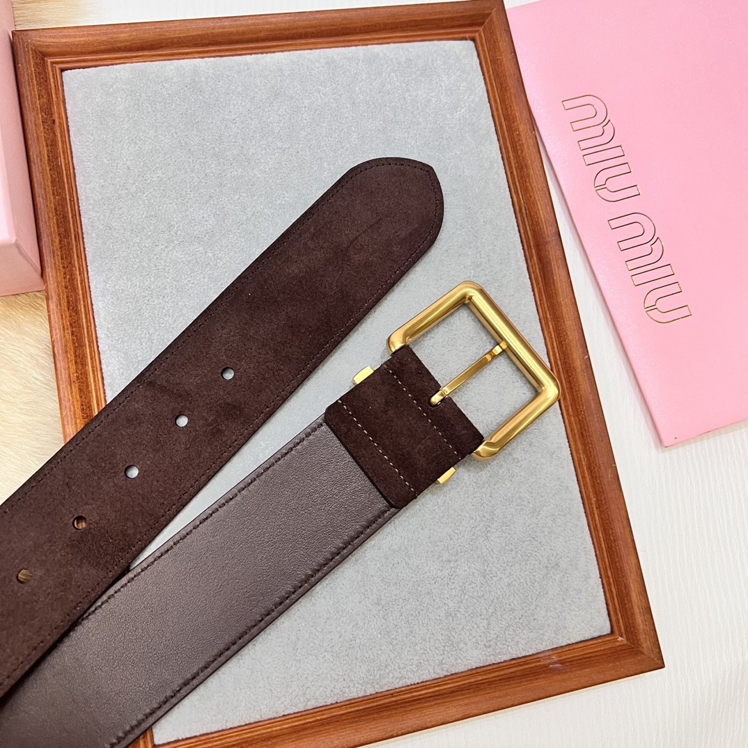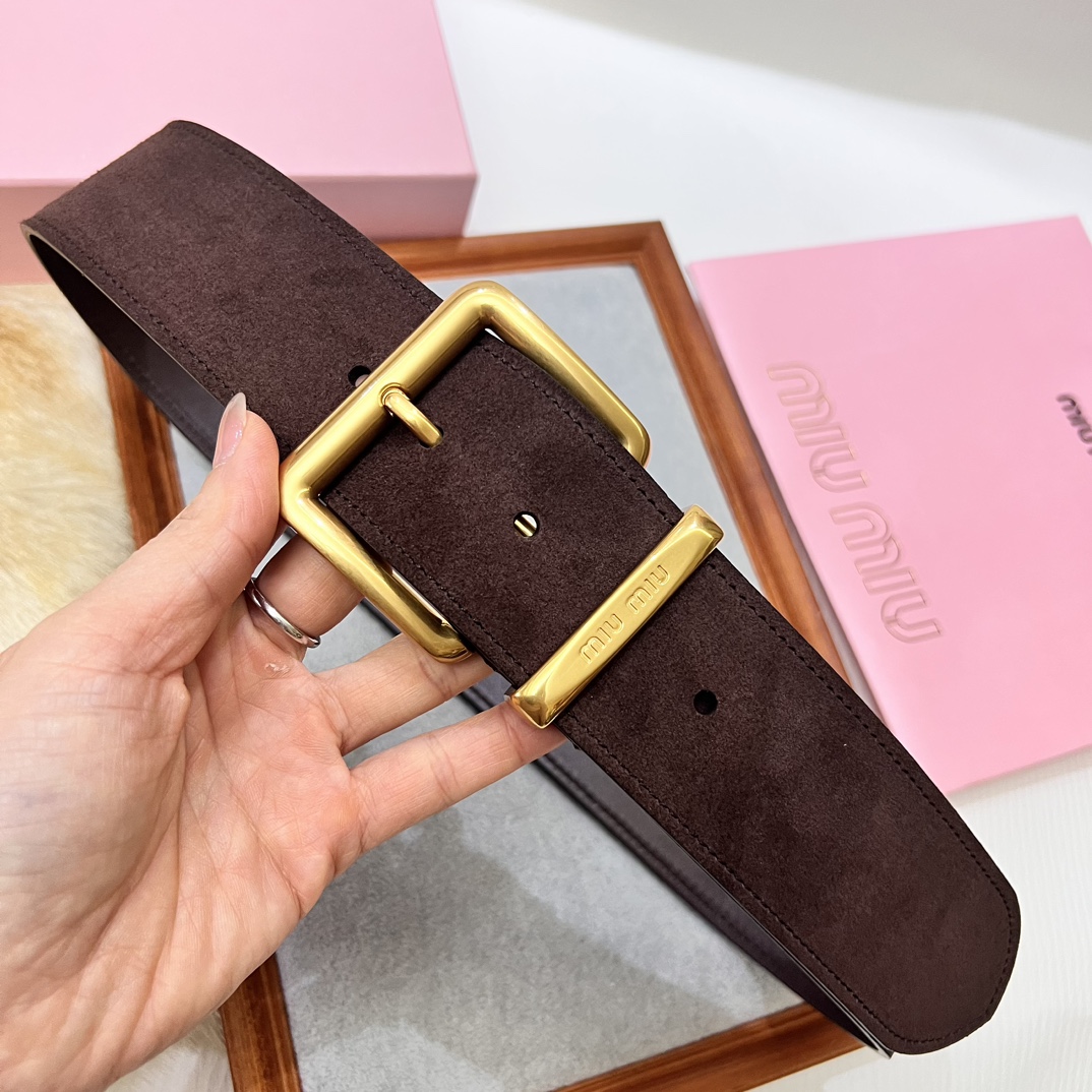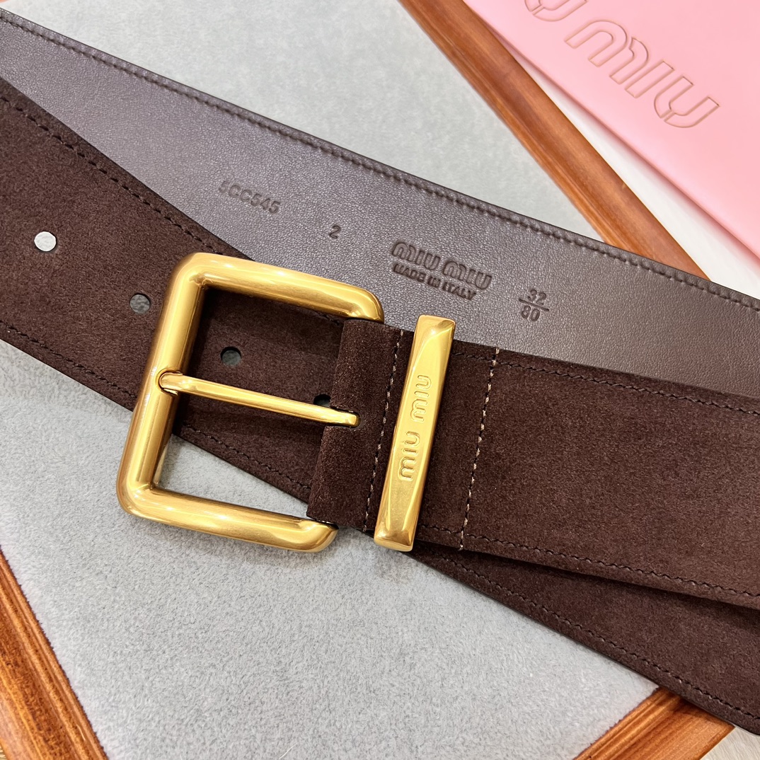 24 metal buckles. The belt loop is adorned with a laser-engraved logo. This leather belt features a simple and elegant design, with the accompanying loop bearing the Miu Miu logo. Imported cowhide belt 5.0cm.