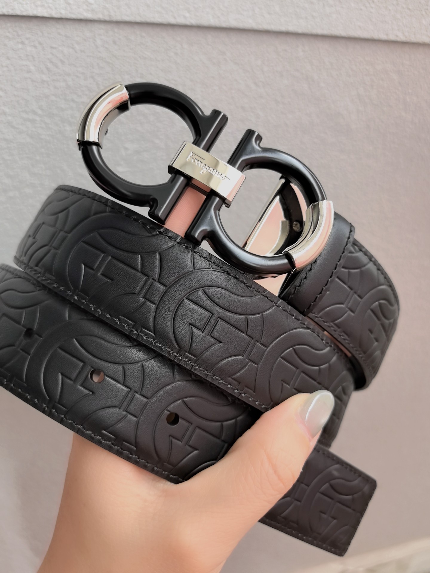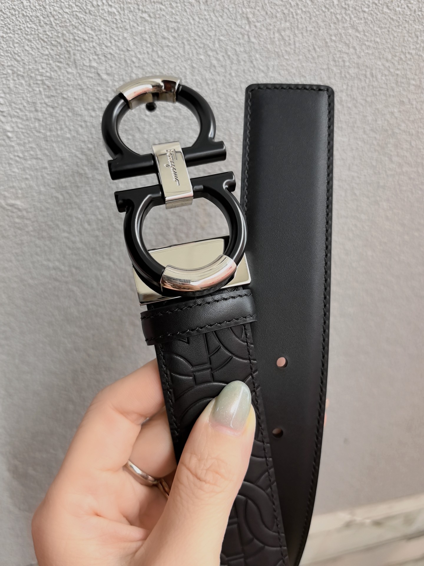 This belt features a double-sided design, with contrasting texture effects on both sides. One side is treated with wax immersion and natural tannin dyeing, resulting in a delicate and refined finish. The other side undergoes sanding and aniline dyeing, creating a luxurious and captivating texture. The painted buckle complements the Gancio silhouette, adorned with a central rectangular cutout pattern. The length is adjustable, allowing the belt to be trimmed to size or additional eyelets to be added.