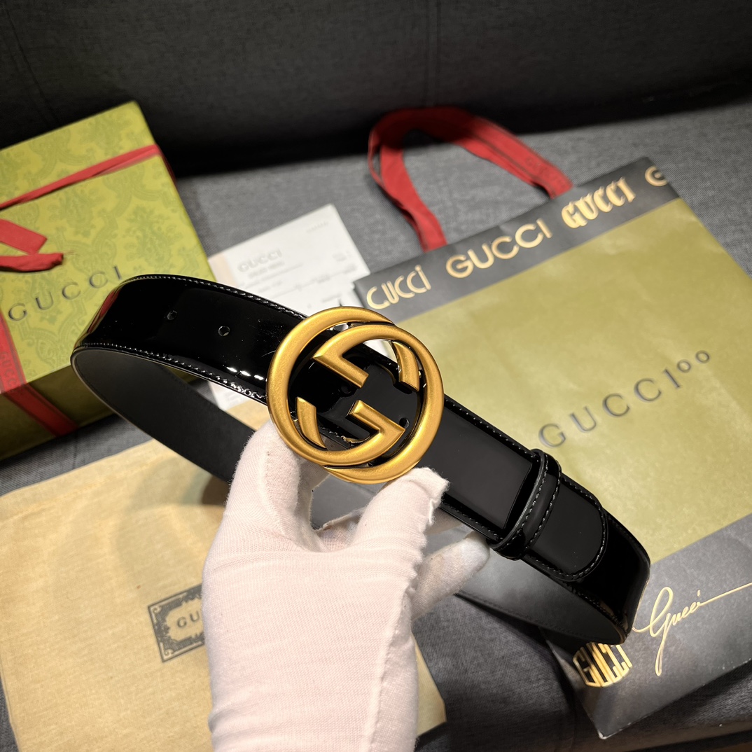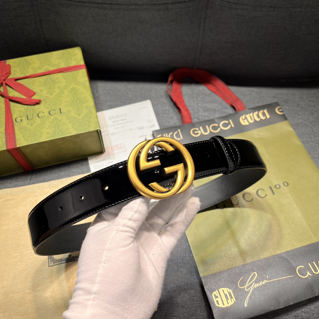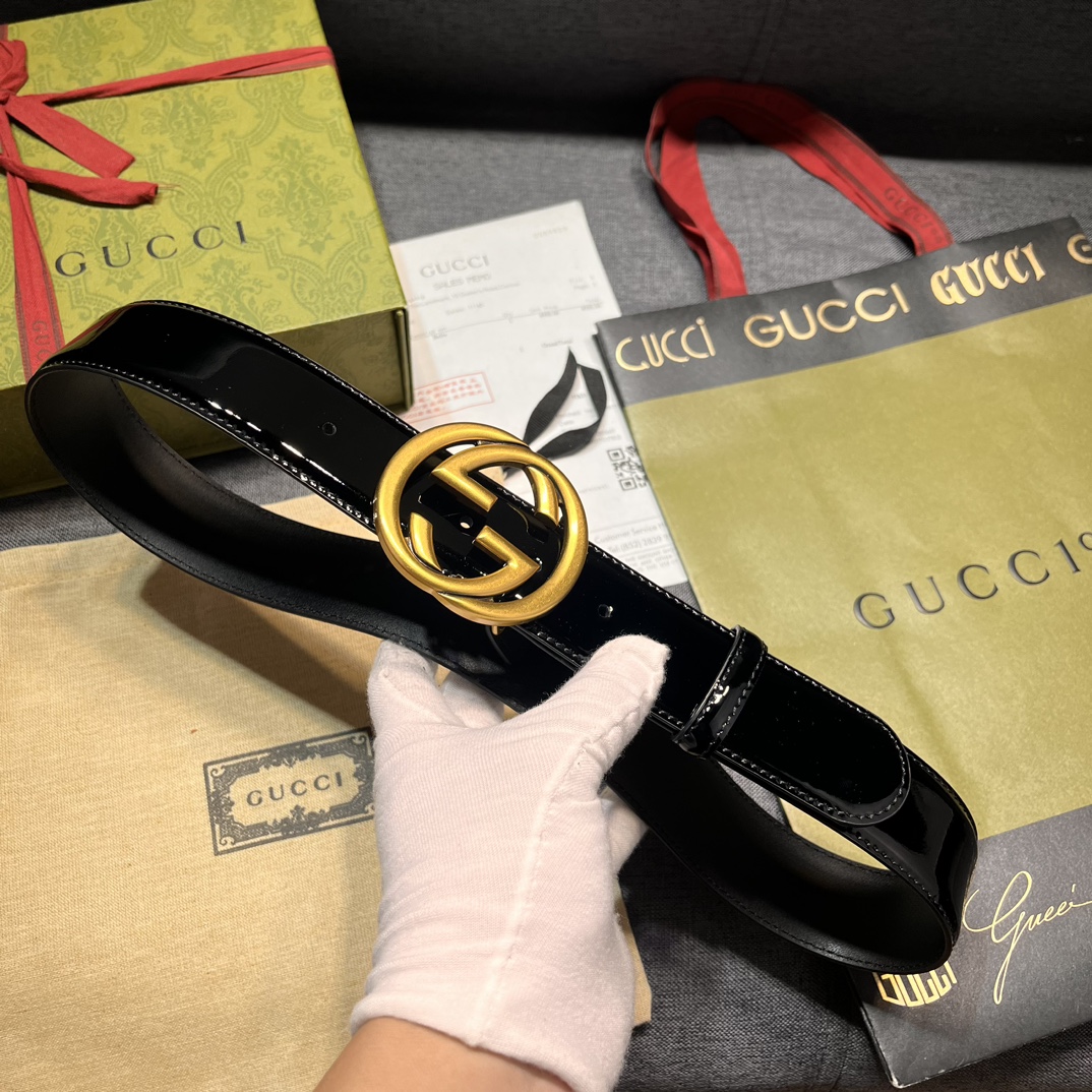 Gucci width 4.0cm new model classic details and modern elements add eye-catching highlights to Gucci's new series. Skillfully integrated with classic letter interlocking shape accessories, paying tribute to the brand founder Mr. Guccio Gucci. This belt is made of top-layer leather, meticulously decorated with GG belt buckle