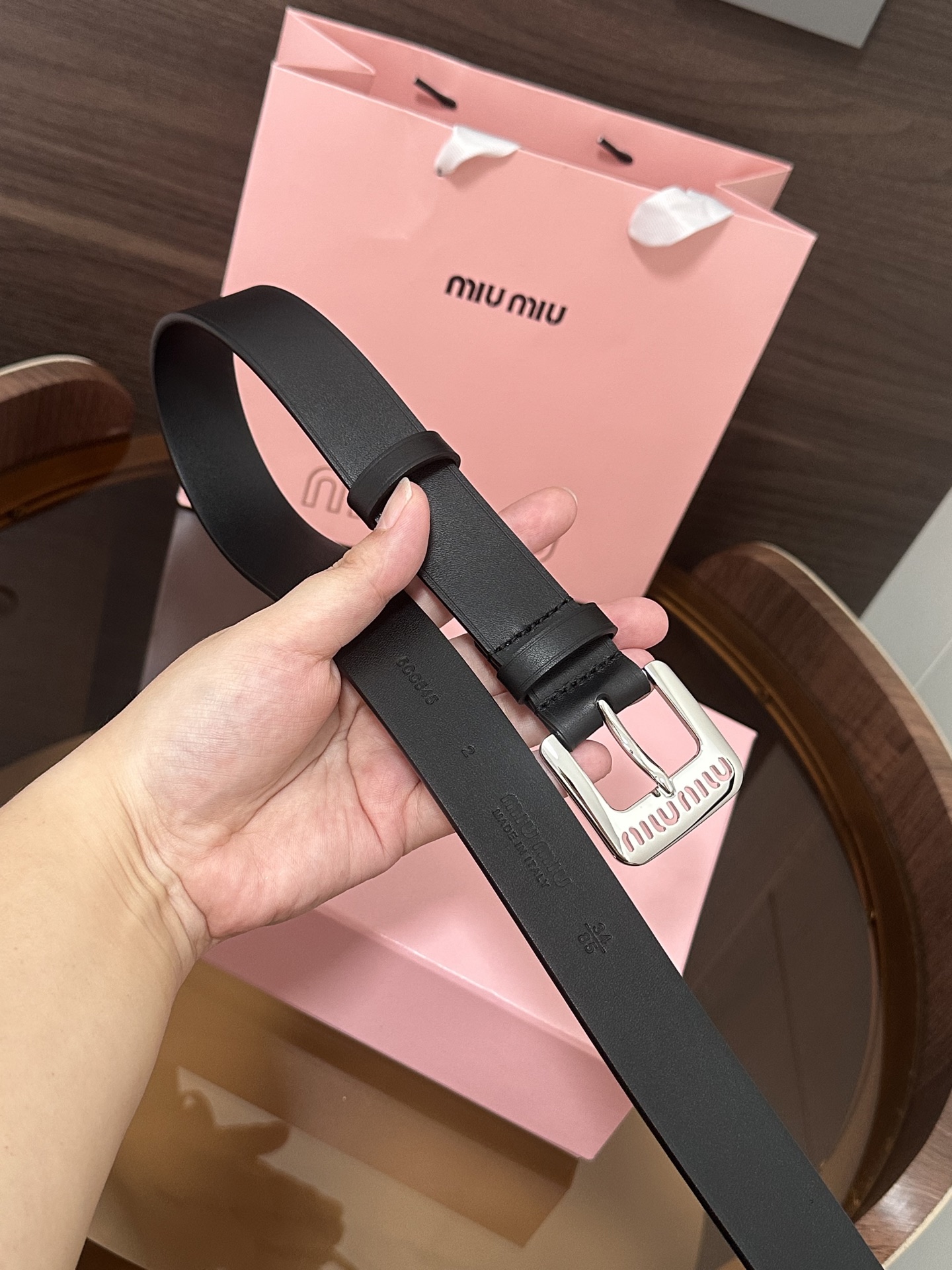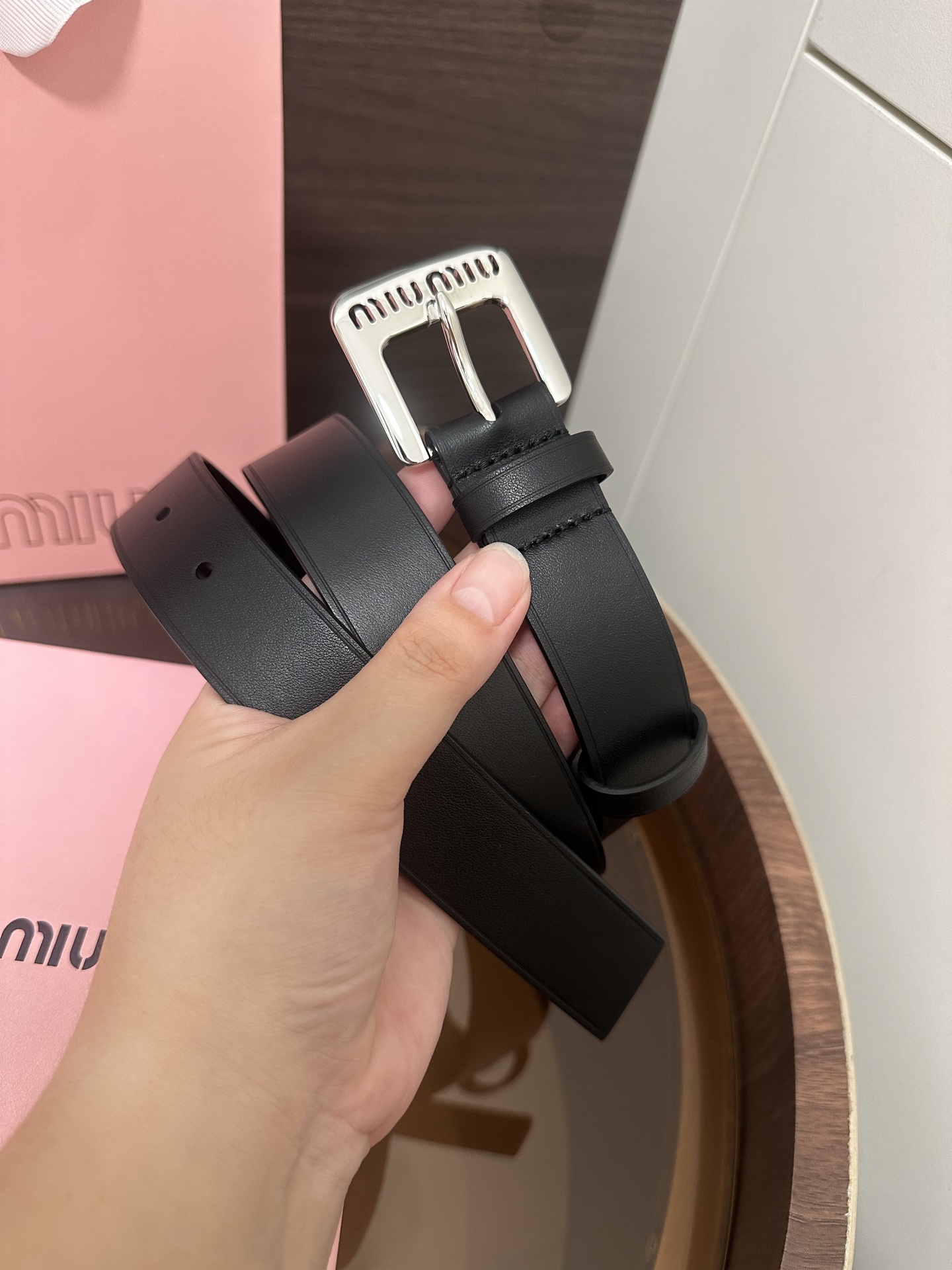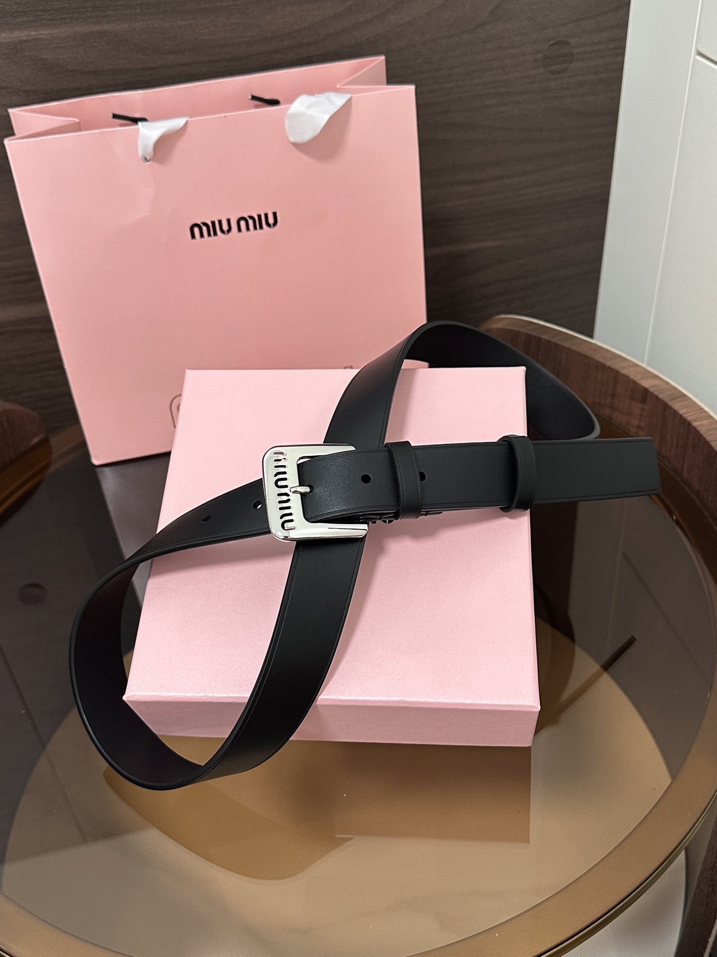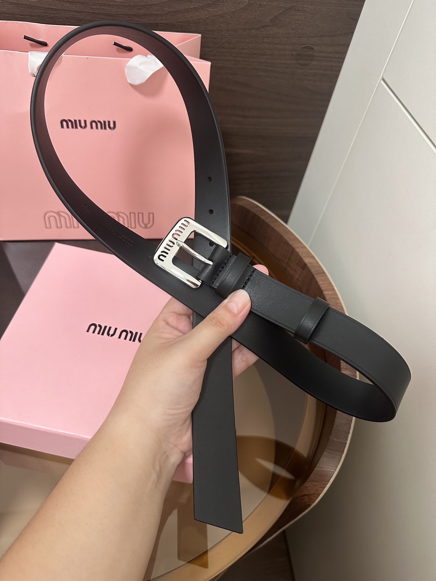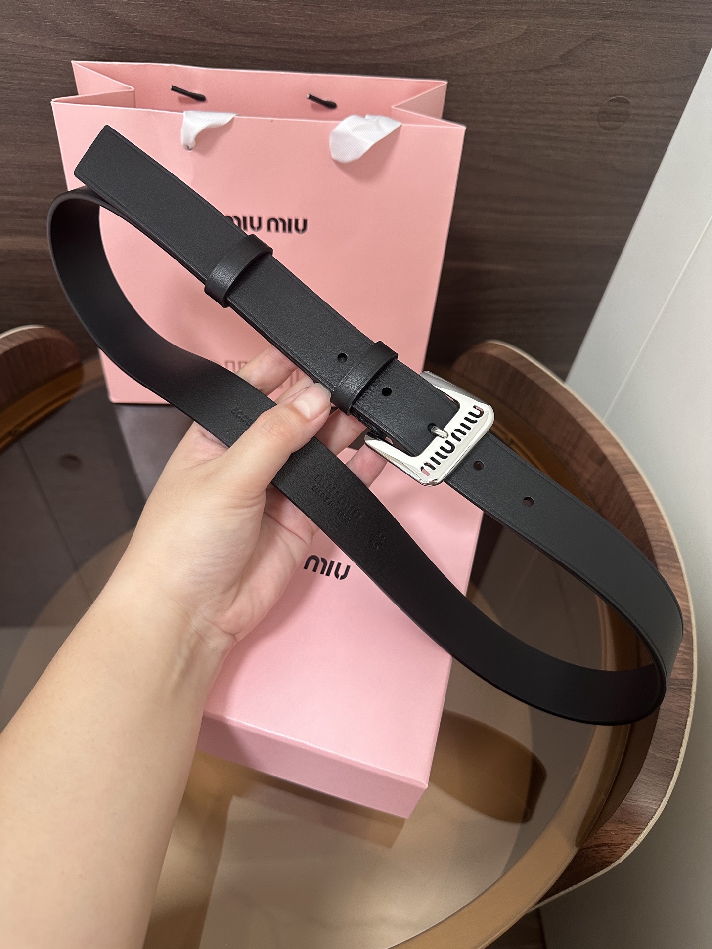 M1UMIU This leather belt is the ideal choice to enhance your chic style taste. The striking engraved metal logo paired with a square pin buckle feels soft and delicate to the touch, very fashionable and versatile. Width 3.0cm