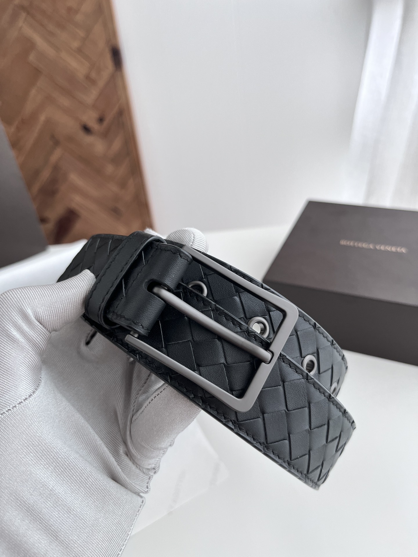 BV 2024 New Men's Belt, Fully Handcrafted Small Checkerboard Intrecciato Piccolo Woven Italian Calfskin, Paired with Vacuum Gunmetal Pin Buckle, Belt Width 3.5cm, Color: Black