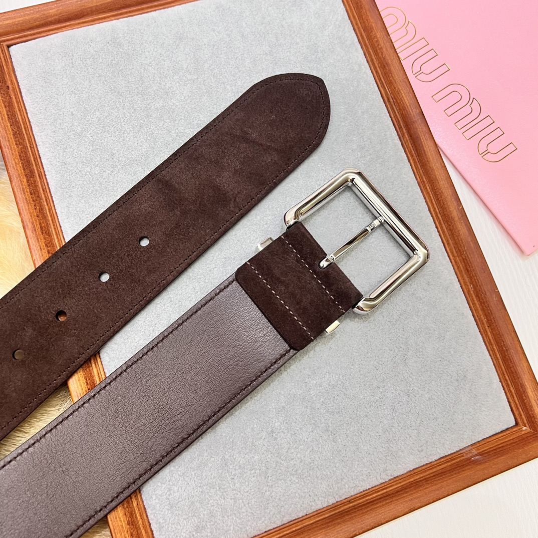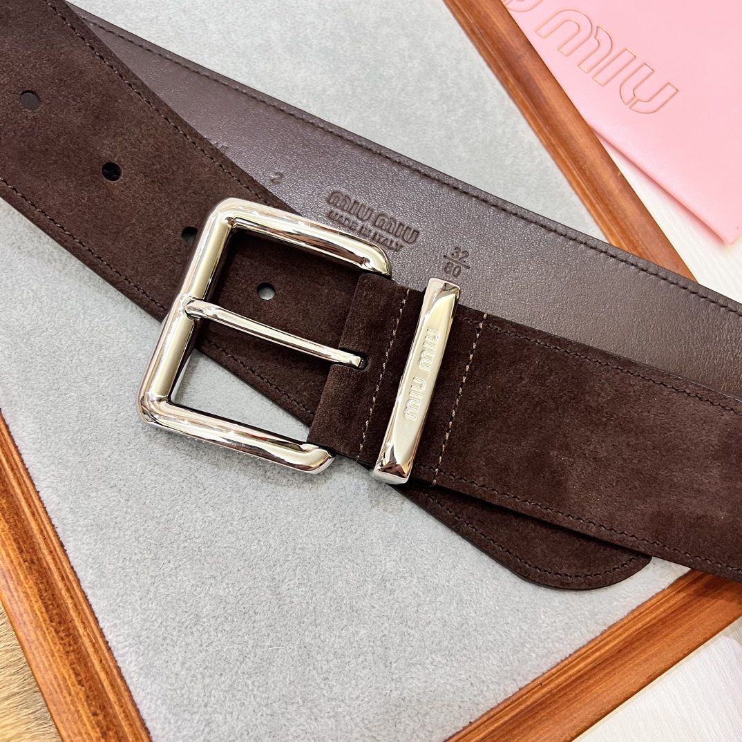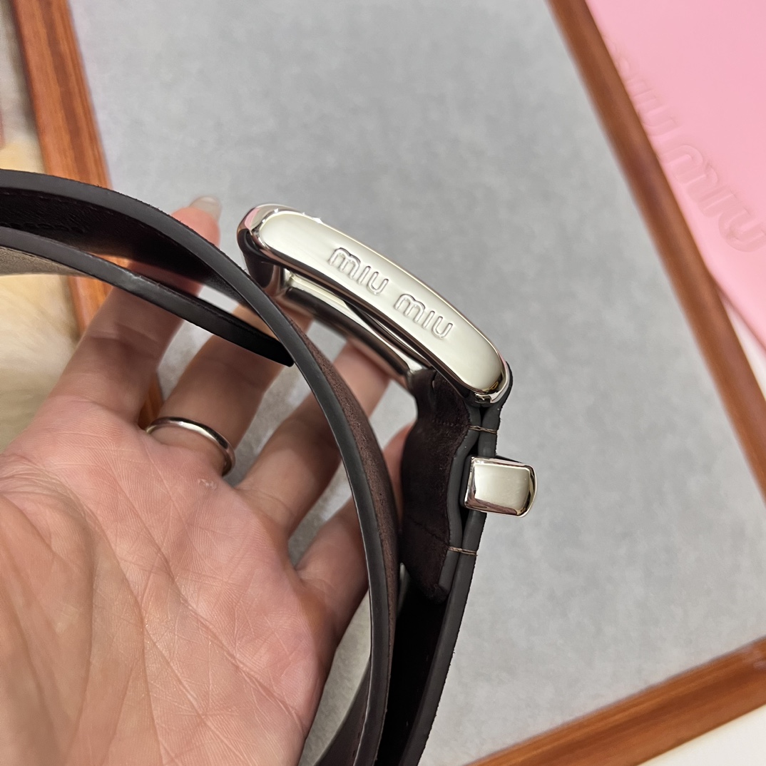 24 metal buckles. The belt loop is adorned with a laser-engraved logo. This leather belt features a simple and elegant design, with the belt loop bearing the Miu Miu logo. Imported cowhide belt 5.0cm.