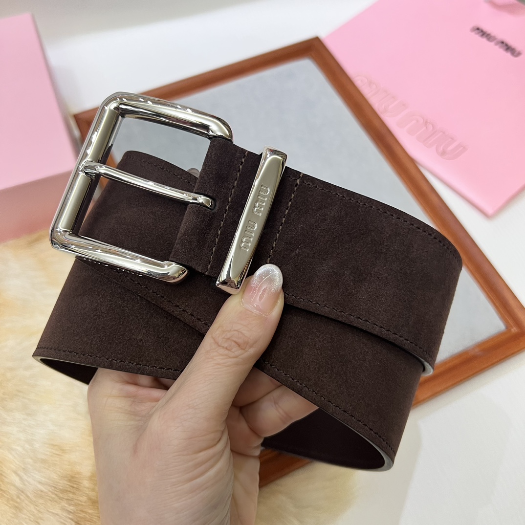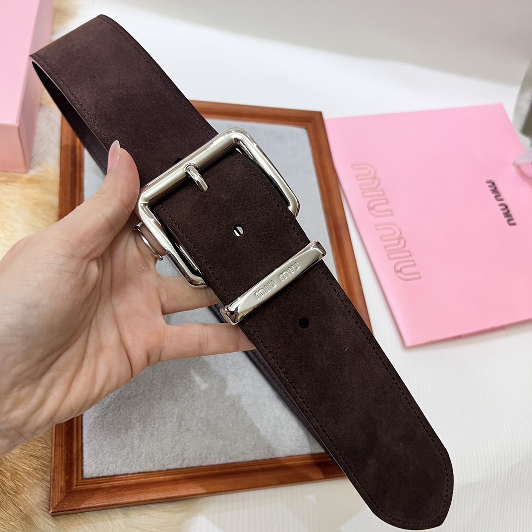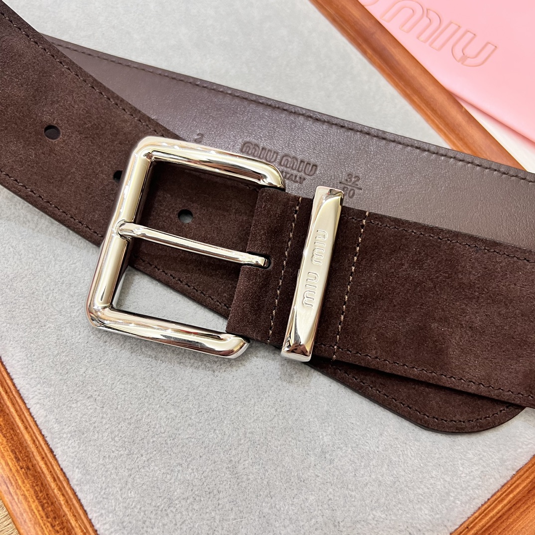 24 metal buckles. The belt loop is adorned with a laser-engraved logo. This leather belt features a simple and elegant design, with the belt loop bearing the Miu Miu logo. Imported cowhide belt 5.0cm.