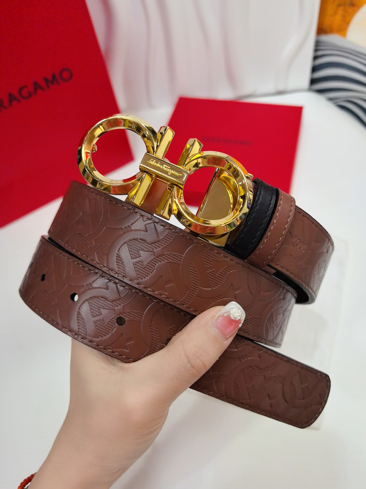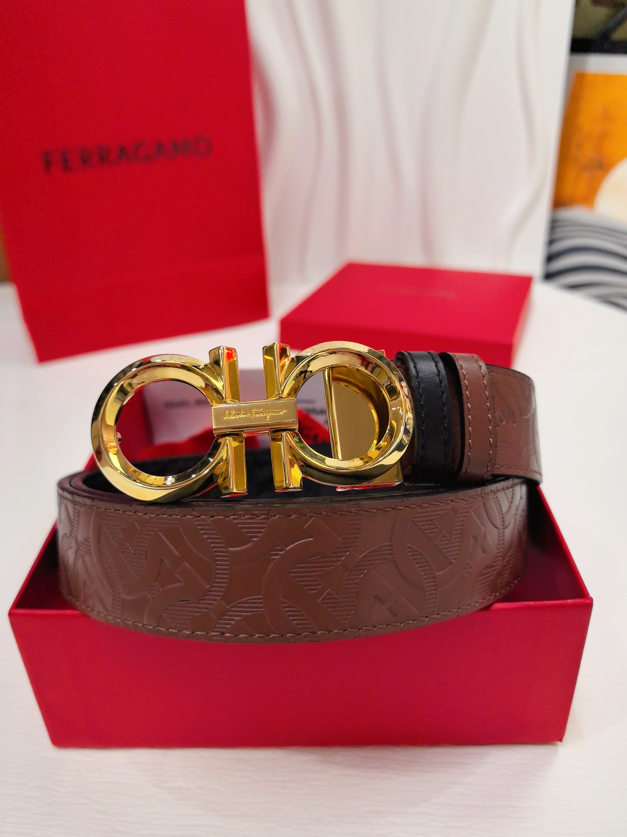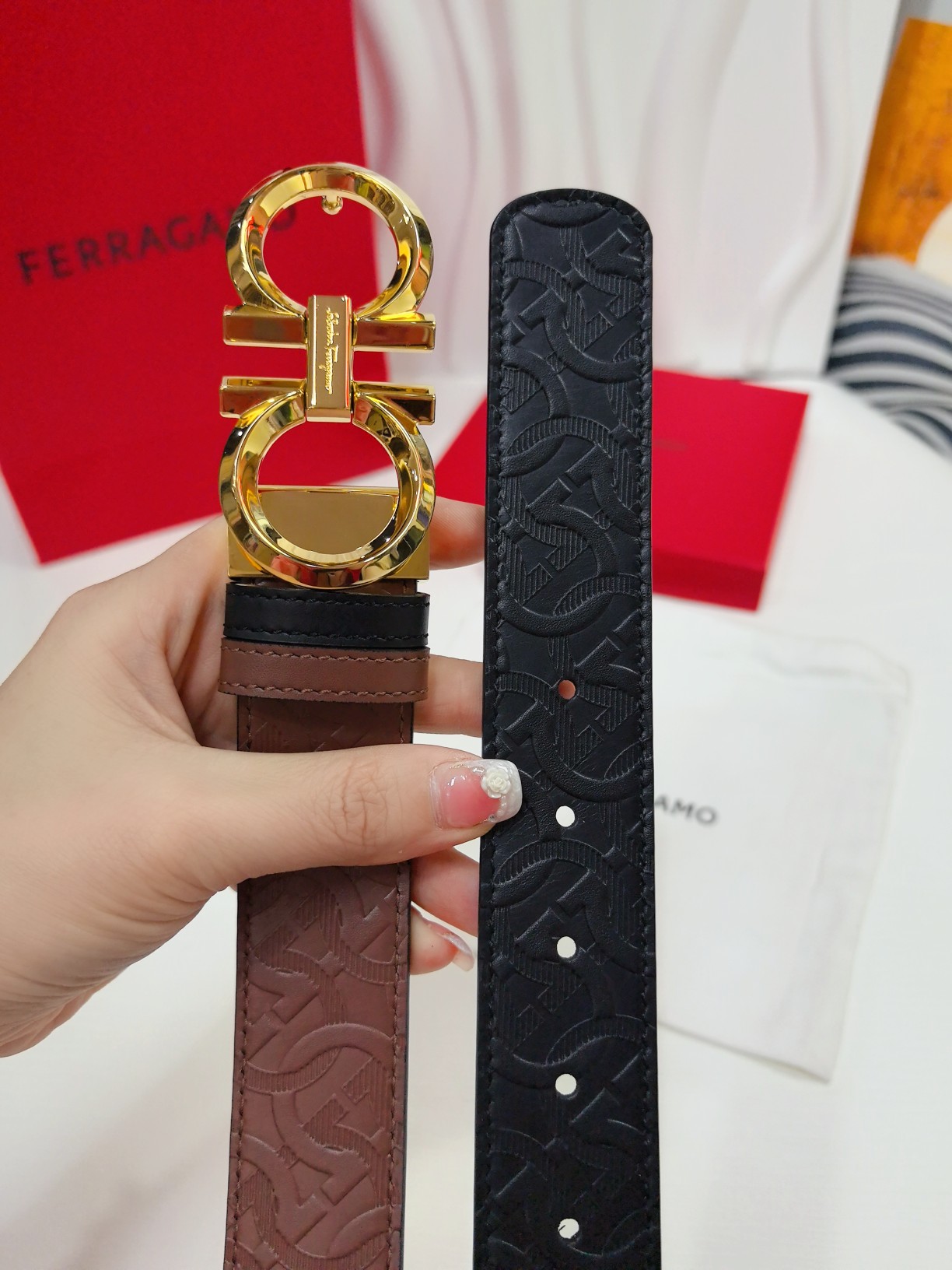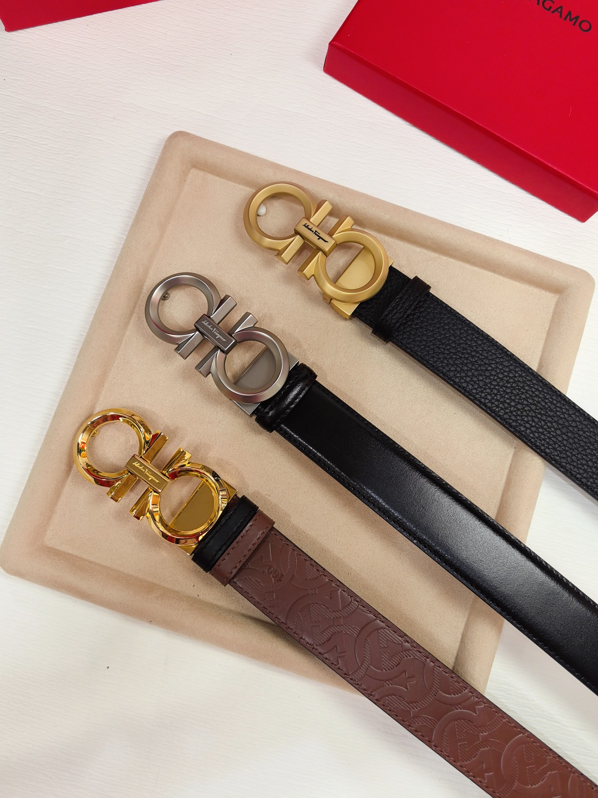 This double-sided belt has an elegant style and features a dual-finish design, allowing for flexible styling of various looks while maintaining a sophisticated demeanor at all times. It can be considered a staple accessory for the modern refined gentleman. The natural grained calfskin and hammered calfskin are joined together, creating a bold and eye-catching edge effect. The Gancini buckle is paired with contrasting trim, and the connection point is adorned with a logo. The length is adjustable, achieving a tailored fit. The belt can be cut or additional eyelets can be added to create a tight or loose fit. 3.5 wide