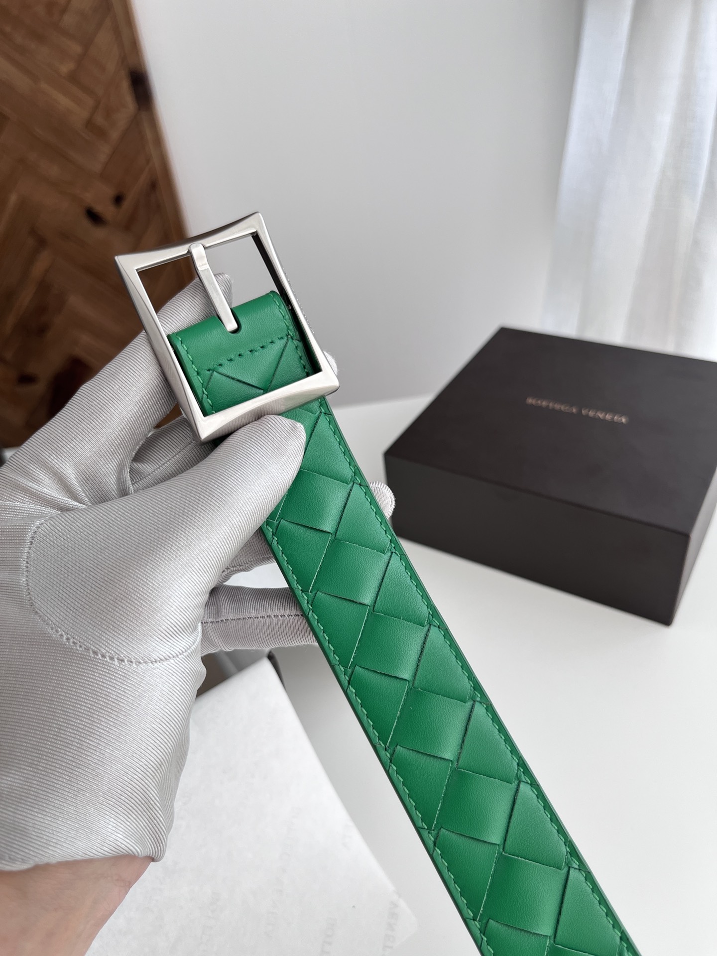 Bv 2024 latest men's woven belt, pure handmade intreccio large grid weaving, double-sided Italian calfskin with a slightly retro silver pin buckle, side marked width 35MM, color: parrot green + parrot green