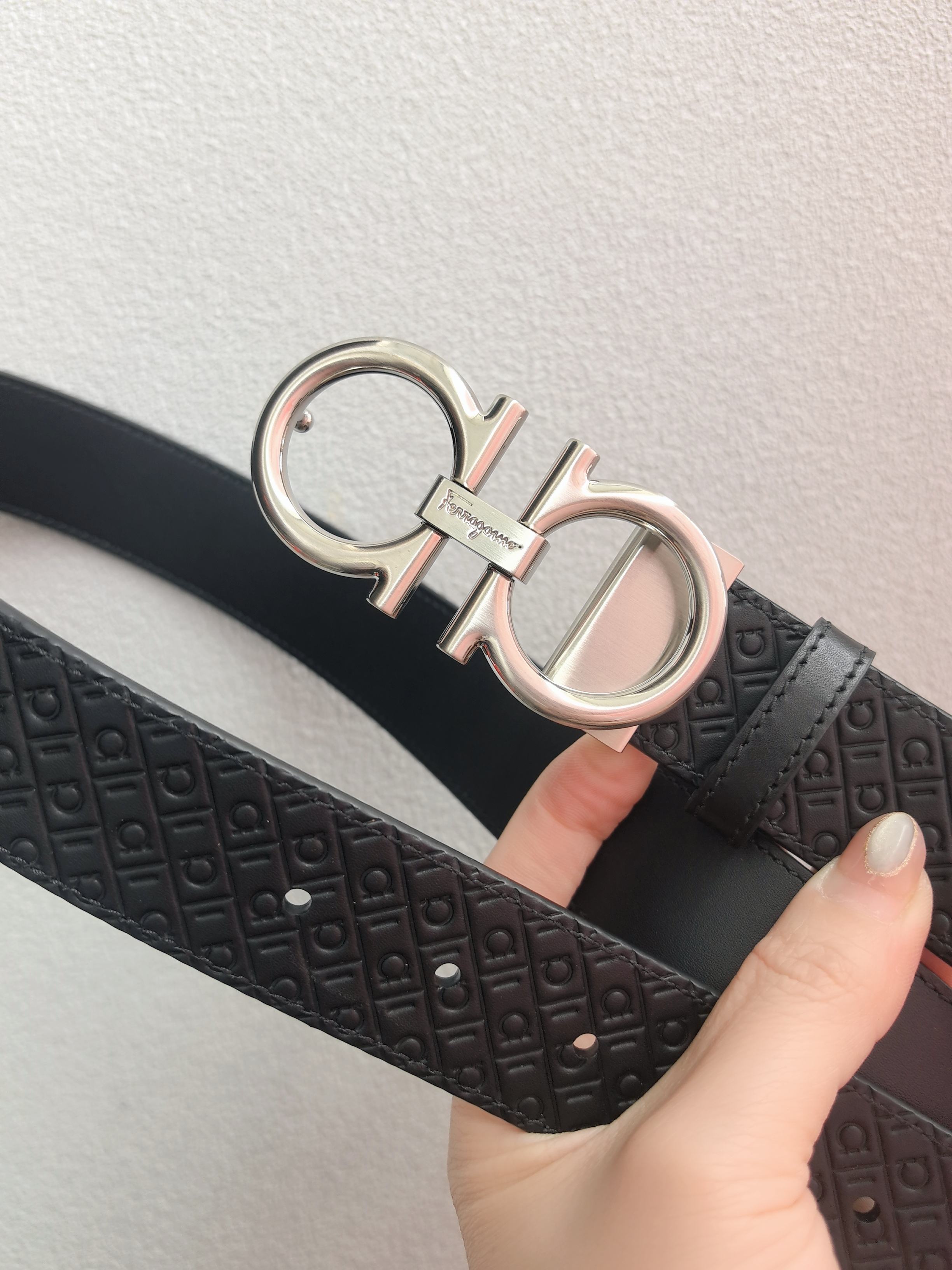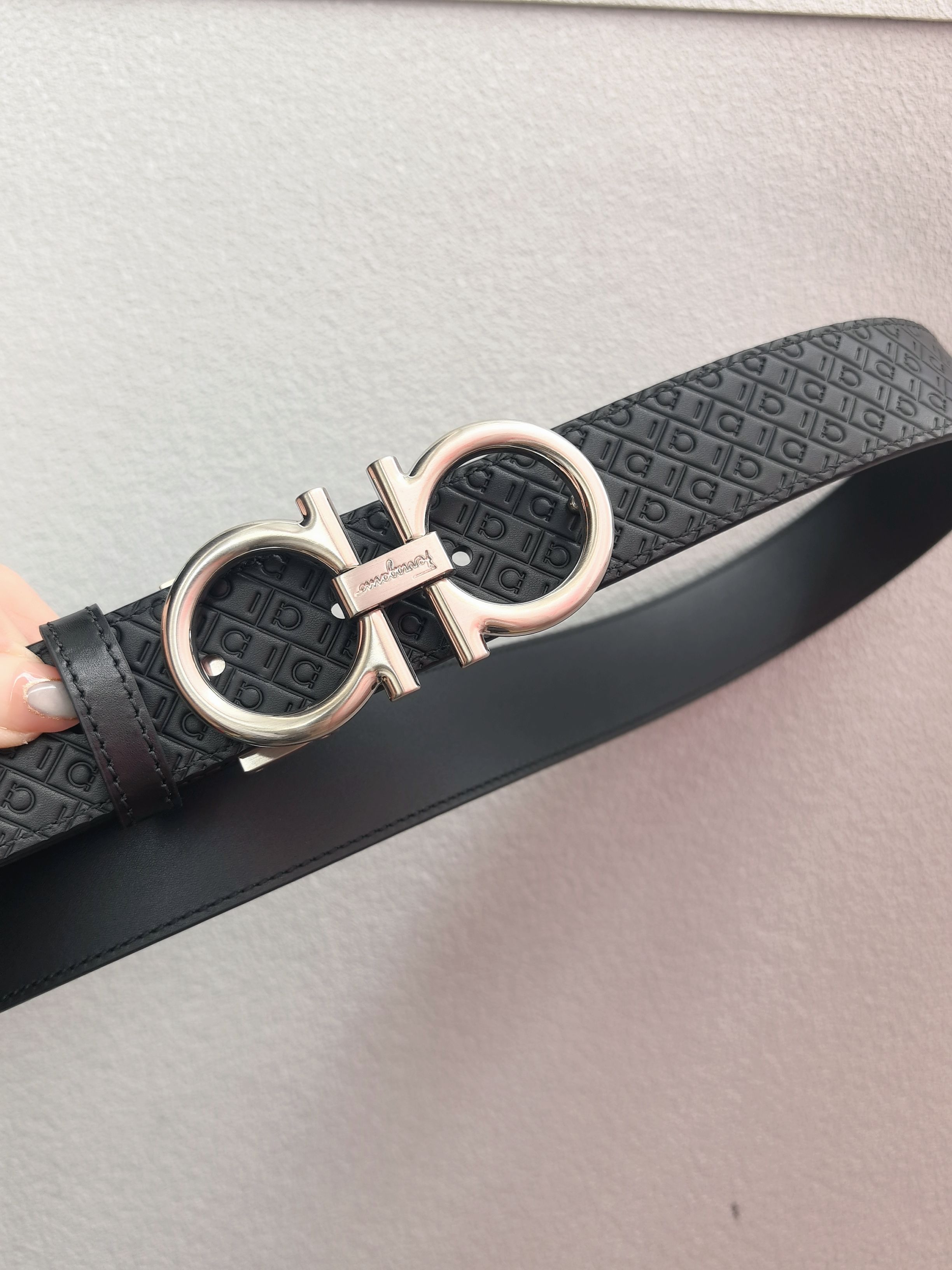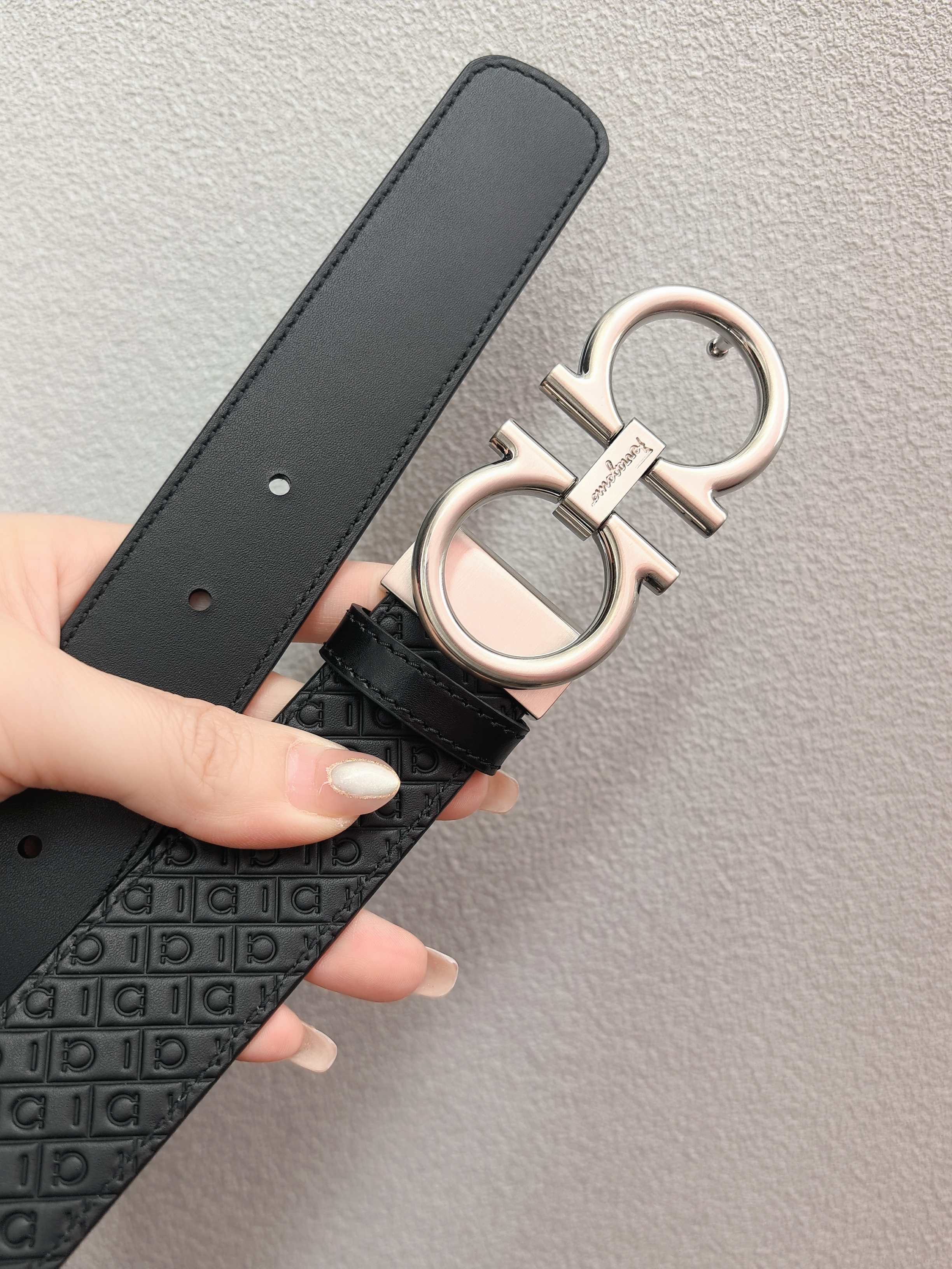 This belt has an elegant style, featuring a rectangular buckle adorned with a small Gancini. It is designed with two sides: one side is made of hammered texture material, while the other side is embossed with an all-over Gancini pattern, exuding a classic charm in a subtle way. The length is adjustable, providing a tailored and slimming effect. 3.5 wide