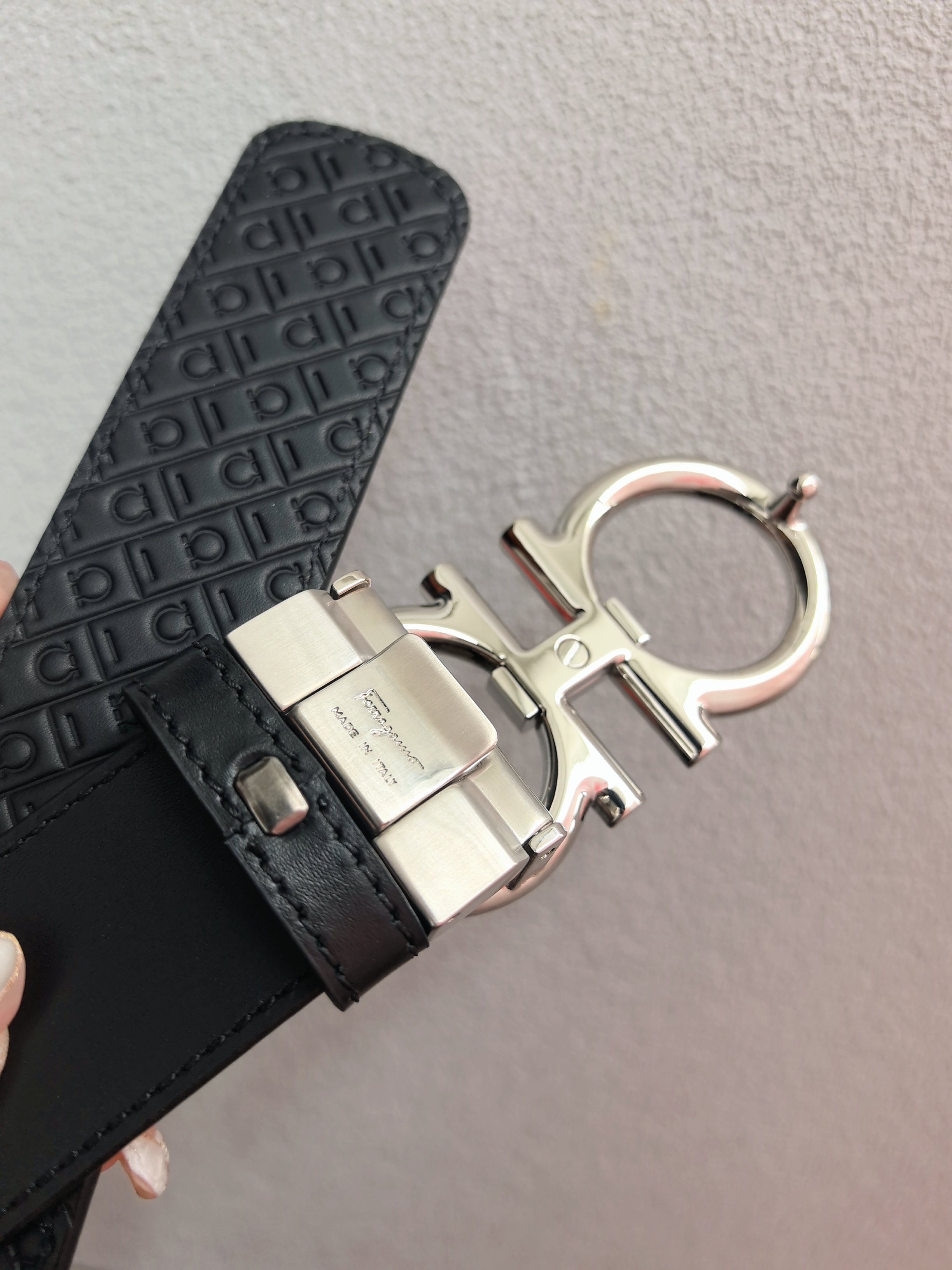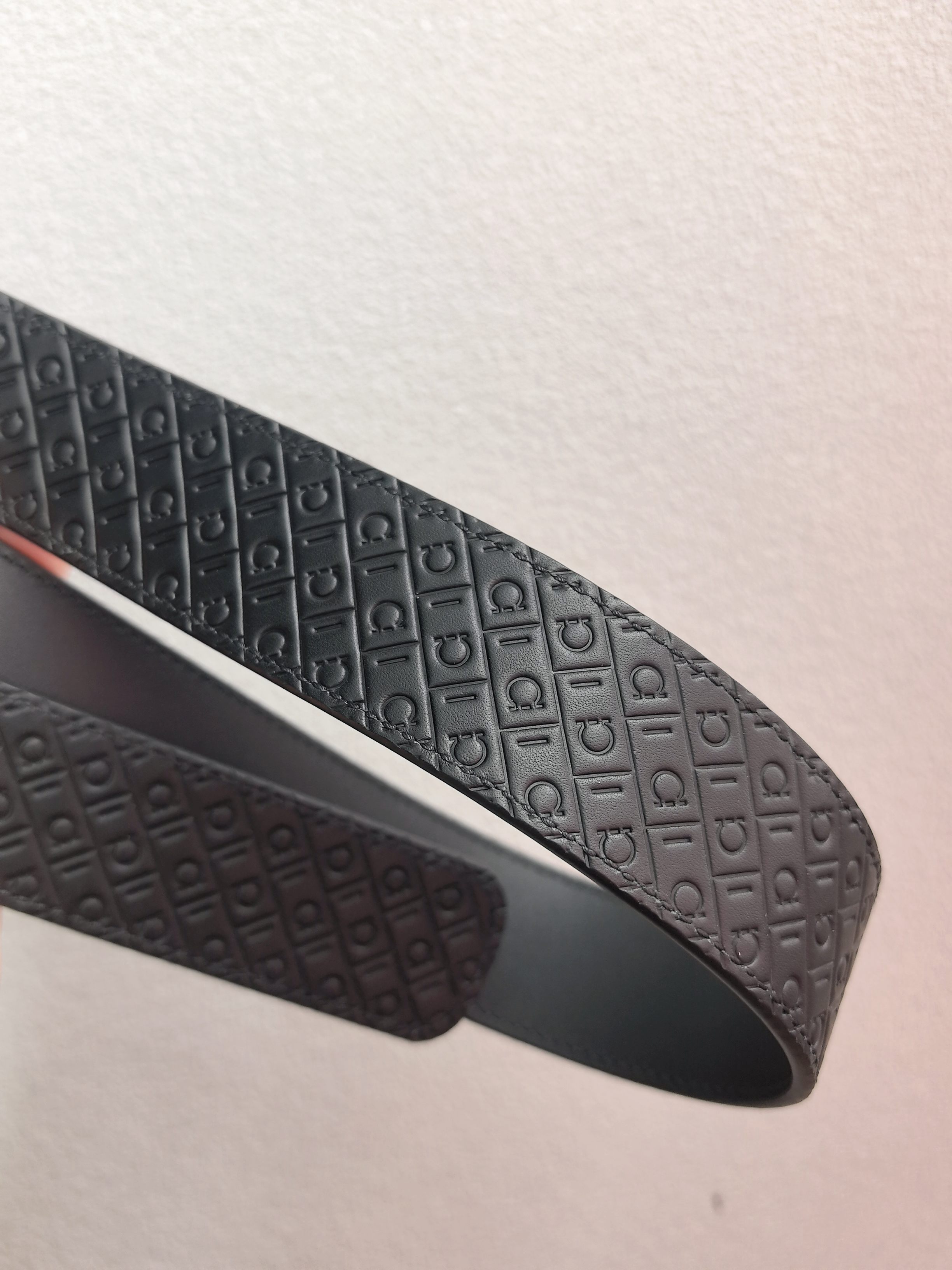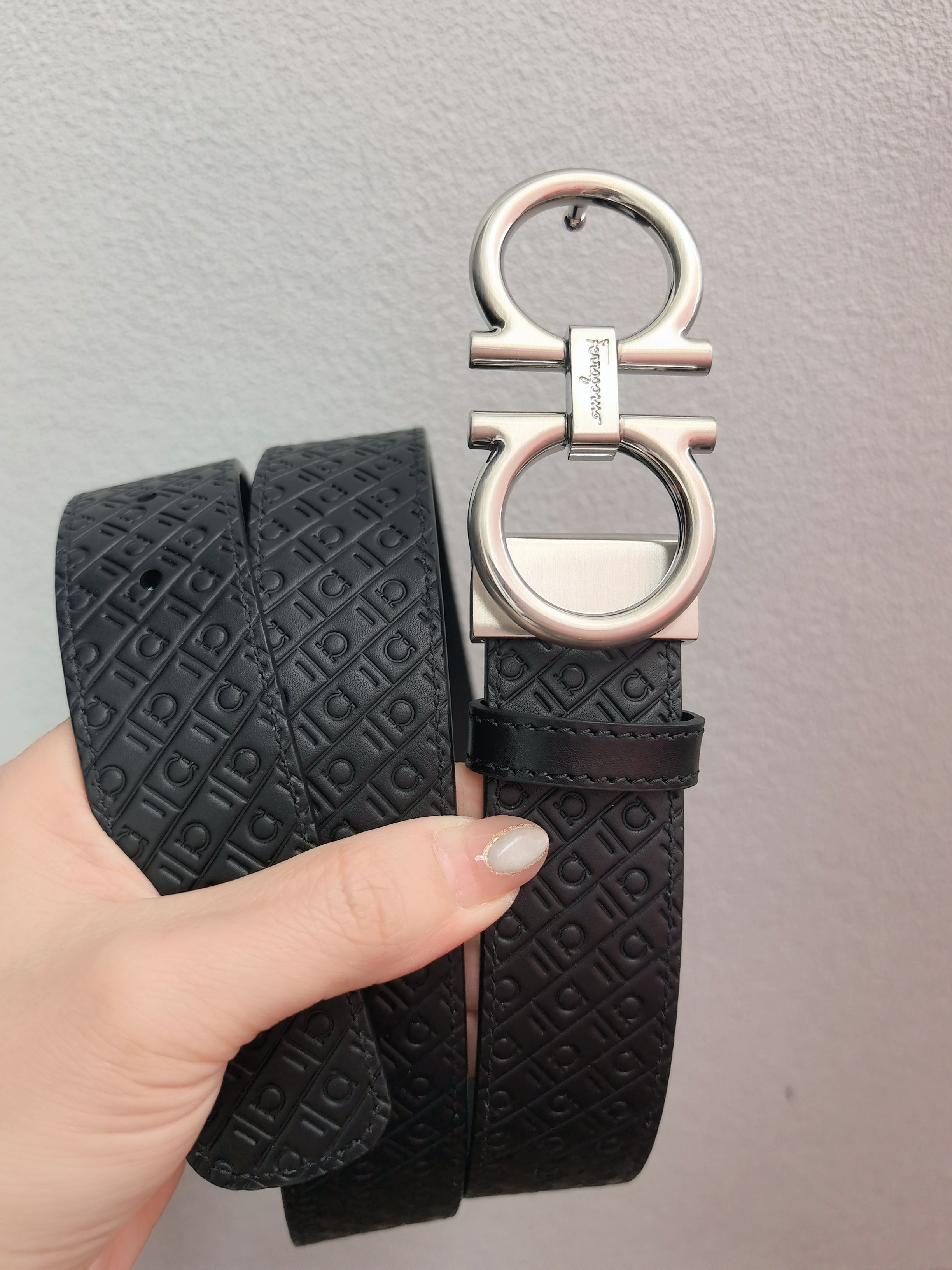 This belt has an elegant style, featuring a rectangular buckle adorned with a small Gancini. It is designed with two sides: one side is made of hammered texture material, while the other side is embossed with an all-over Gancini pattern, exuding a classic charm in a subtle way. The length is adjustable, providing a tailored and slimming effect. 3.5 wide