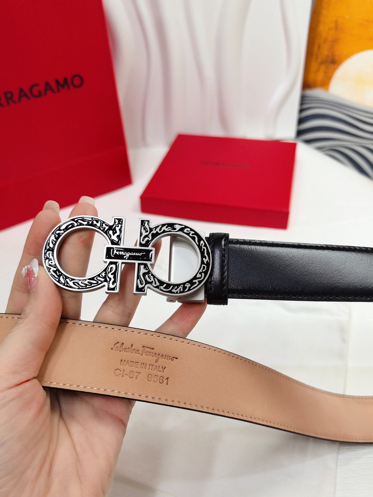 This double-sided belt features an elegant style with a dual-finish design, flexibly adapting to various looks while maintaining a sophisticated tone at all times, making it a staple accessory for the modern refined gentleman. The natural grained calfskin and hammered calfskin are spliced together, creating a bold and eye-catching edge effect. The Gancini buckle is paired with contrasting trim, and the connection point is adorned with a logo. The adjustable length allows for a tailored, slimming effect. The belt can be trimmed or additional eyelets can be added to achieve a tight or loose fit. 3.5 wide
