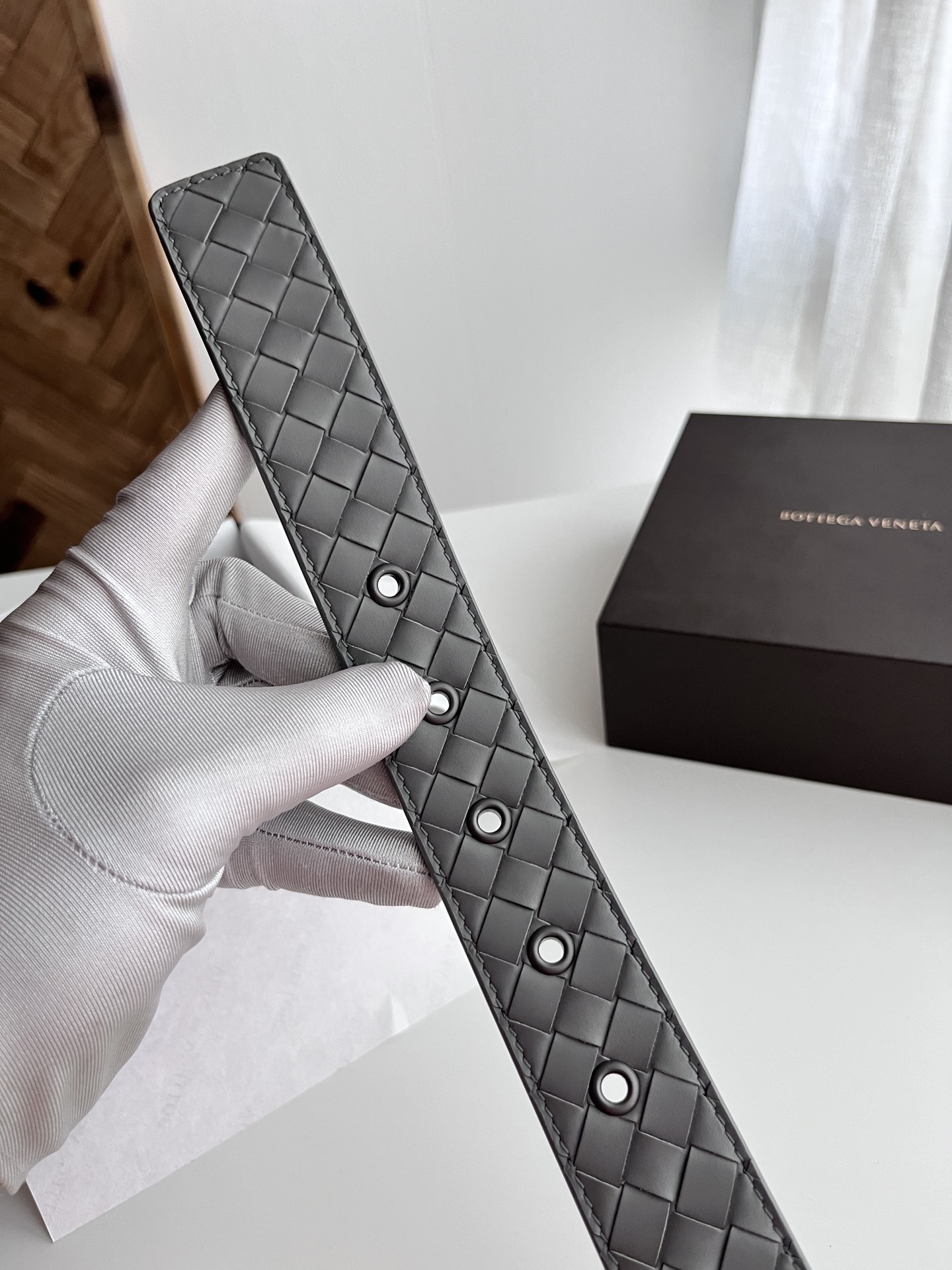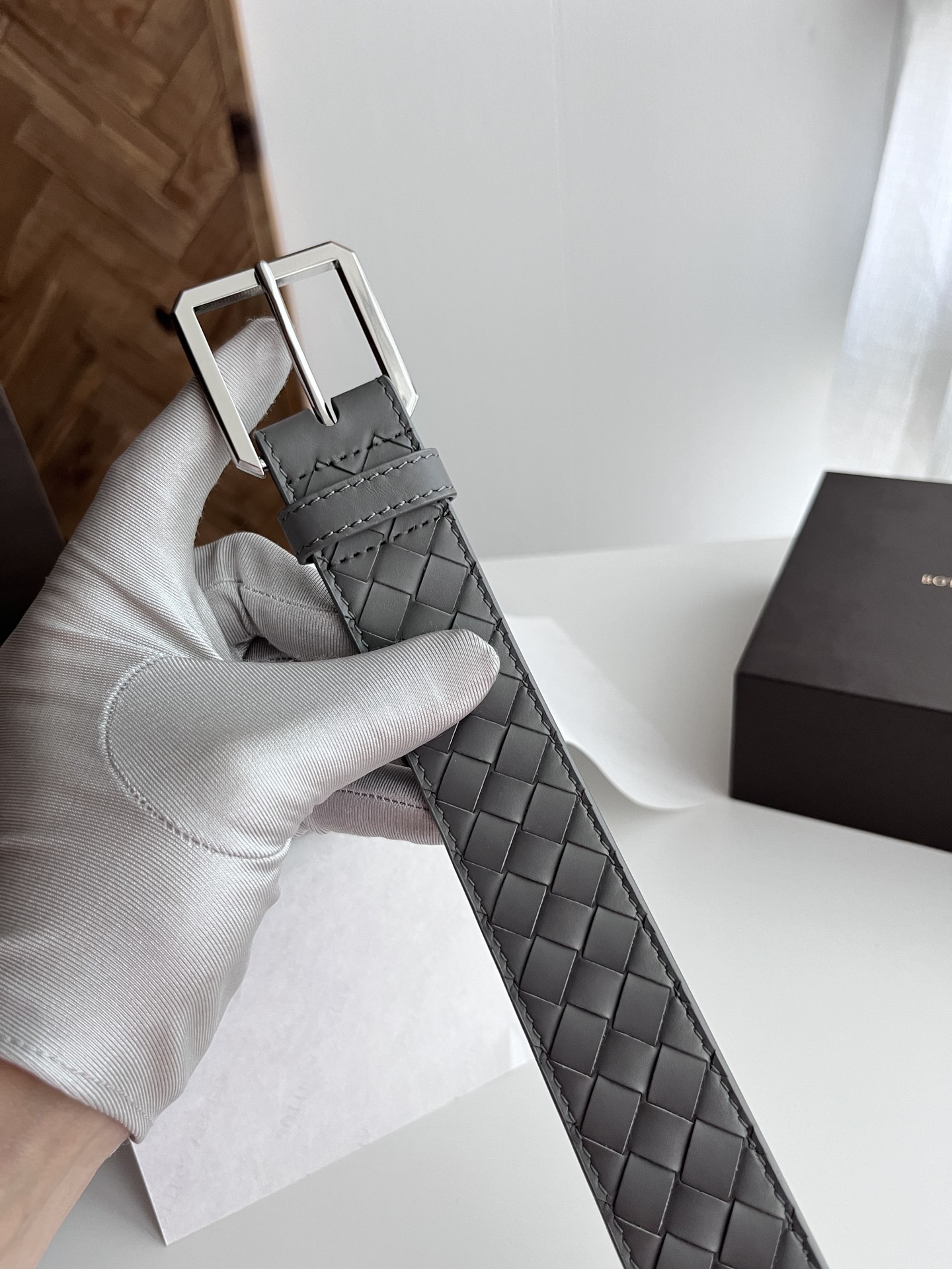 BV 2024 Men's Belt Pure Handmade Small Check Intreccio Woven Italian Calfskin Paired with Slightly Retro Silver Square Octagonal Pin Buckle Belt Width 3.5cm Color: Pewter Gray