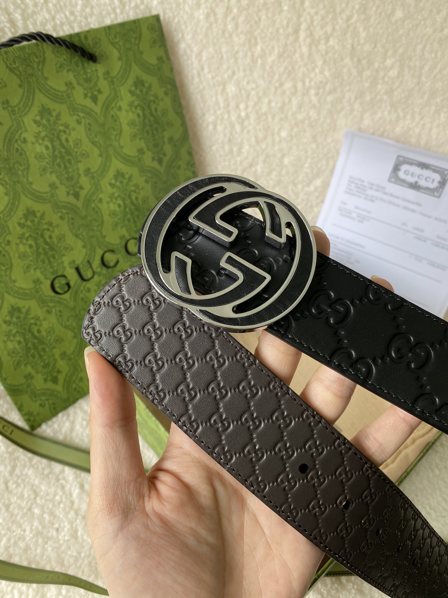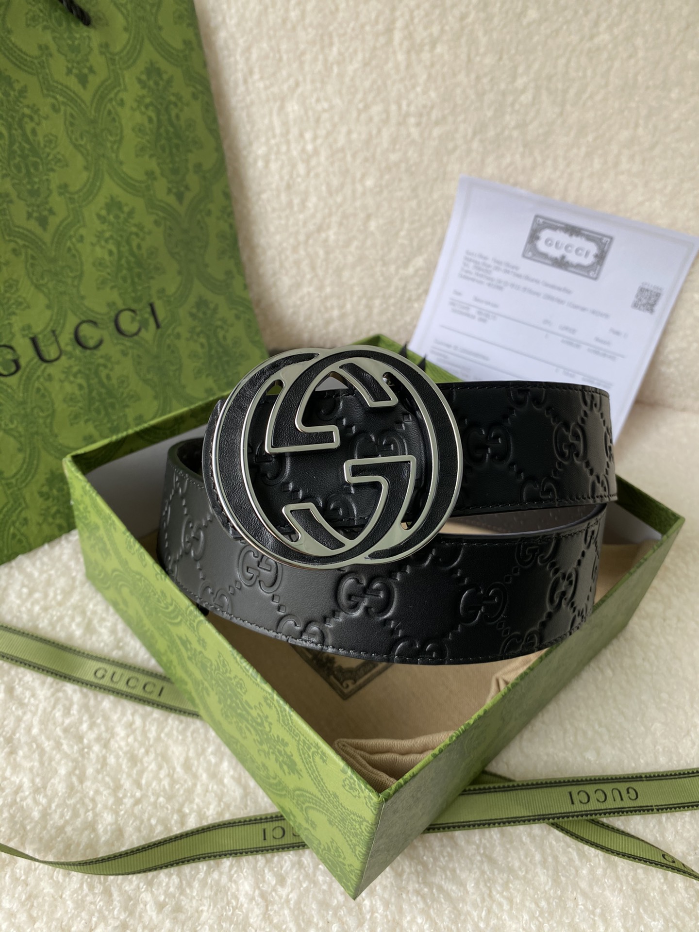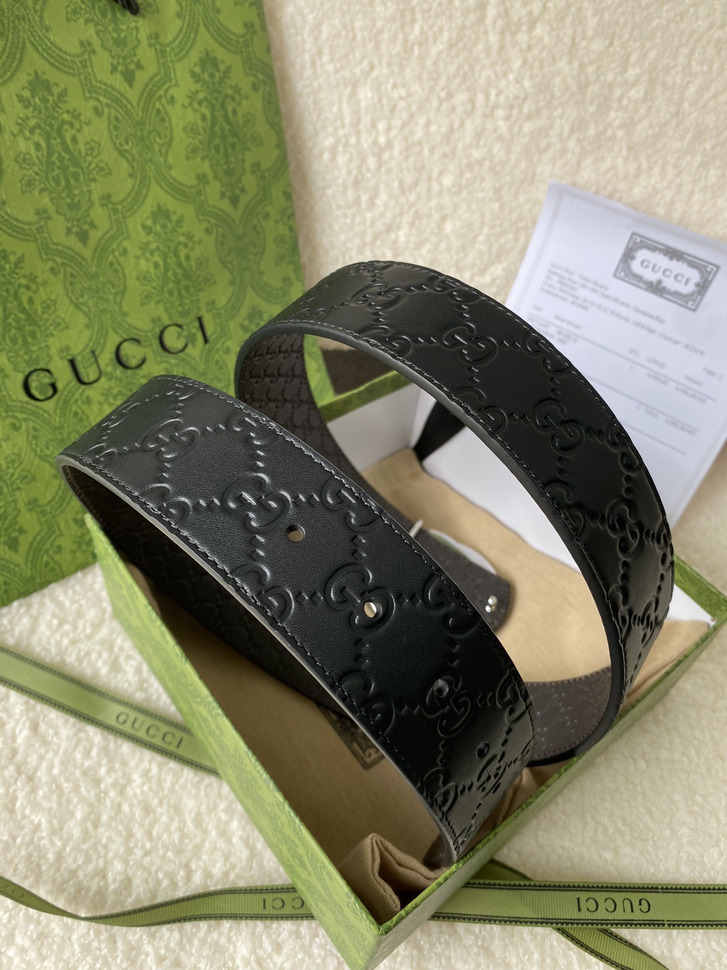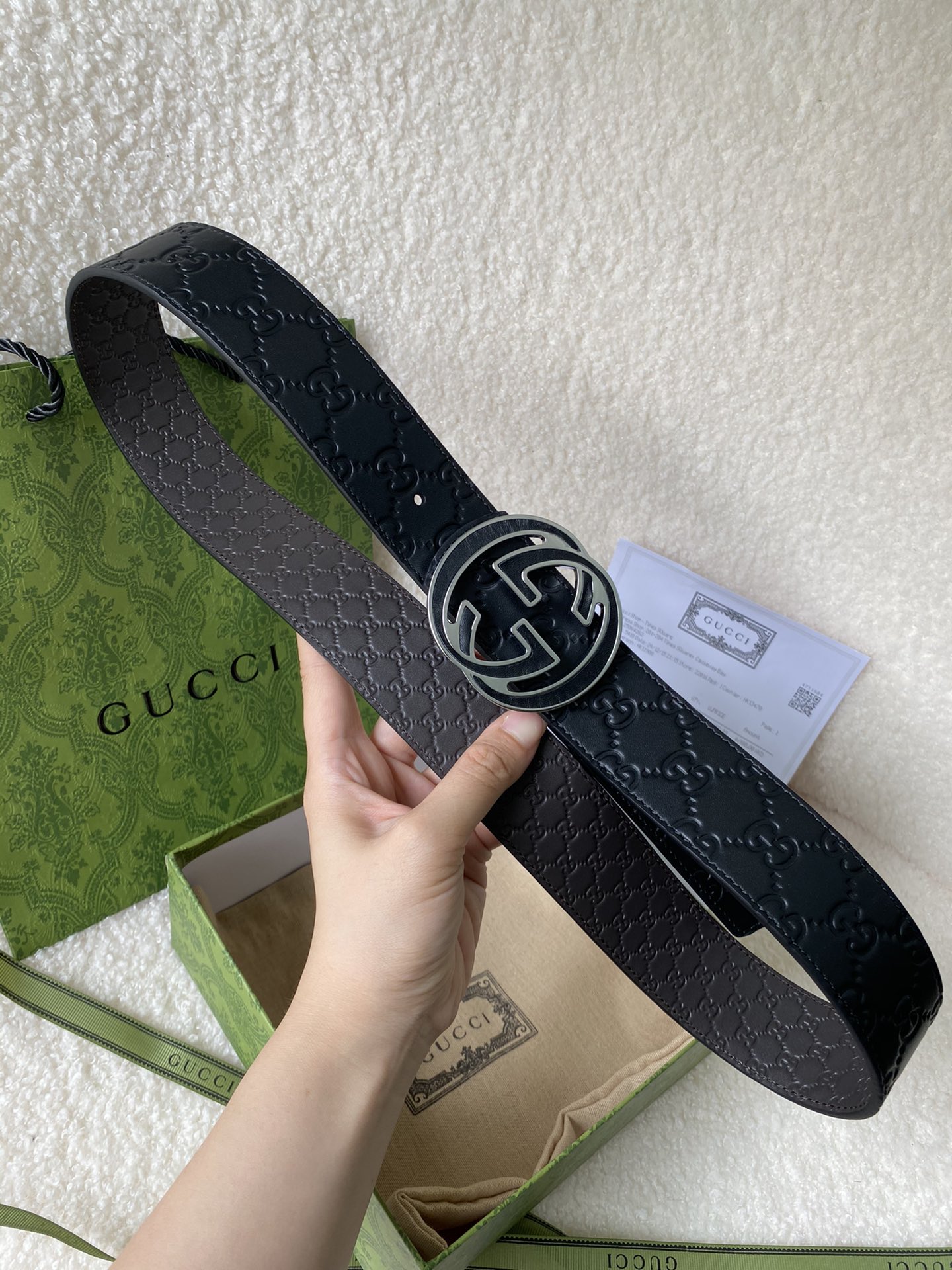 Gucci Double G Buckle Men's New Belt In-Store Synchronization Width 4 cm Strap Canvas Black Monogram - Imported Pebble Grain Black Combination Exquisite Vacuum Plated Double G Steel Buckle Double-Sided Usable
