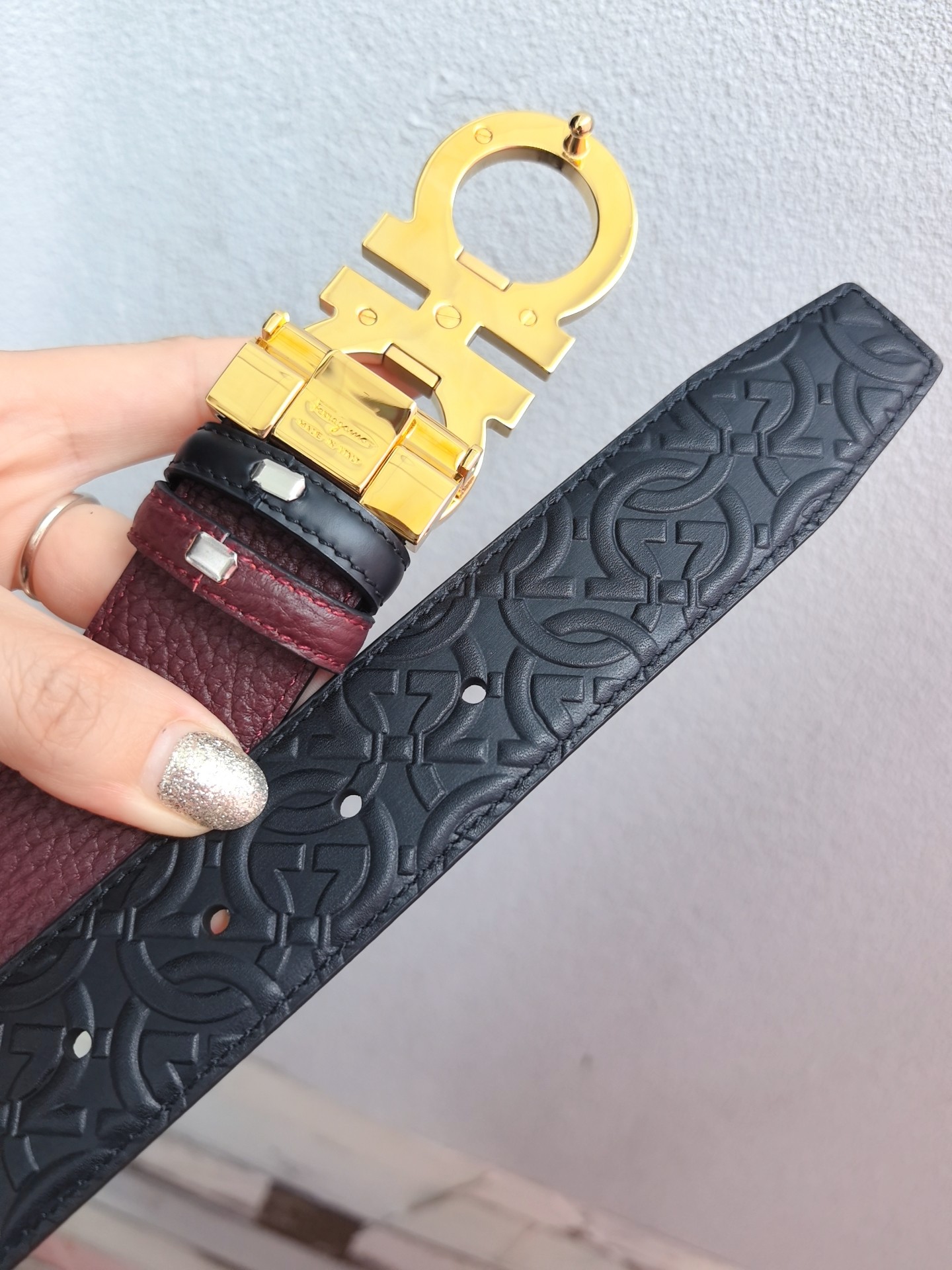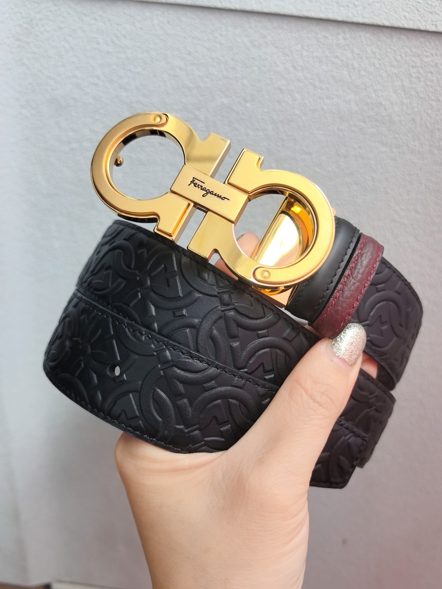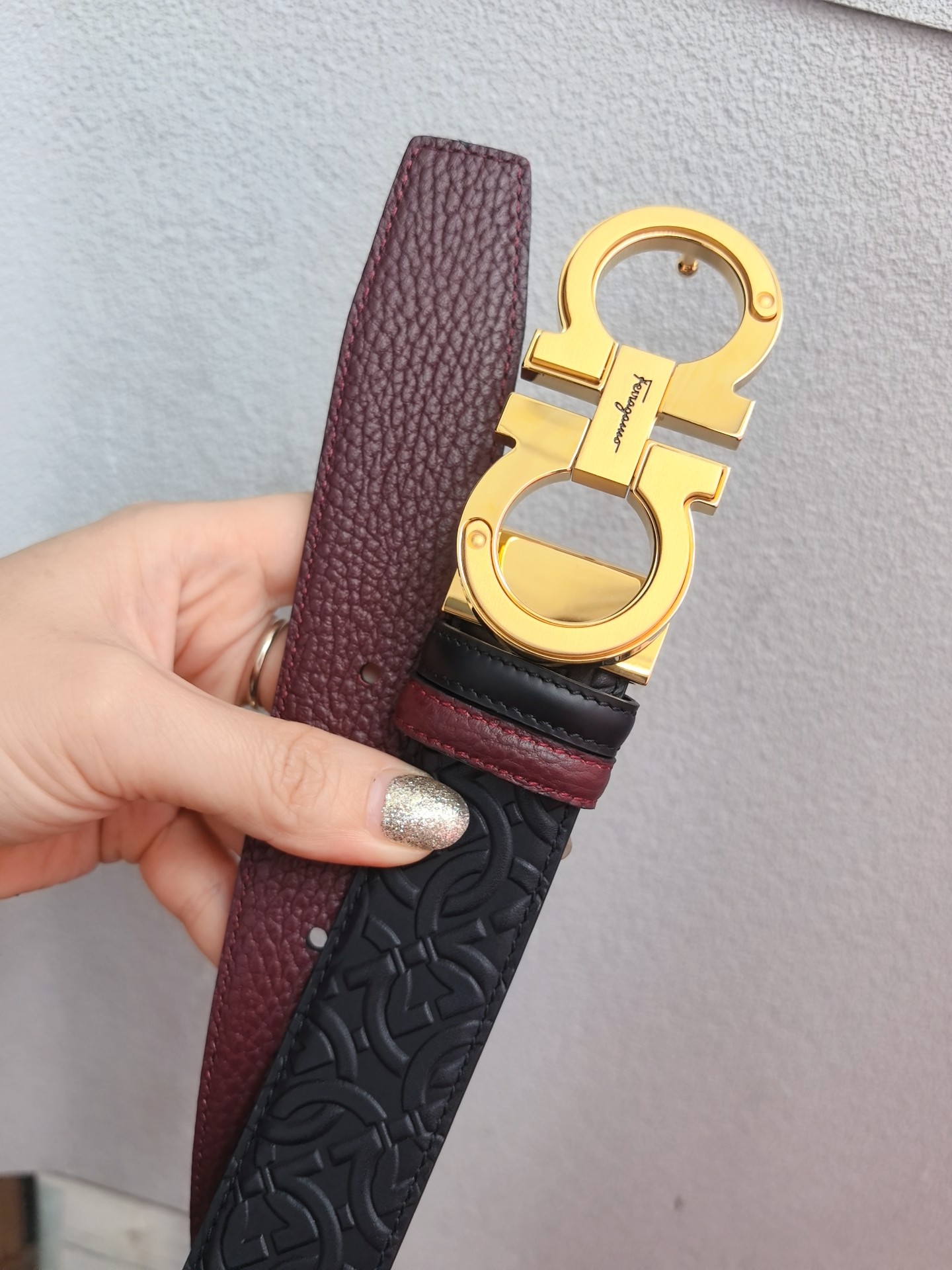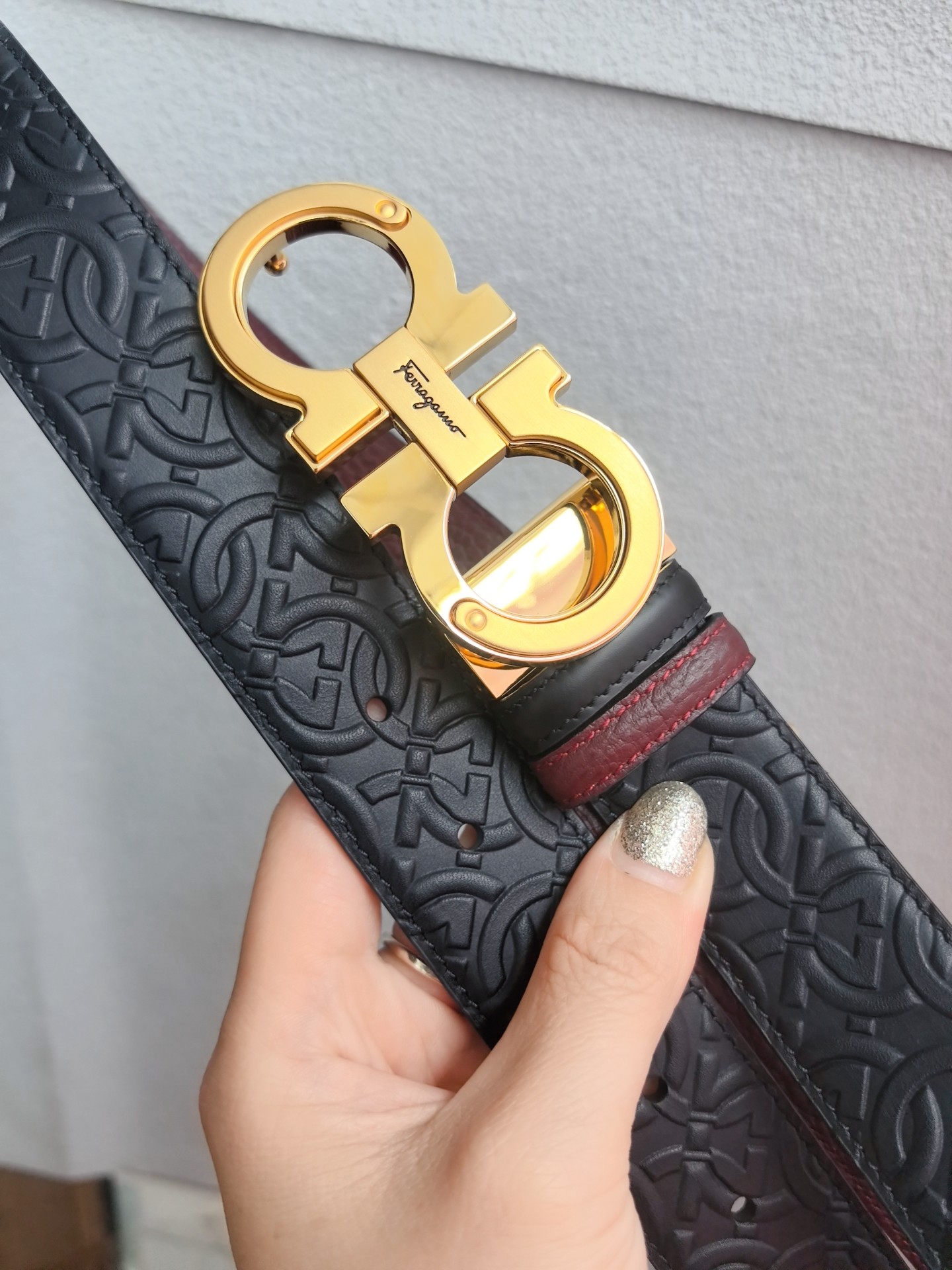 This belt has an elegant style, featuring a rectangular buckle adorned with a small Gancini. It is designed with two sides: one side is made of hammered texture material, while the other side is embossed with an all-over Gancini pattern, exuding a classic charm in a subtle way. The length is adjustable, achieving a tailored and slimming effect. 3.5 wide