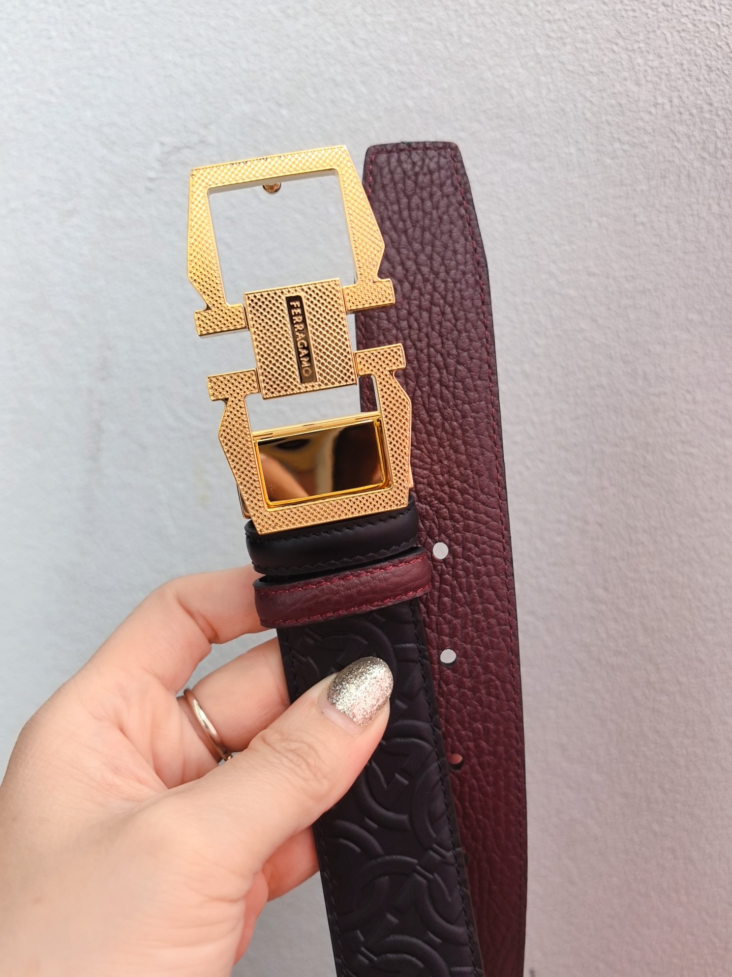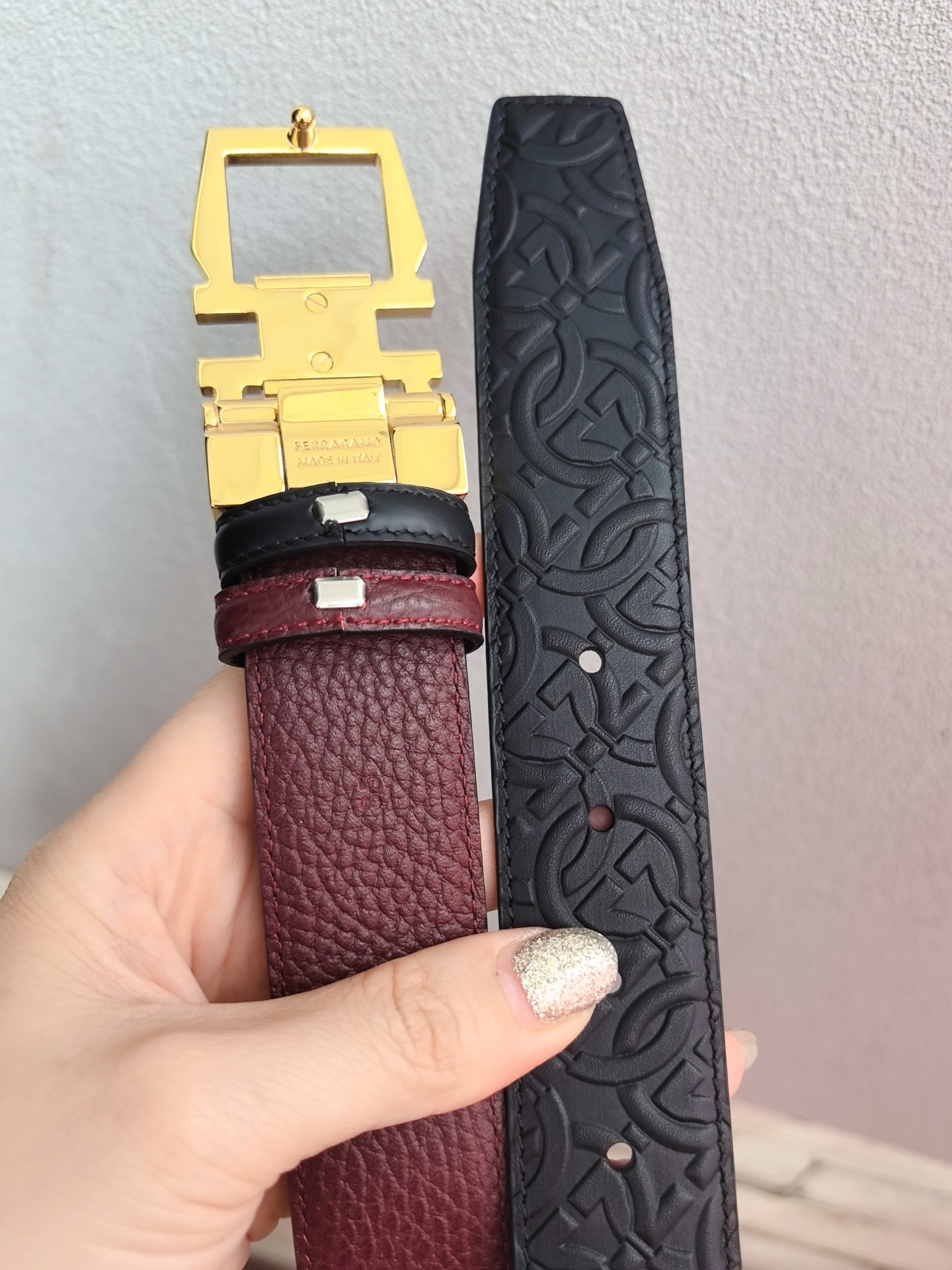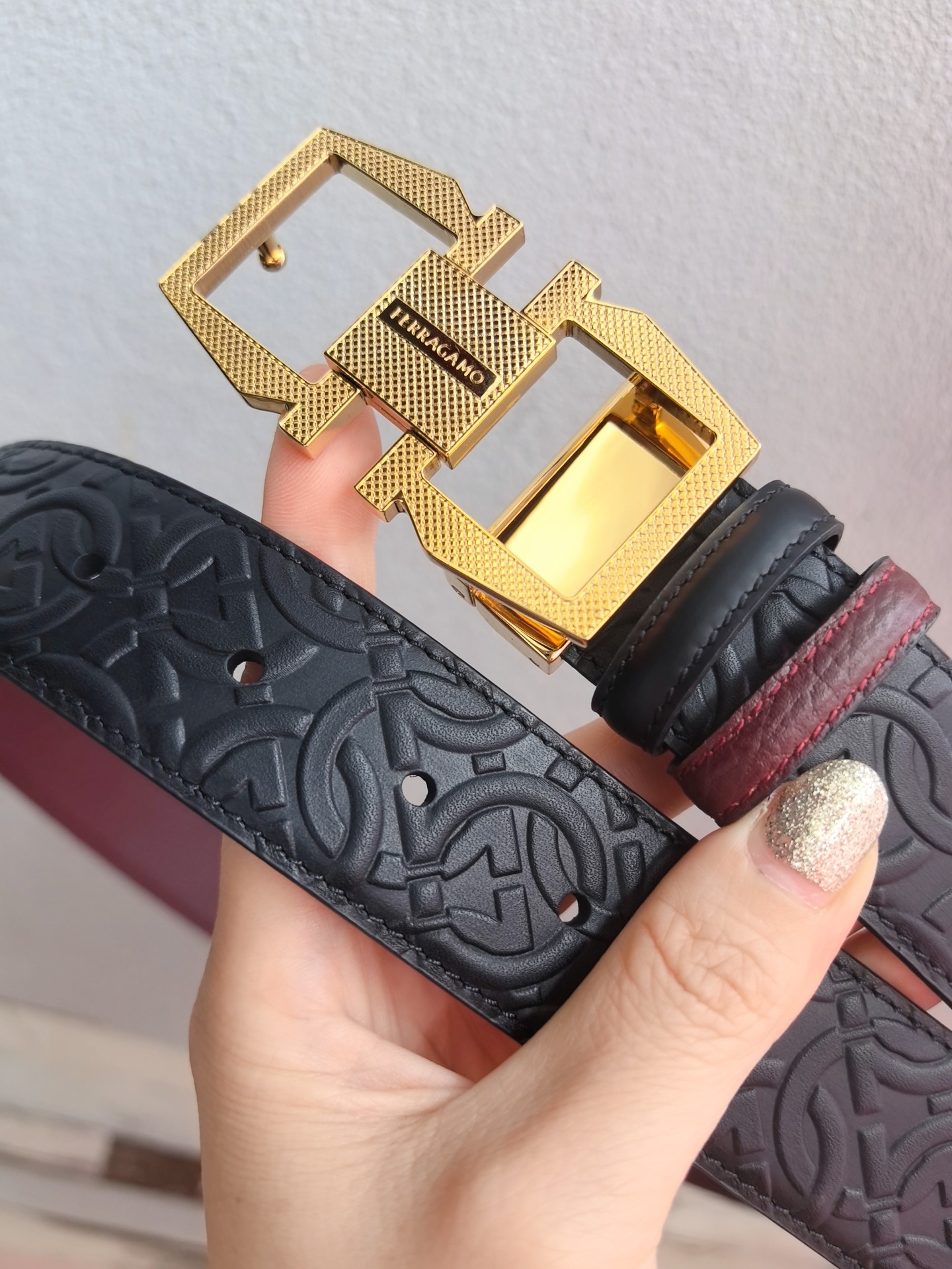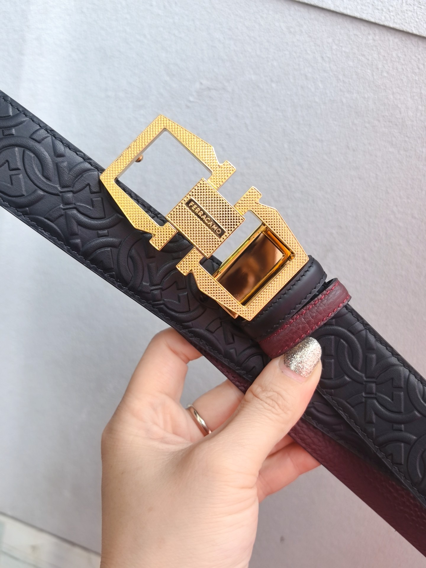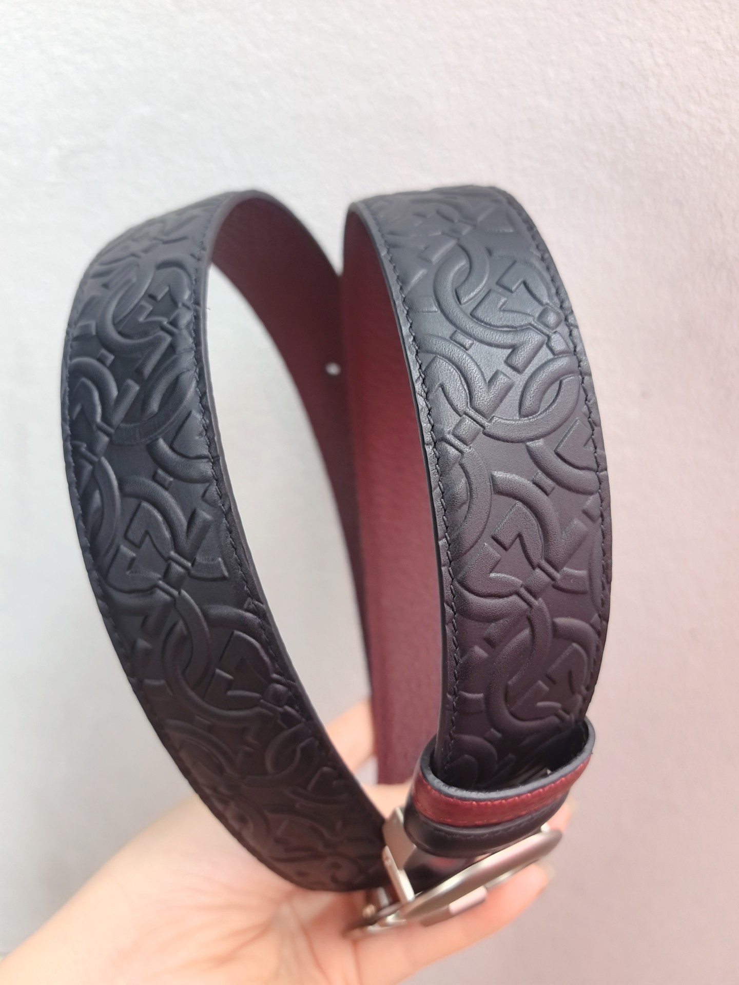 This belt has an elegant style, featuring a rectangular buckle adorned with a small Gancini. It is designed with two sides: one made of hammered texture material, and the other with an all-over Gancini embossed pattern as the base, exuding a classic charm in a subtle way. The length is adjustable, achieving a tailored fit. 3.5 wide