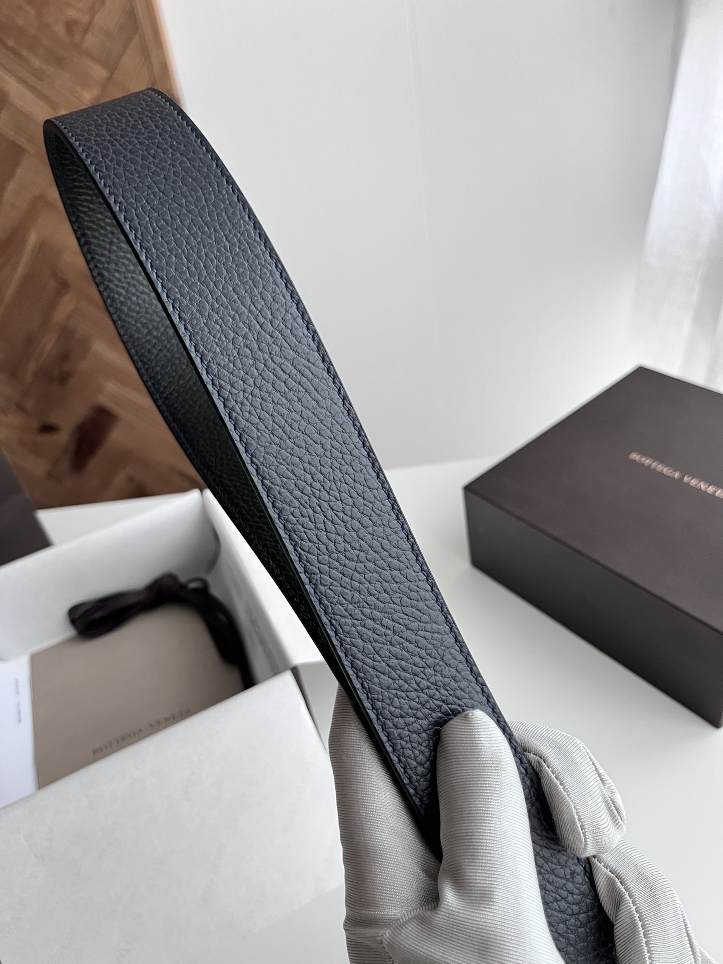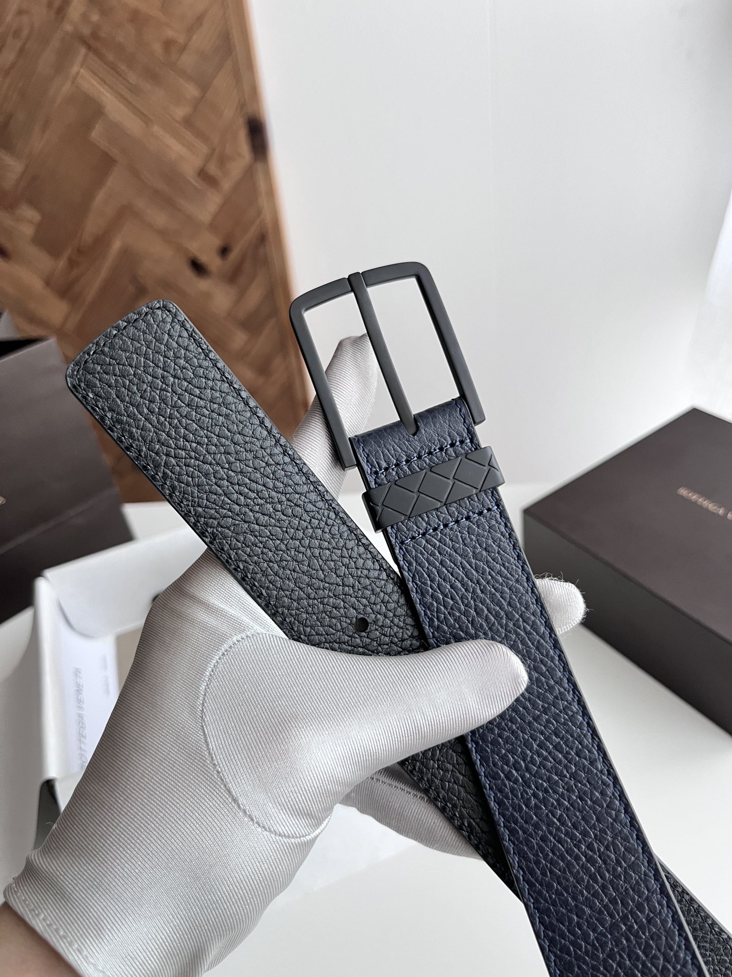Bv 2024 latest men's belt double-sided Italian original factory pebble grain calfskin with vacuum gunmetal pin buckle side with logo buckle through with woven check design width 35MM color: midnight blue/black