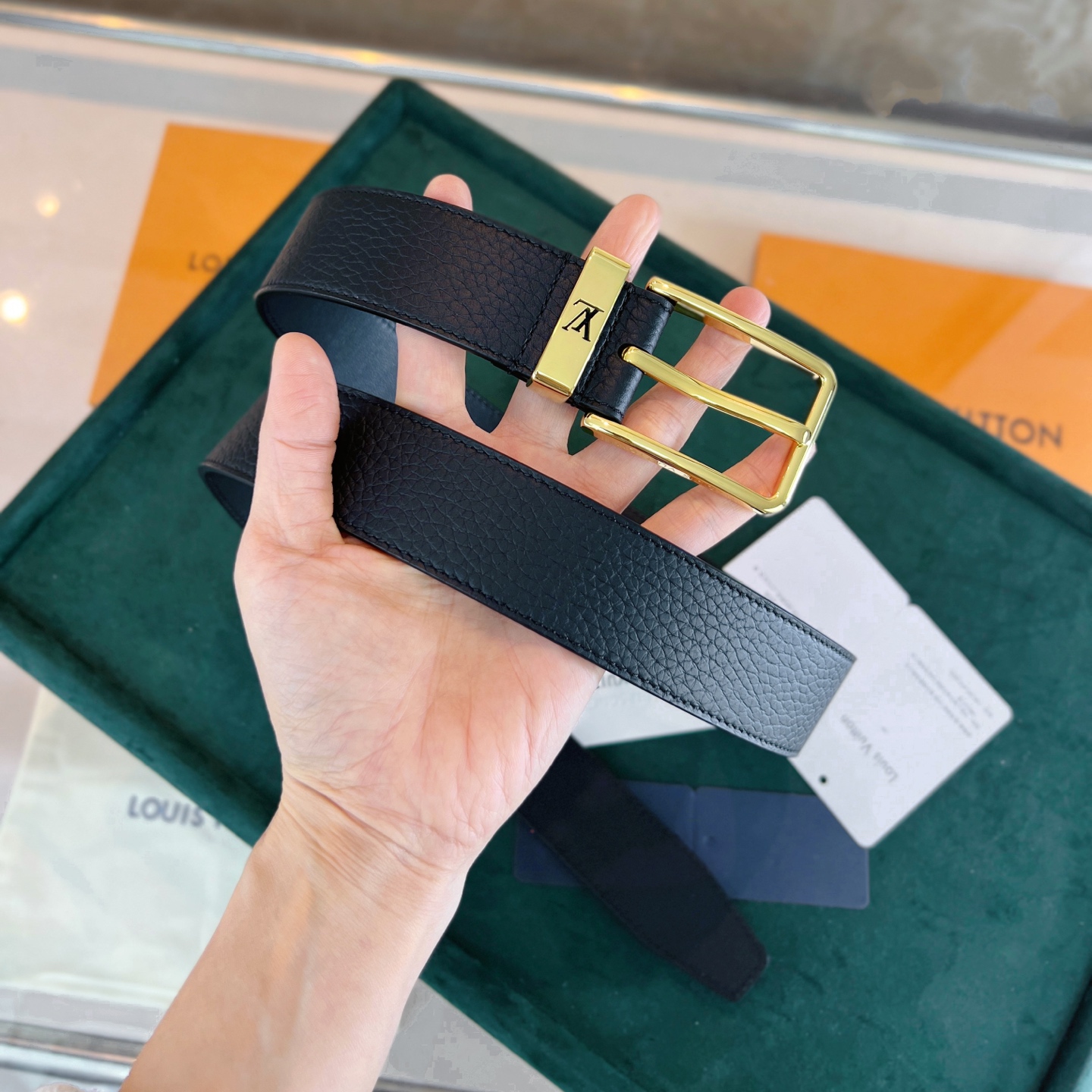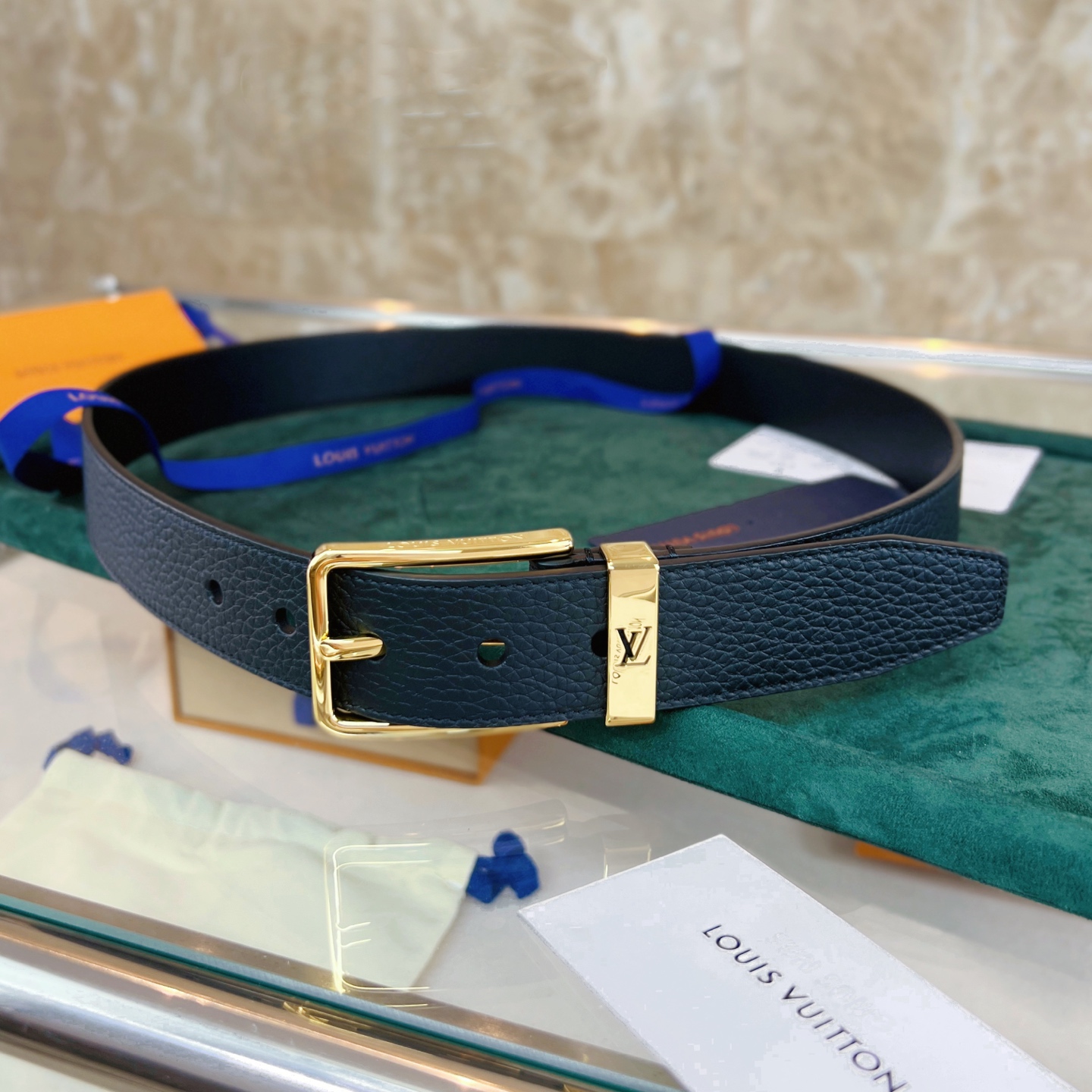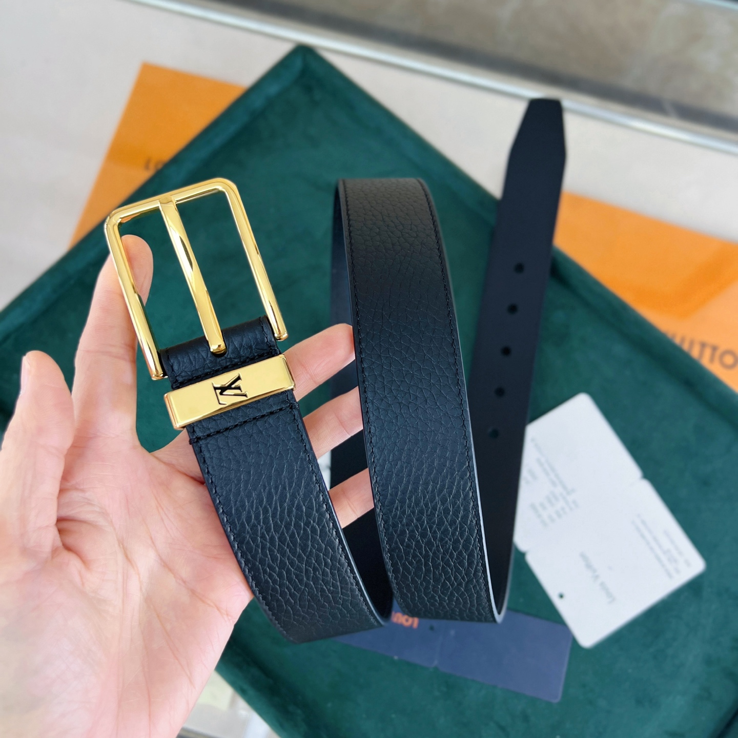 This Taurillon leather belt features a metal buckle ring with a cut-out LV logo, creating a calm and low-key gentlemanly style.