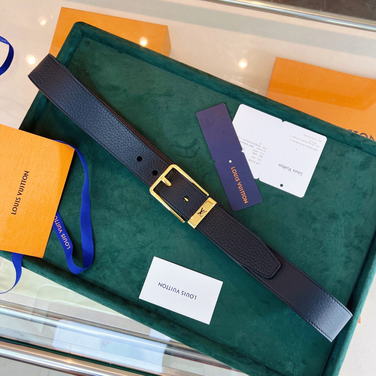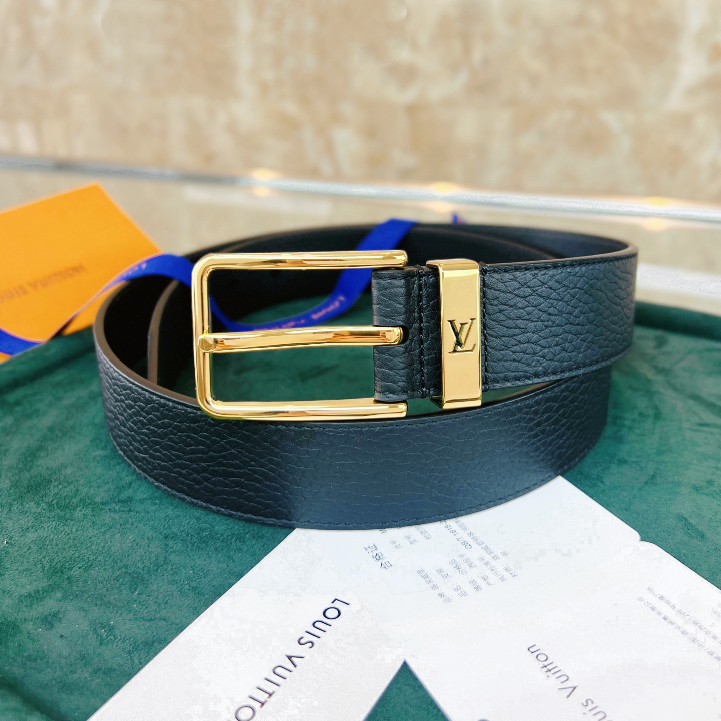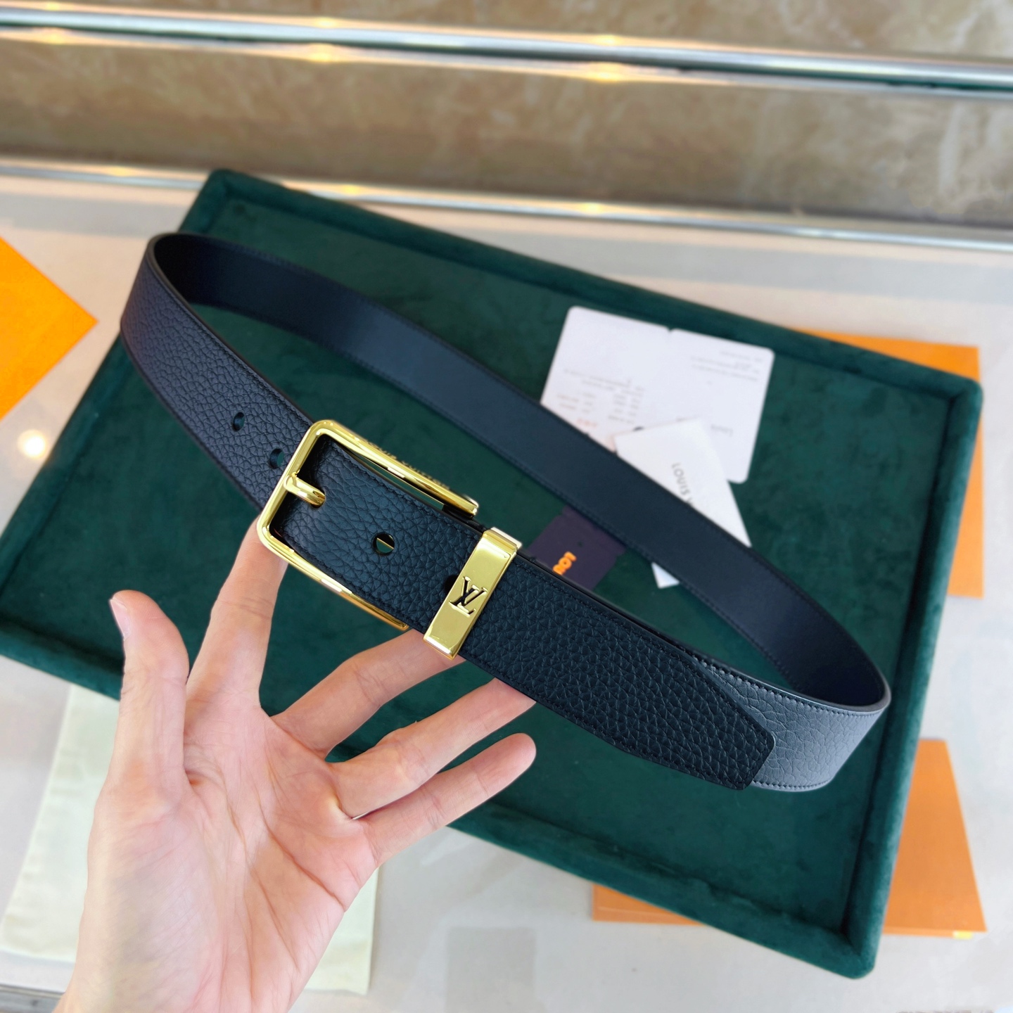 This Taurillon leather belt features a metal buckle ring with a cut-out LV logo, creating a calm and low-key gentlemanly style.