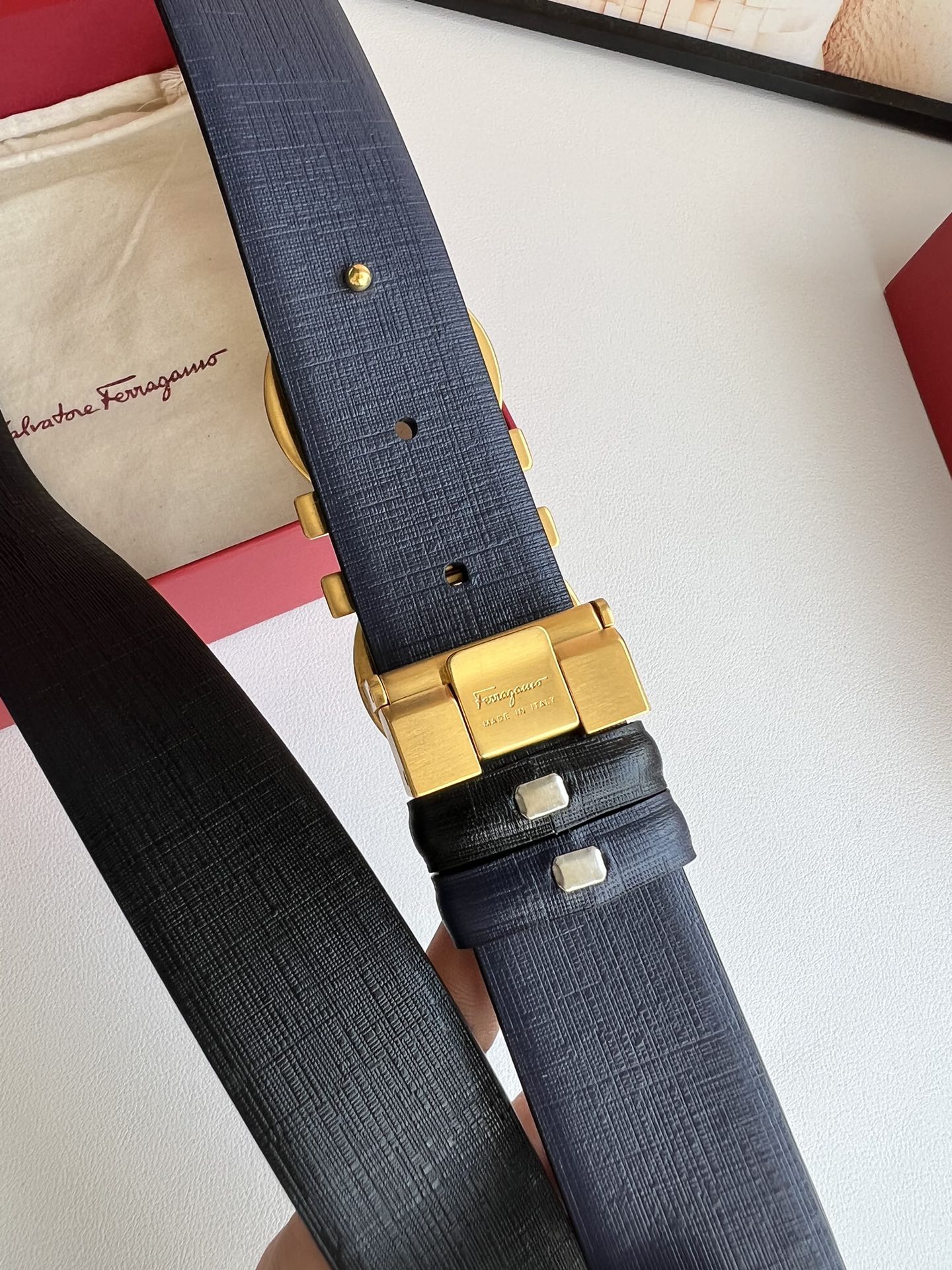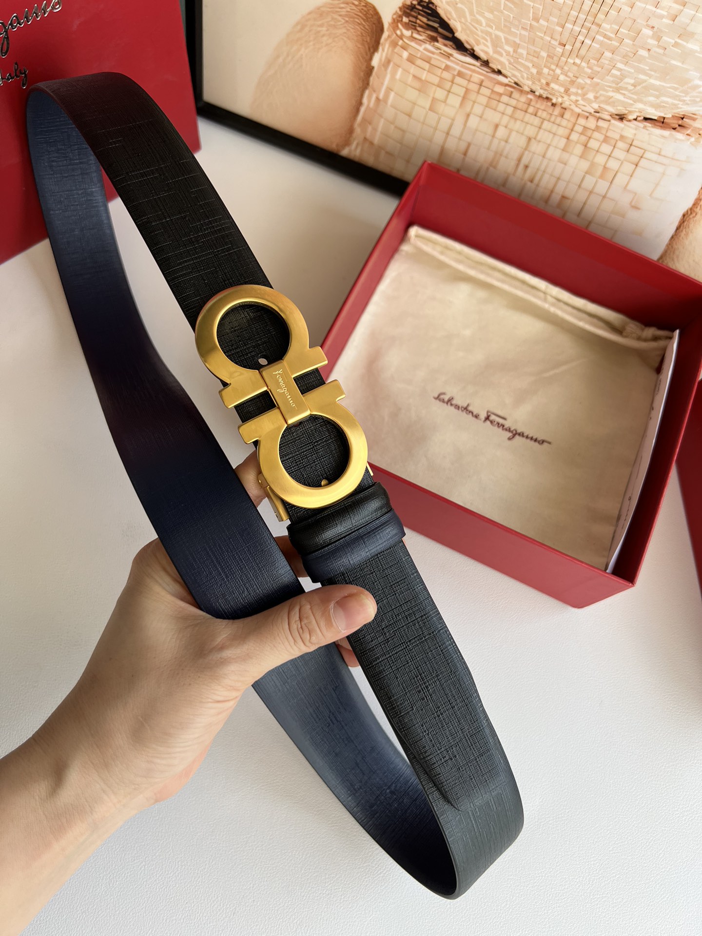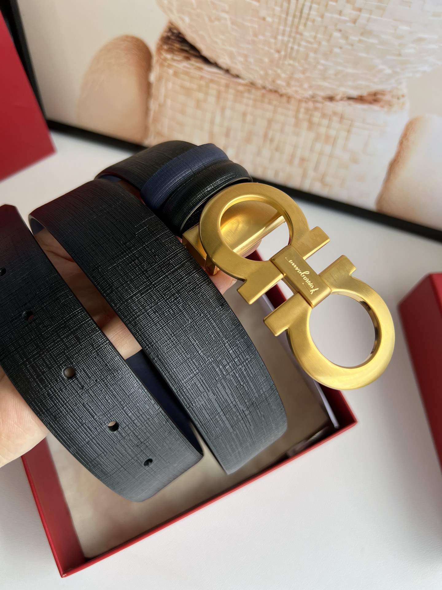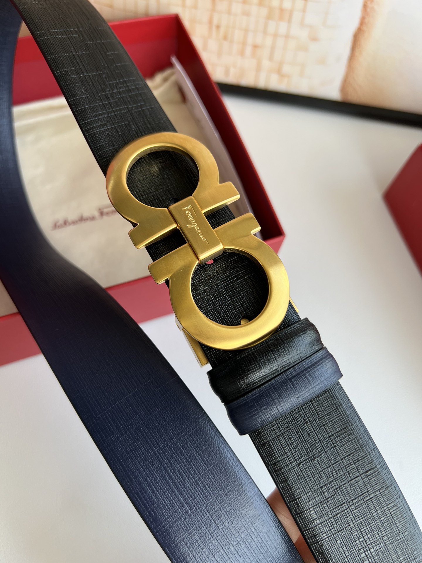 A piece that highlights temperament, with an exquisite 8-shaped metal brushed buckle. The metal buckle is visually designed to be simple yet extraordinary, and tactilely comfortable and delicate. Paired with double-sided top-grain blue/black leather, it is minimalist and refined enough. 3.5cm