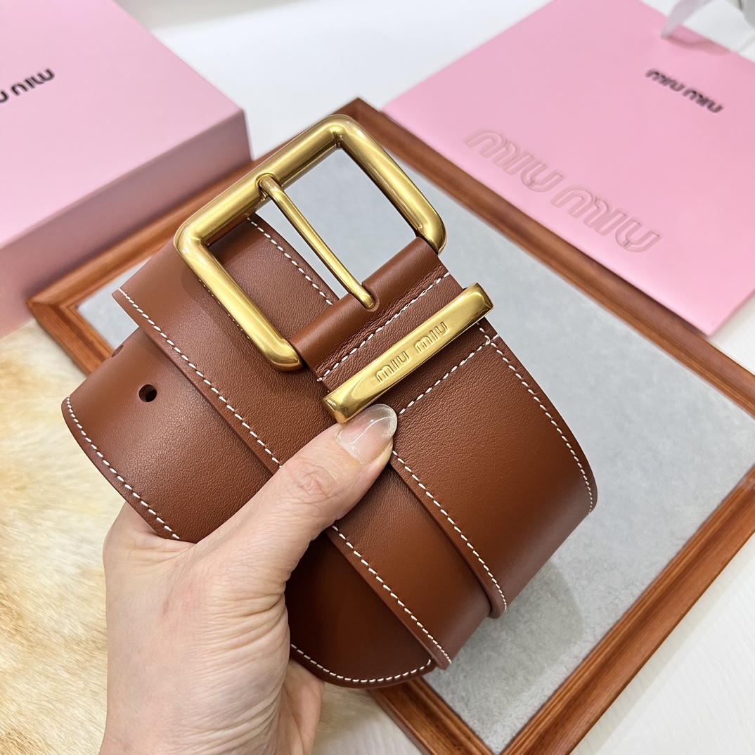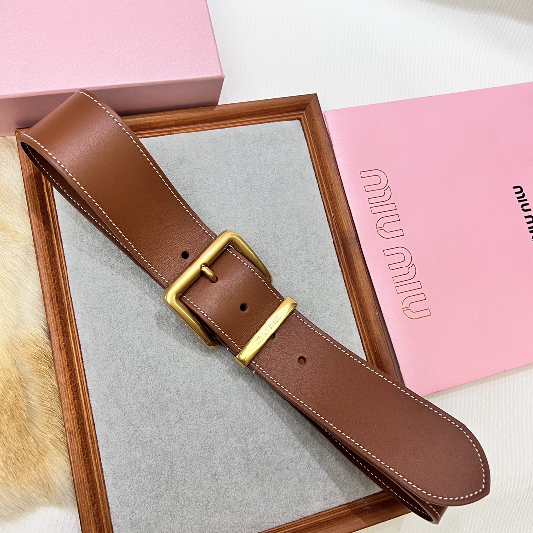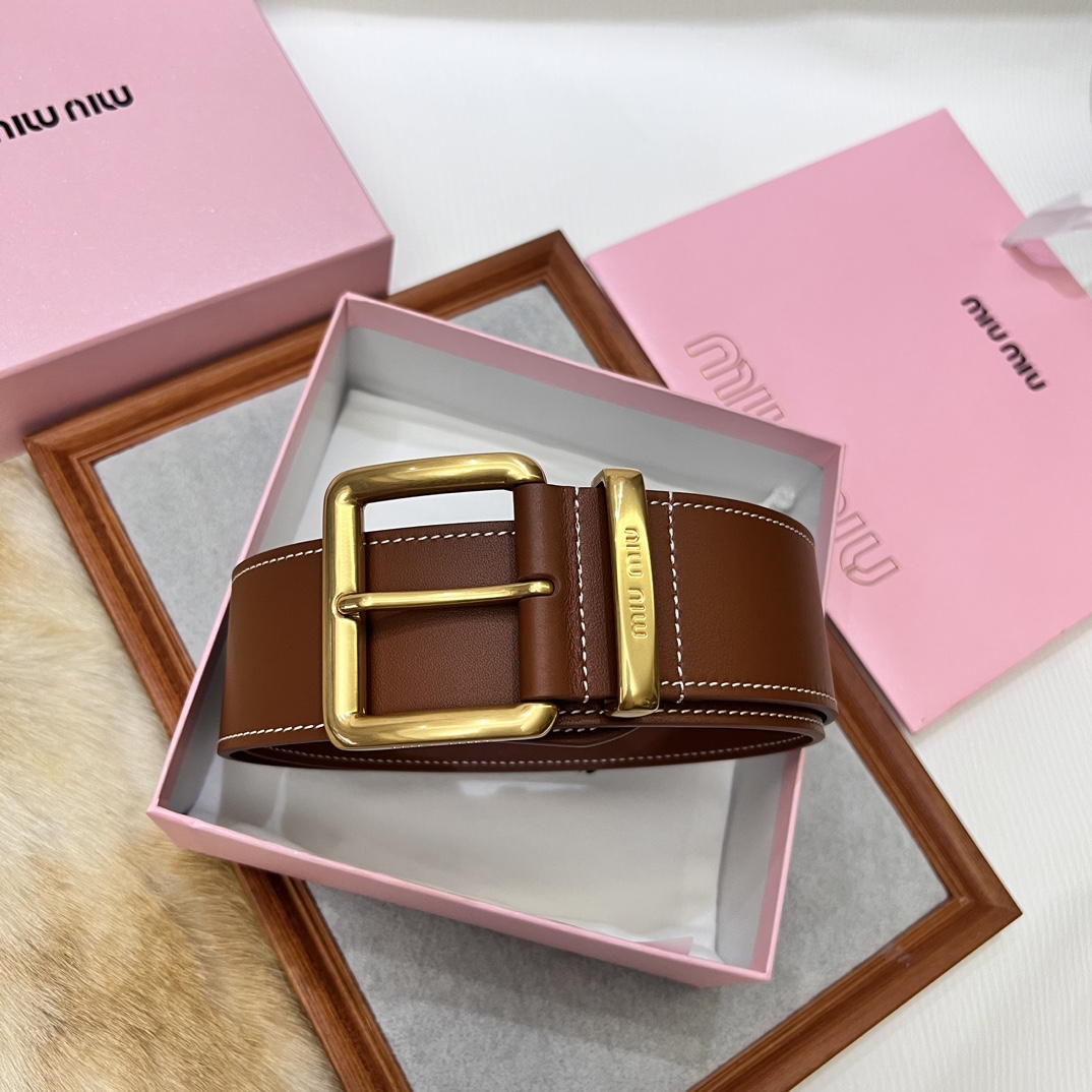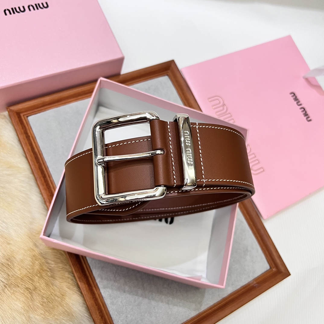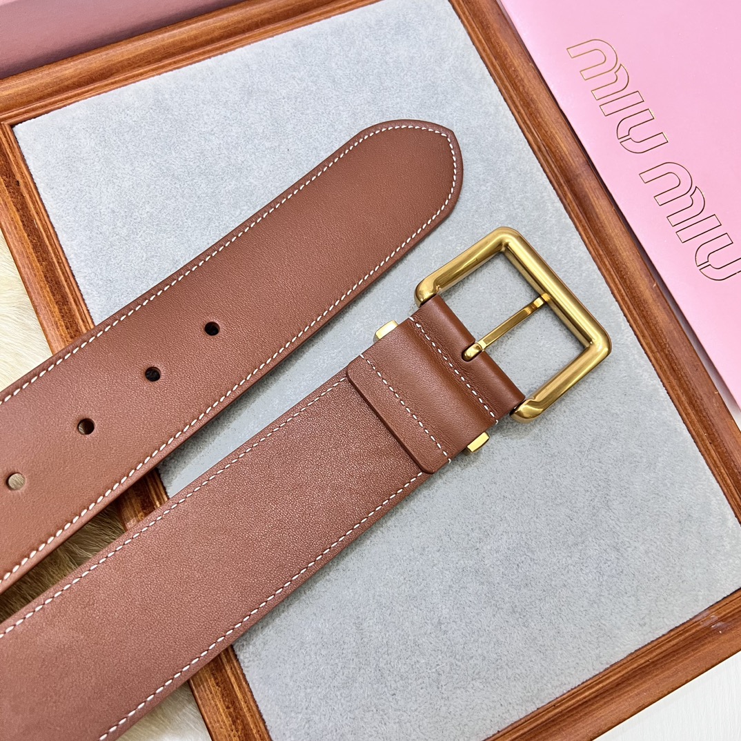 24 metal buckles. The belt loop is adorned with a laser-engraved logo. This leather belt features a simple and elegant design, with the belt loop bearing the Miu Miu logo. Imported cowhide belt 5.0cm.