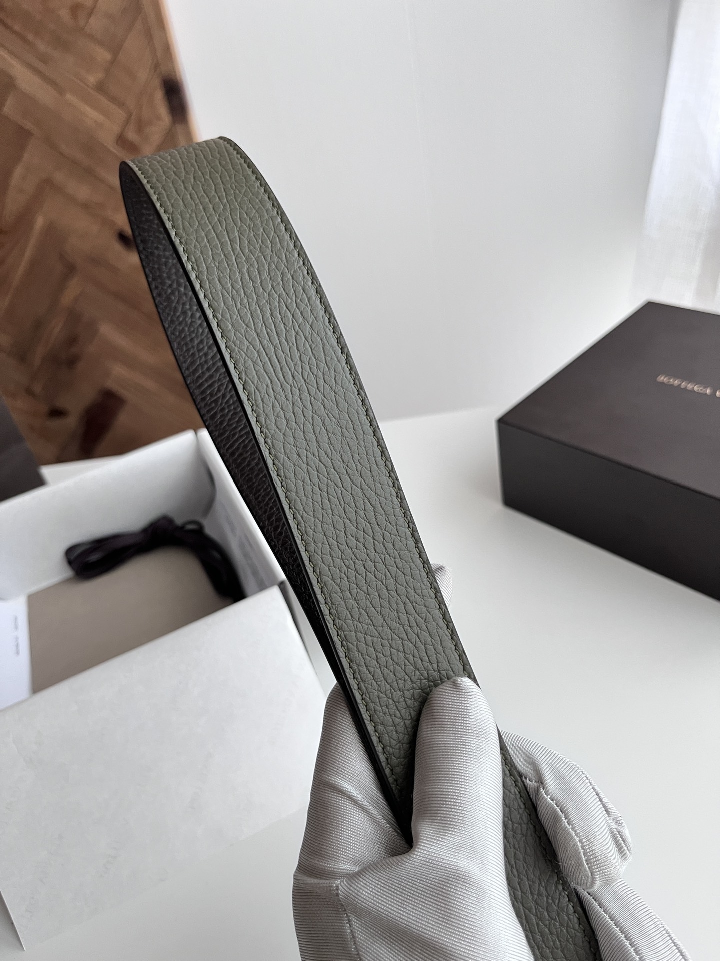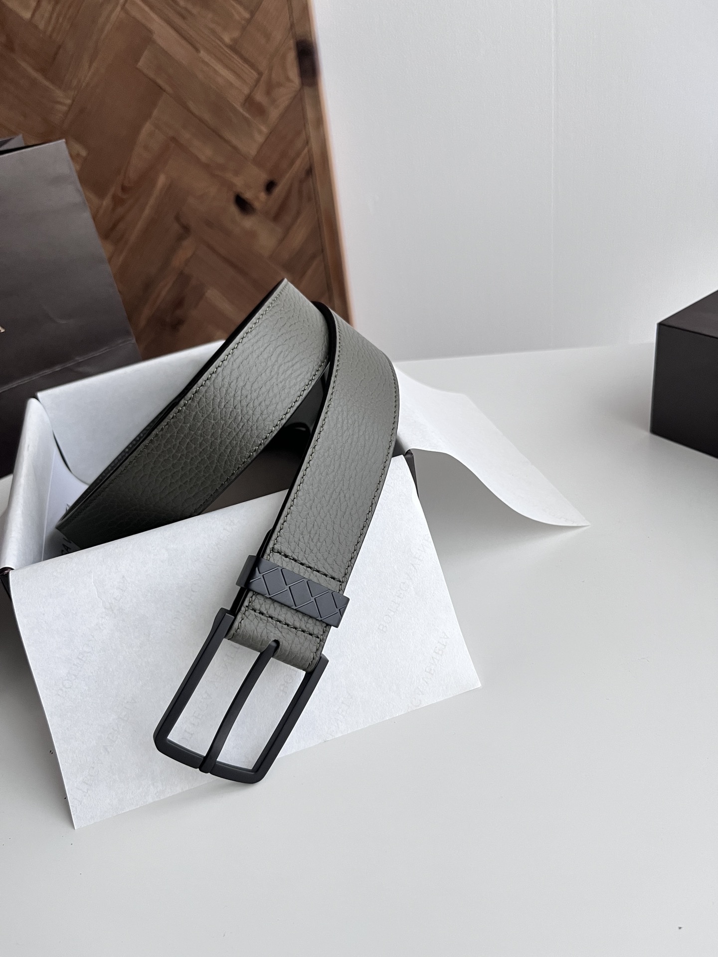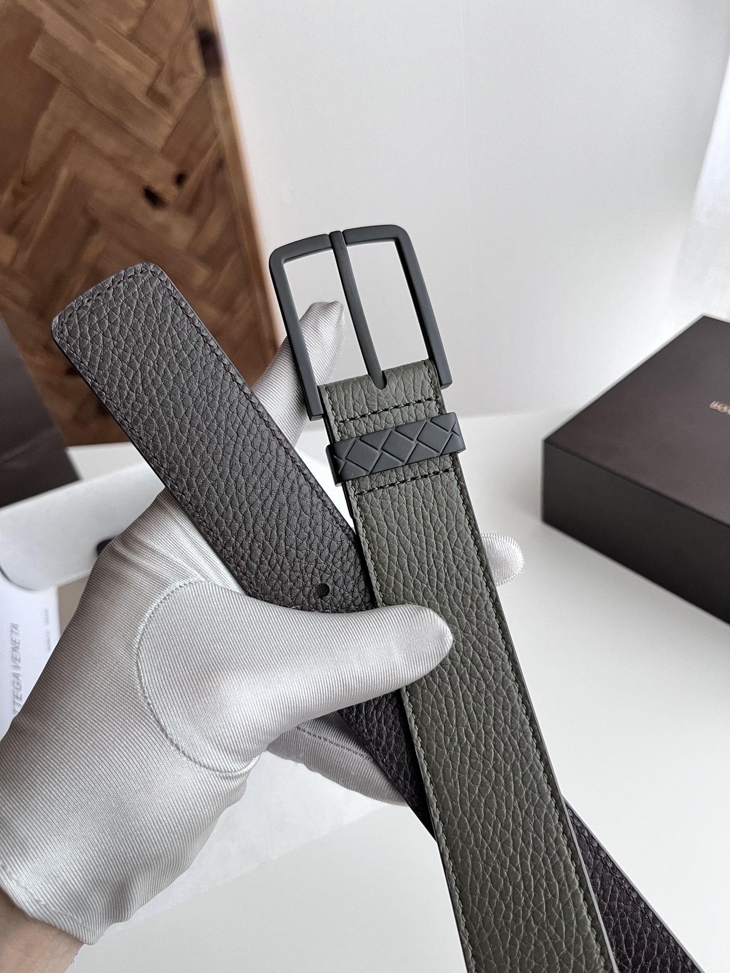 Bv 2024 latest men's belt double-sided Italian original factory pebble grain calfskin with vacuum gunmetal pin buckle side has logo buckle is woven plaid design width 35MM color: military green/coffee
