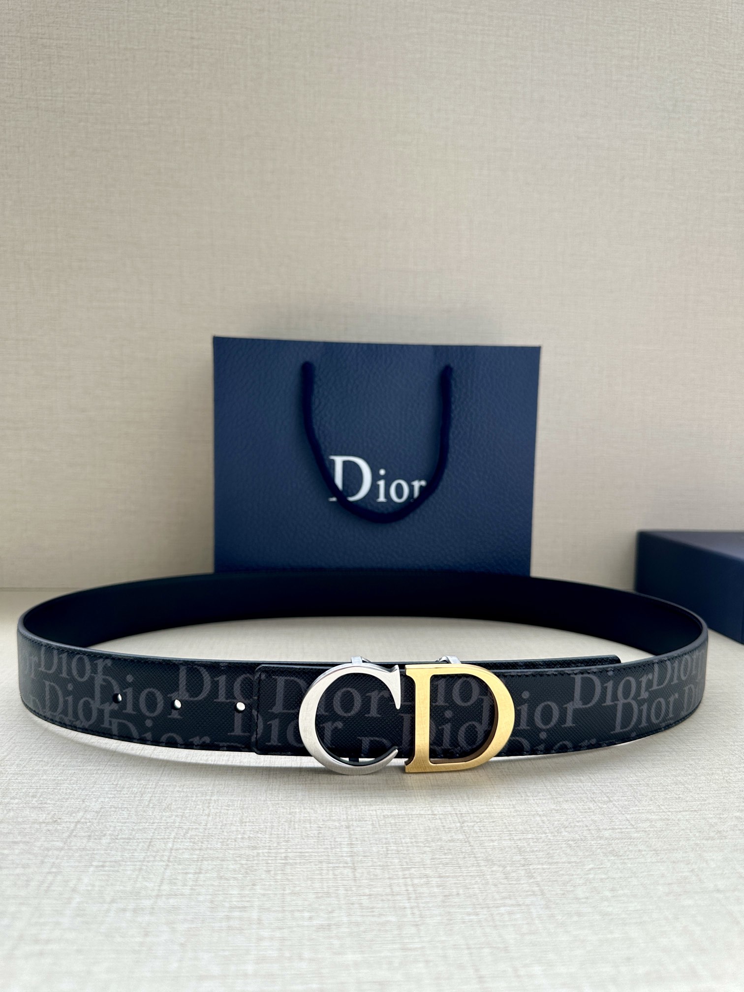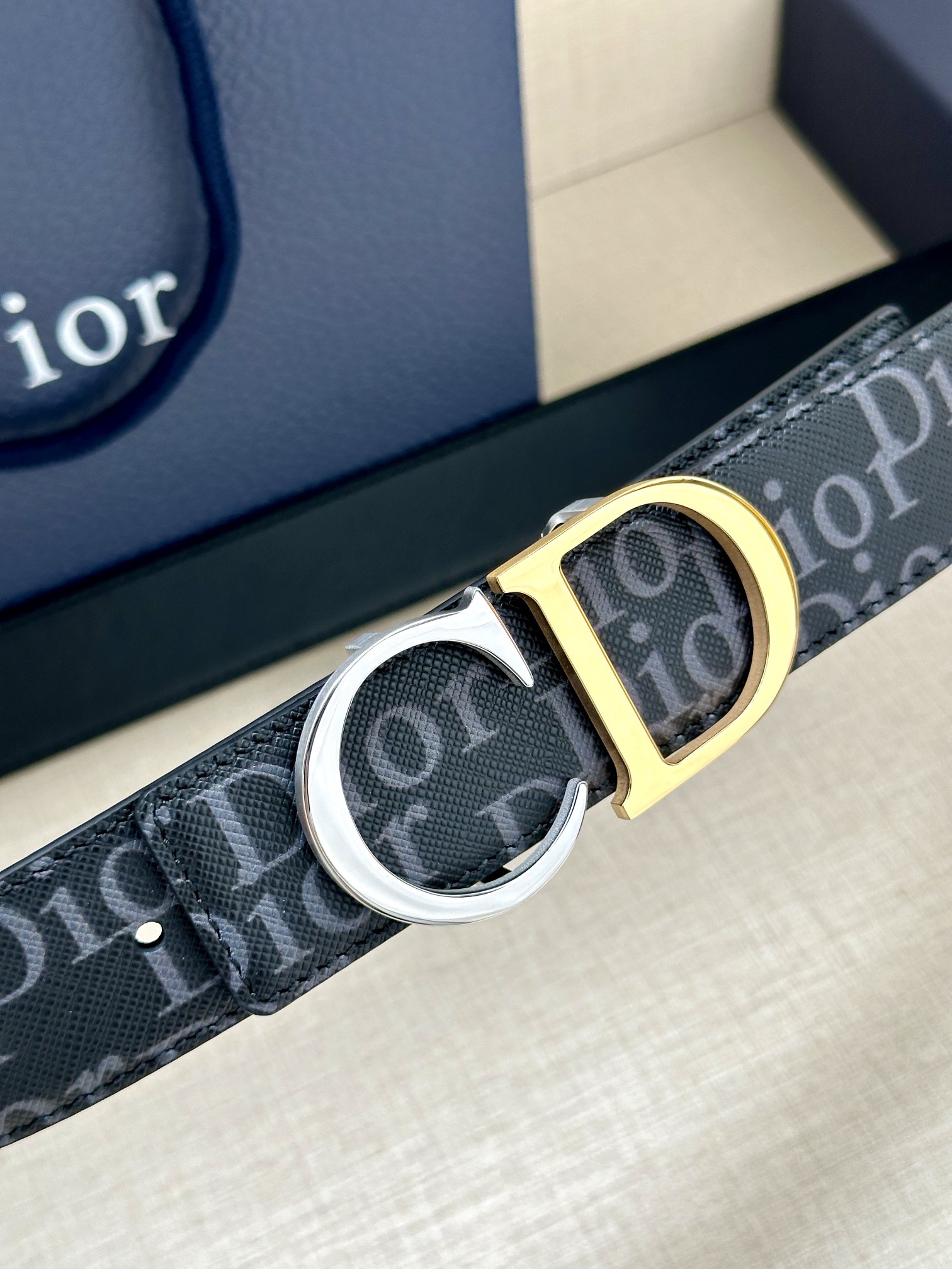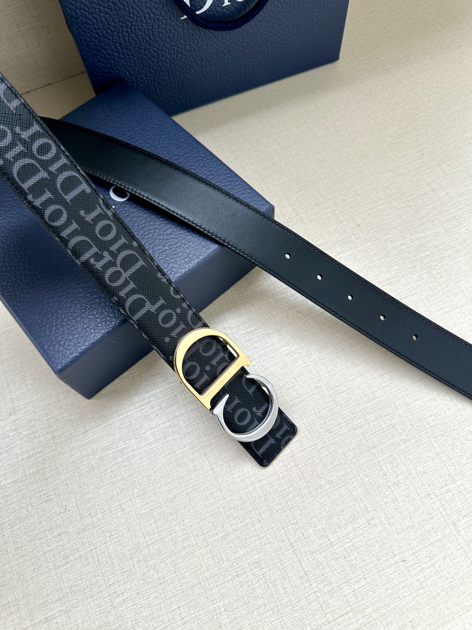 This 35mm reversible belt combines elegance with contemporary style. Featuring a double-sided design, one side is crafted from black Oblique Galaxy printed leather, while the other side is made of smooth black calfskin. The Oblique Galaxy printed leather showcases a cut-out Oblique pattern on the smooth calfskin, highlighting Dior's exceptional craftsmanship. Enhanced with reflective lining, it can be paired with various 35mm belt buckles to create a distinctive and versatile accessory.