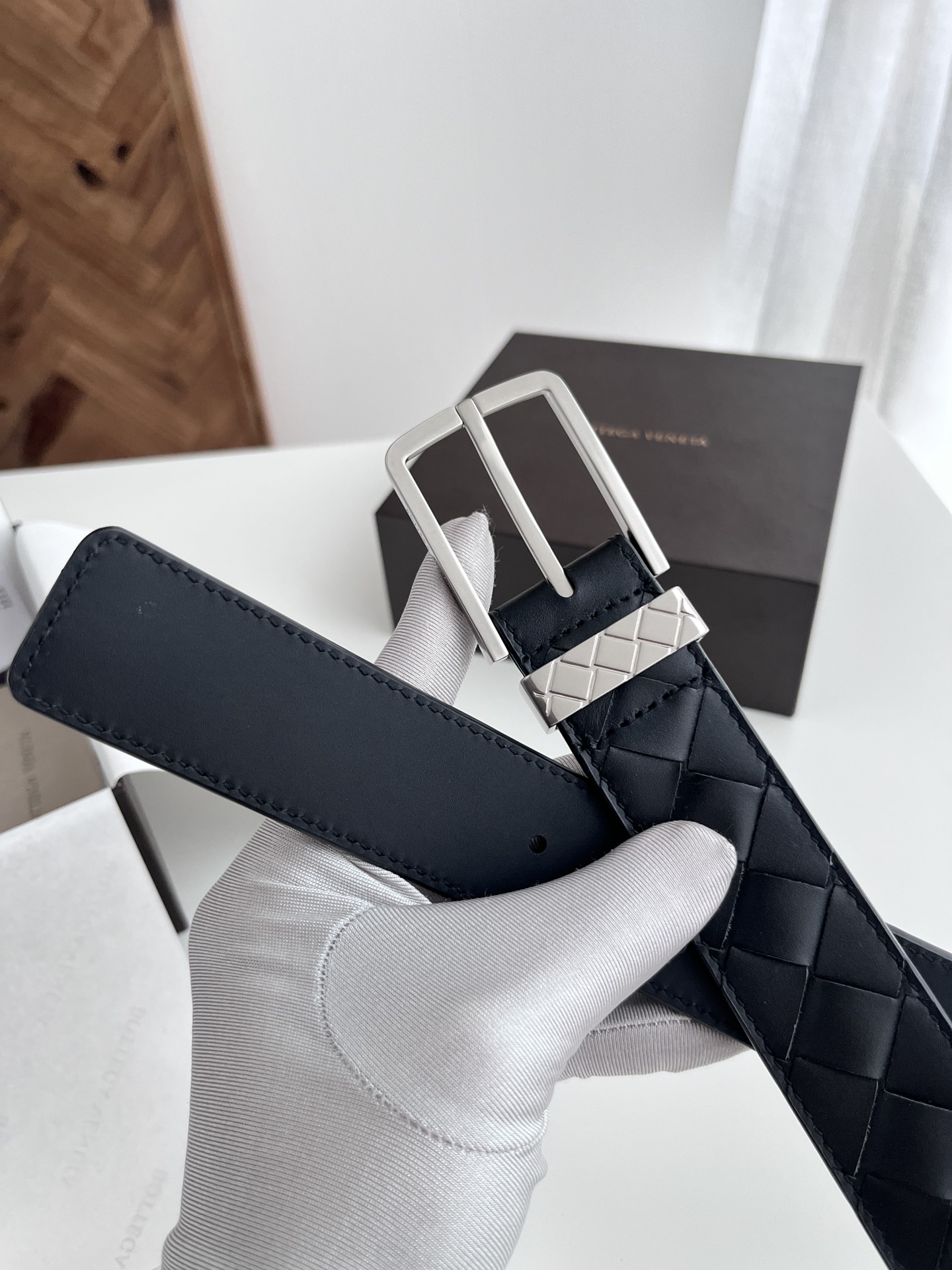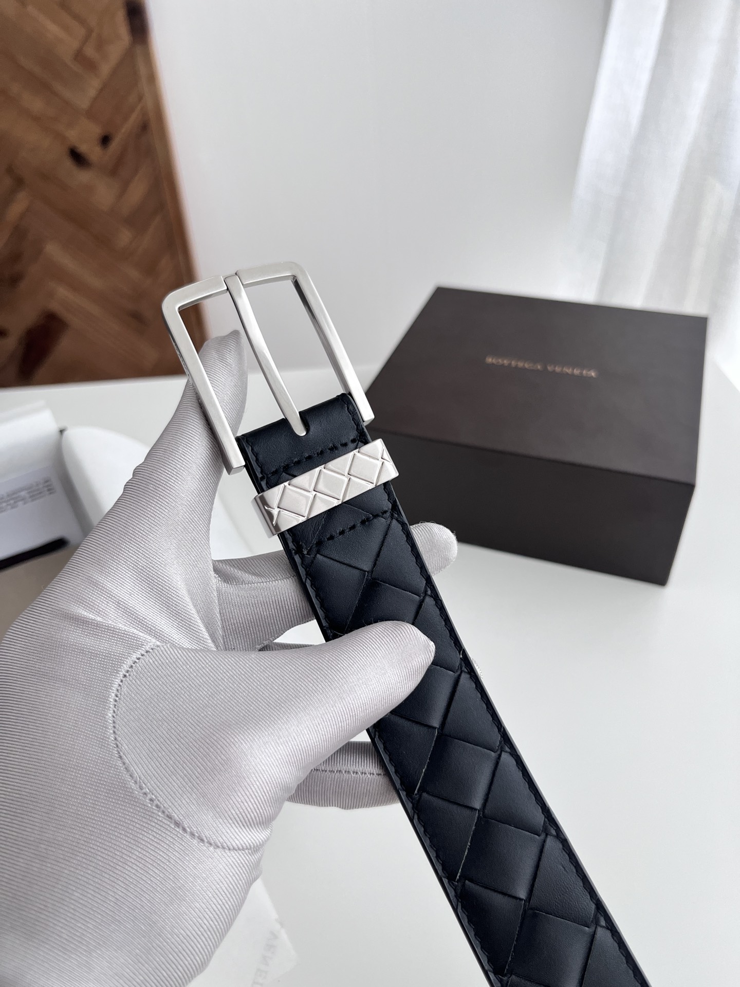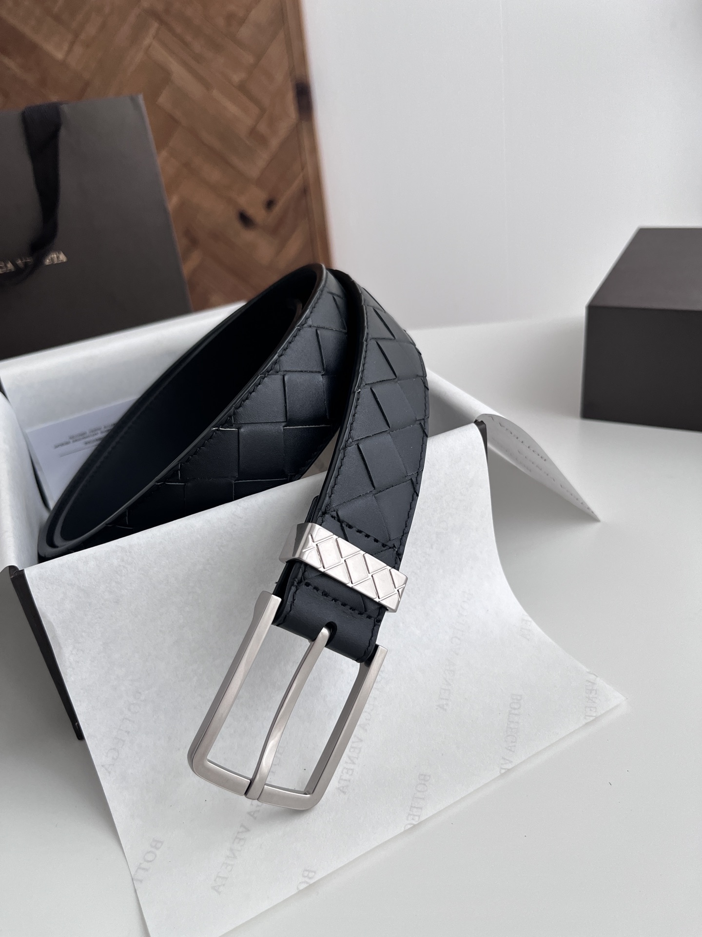 Bv 2024 new men's woven belt, pure handmade intreccio large grid weaving, double-sided Italian calfskin with vacuum gunmetal pin buckle, side has logo, buckle is woven grid design, width 35MM, color: black + black