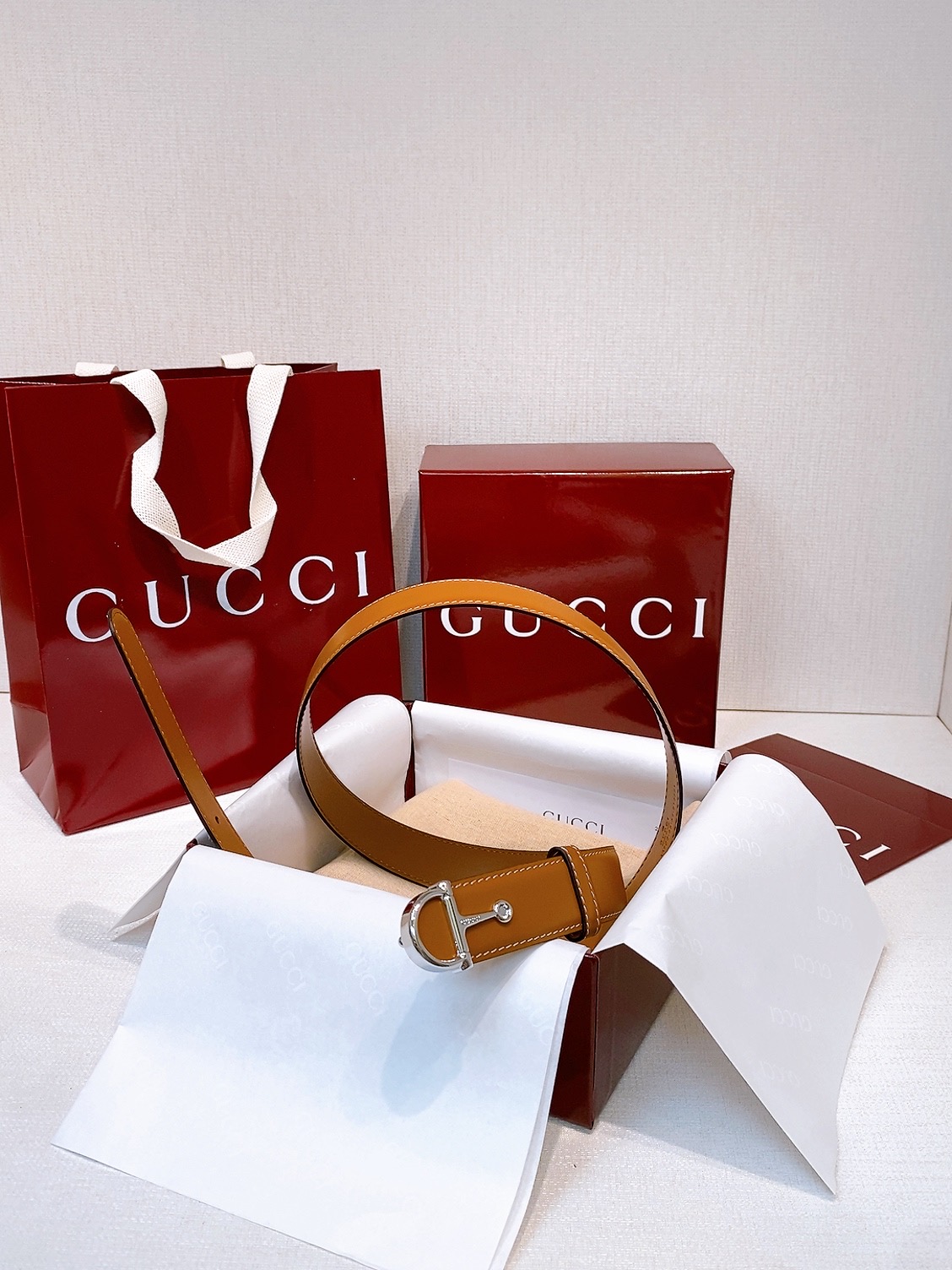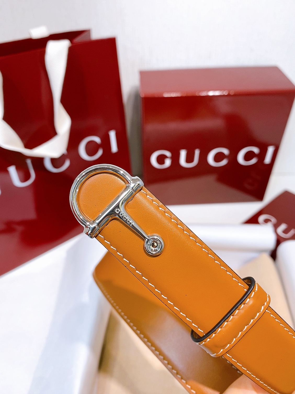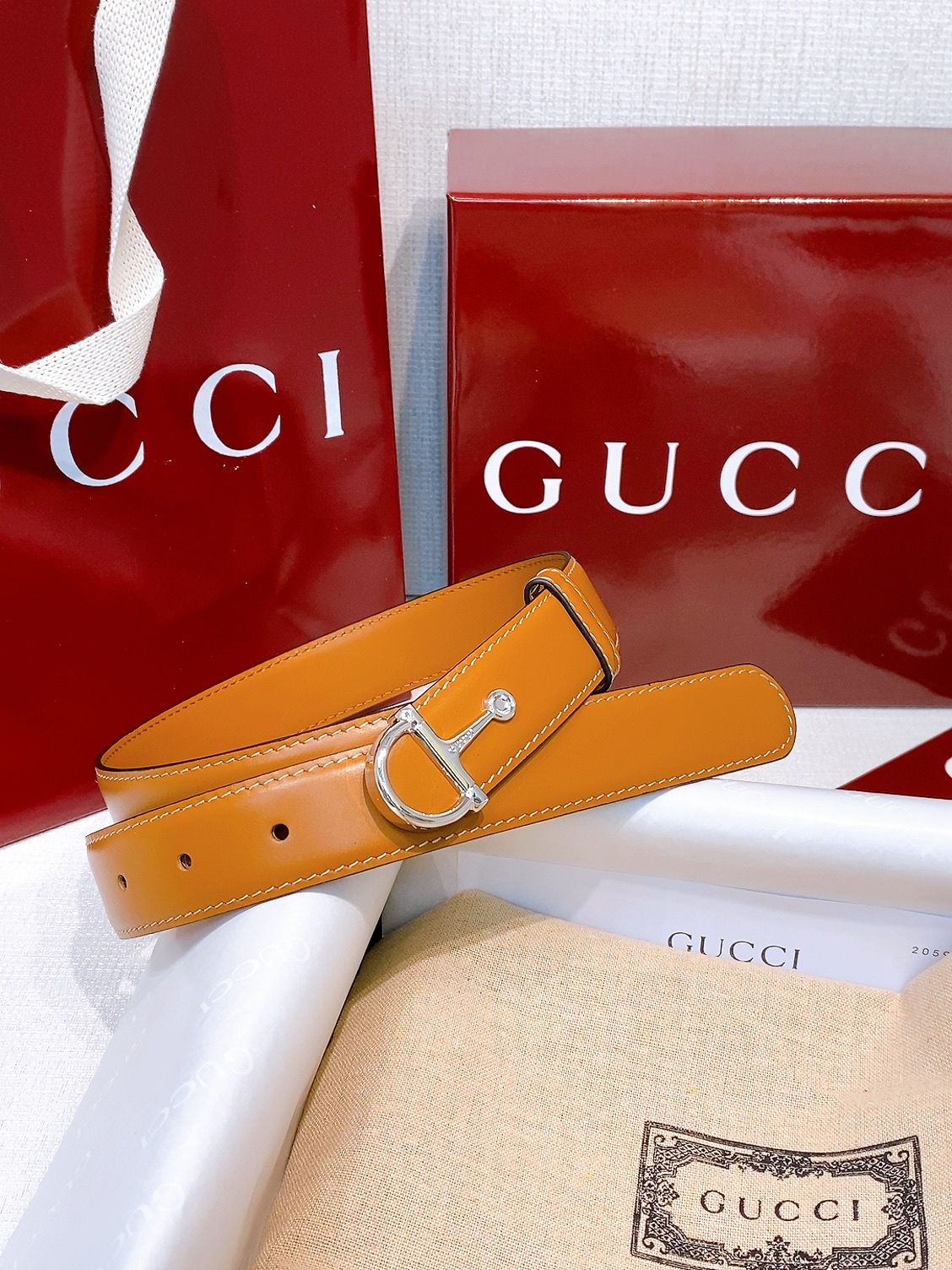 -Gucci Saddle Buckle Brass Metal This everyday belt is part of the early Fall 2025 collection. Inspired by the house's heritage, it is crafted from smooth leather and defined by a semi-Horsebit buckle. Sizes 75-110 European sizes available.