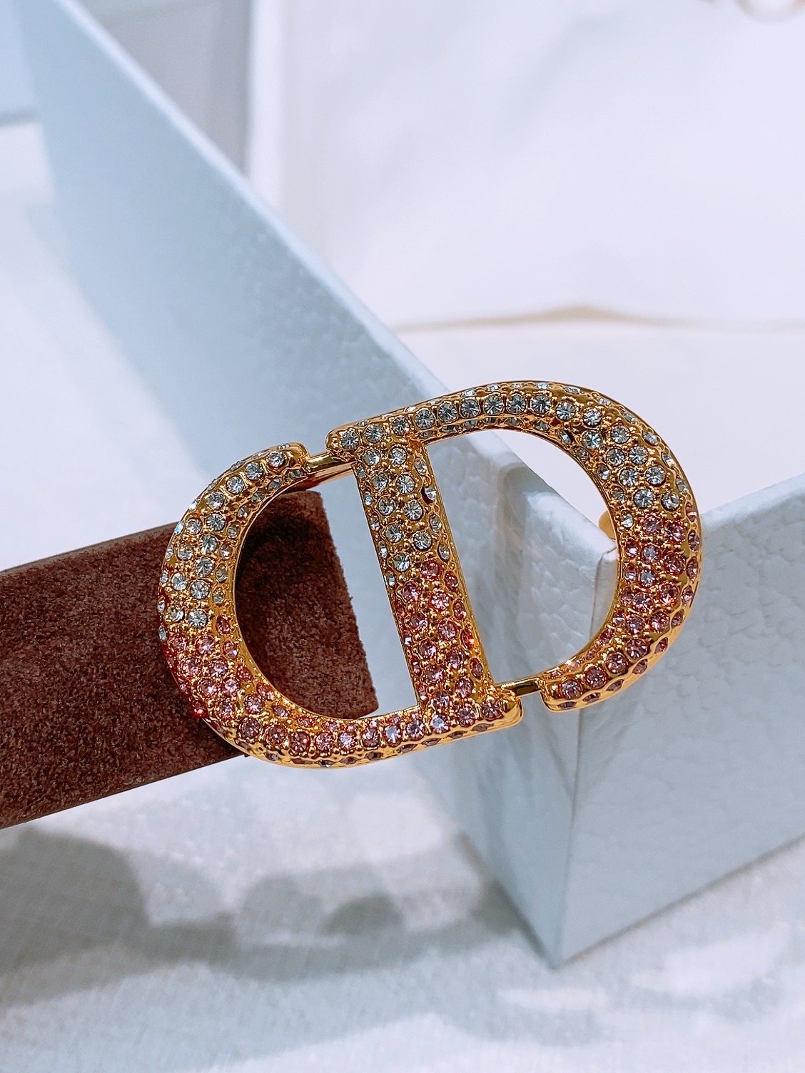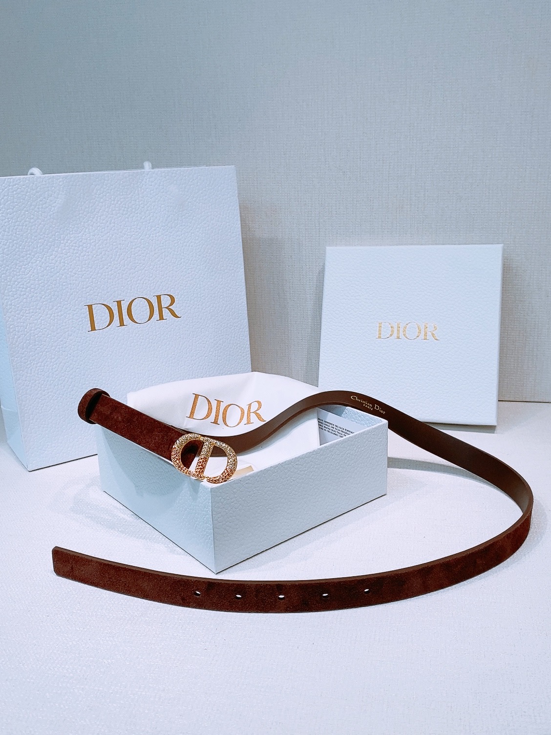 This model with an aged gold metal CD buckle is revisited in a light gold suede calfskin version, presenting a casual and modern look.