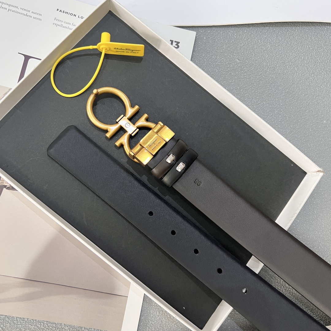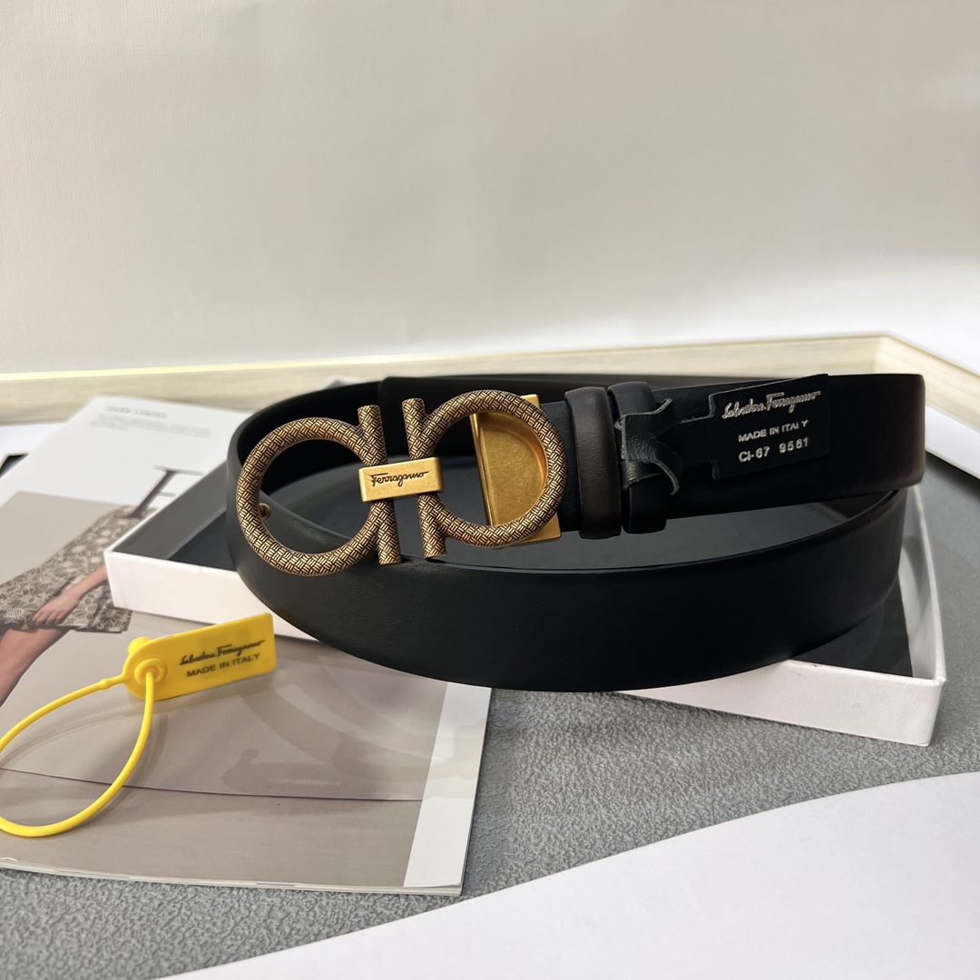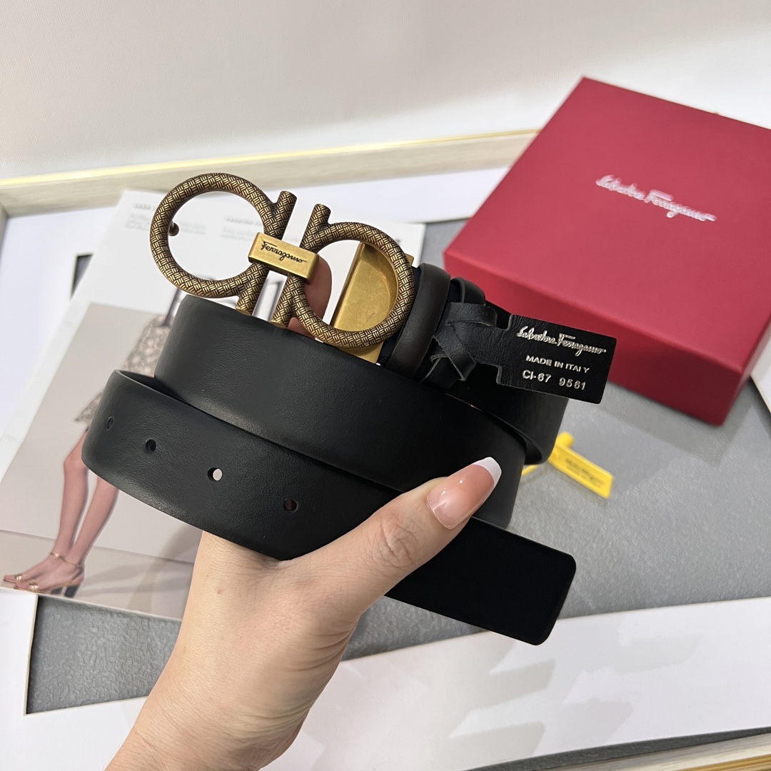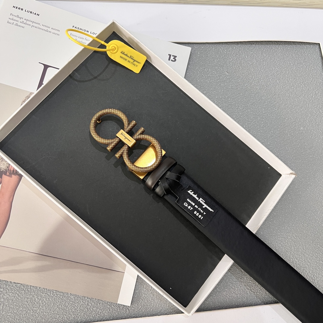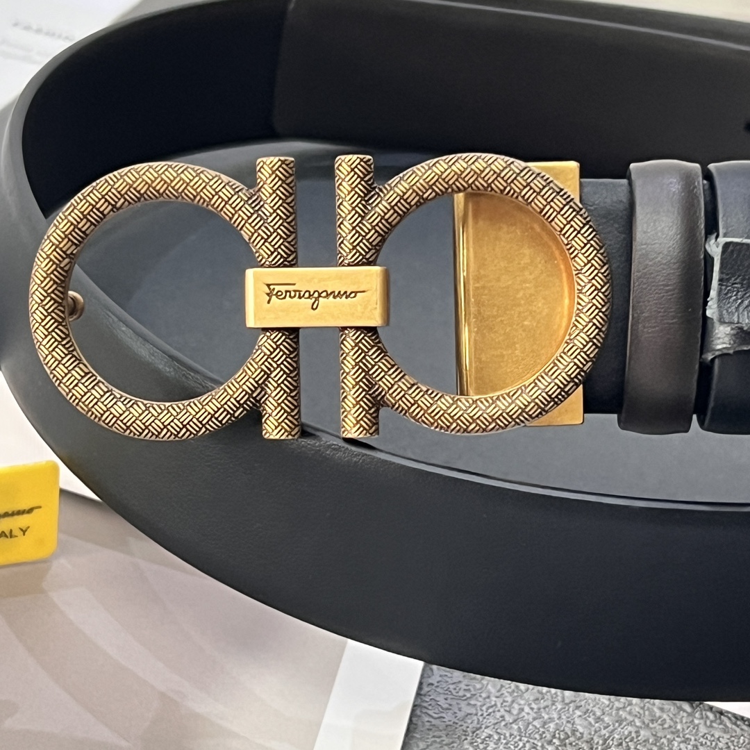 This belt has an elegant style, featuring a rectangular buckle adorned with a small Gancini. It is designed with two sides: one side is made of hammered texture material, while the other side is embossed with an all-over Gancini pattern, exuding a classic charm in a subtle way. The length is adjustable, achieving a tailored, slimming effect. 3.5 wide