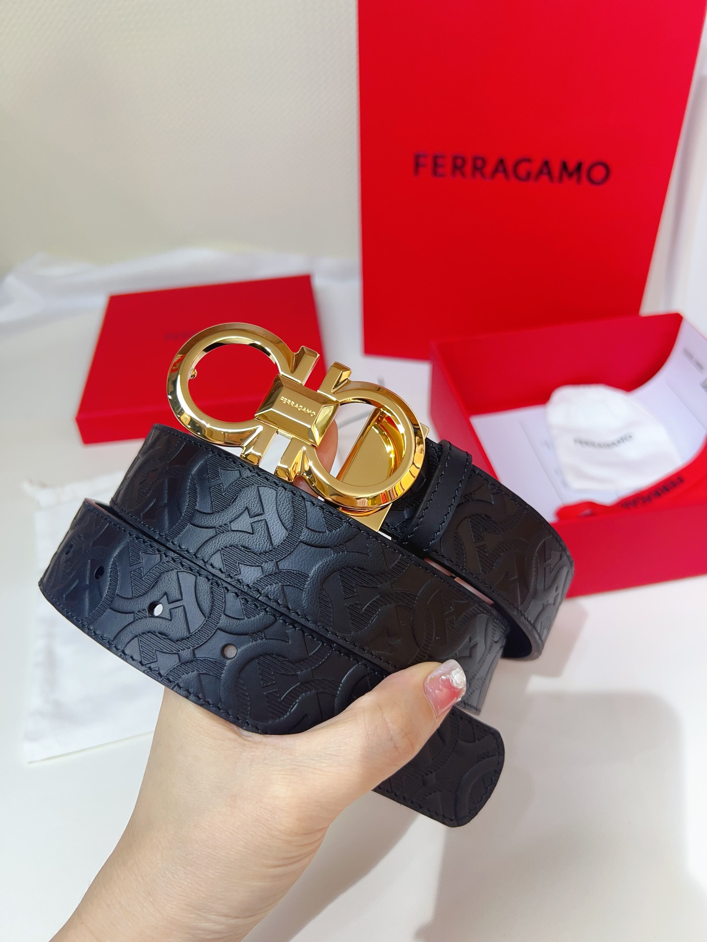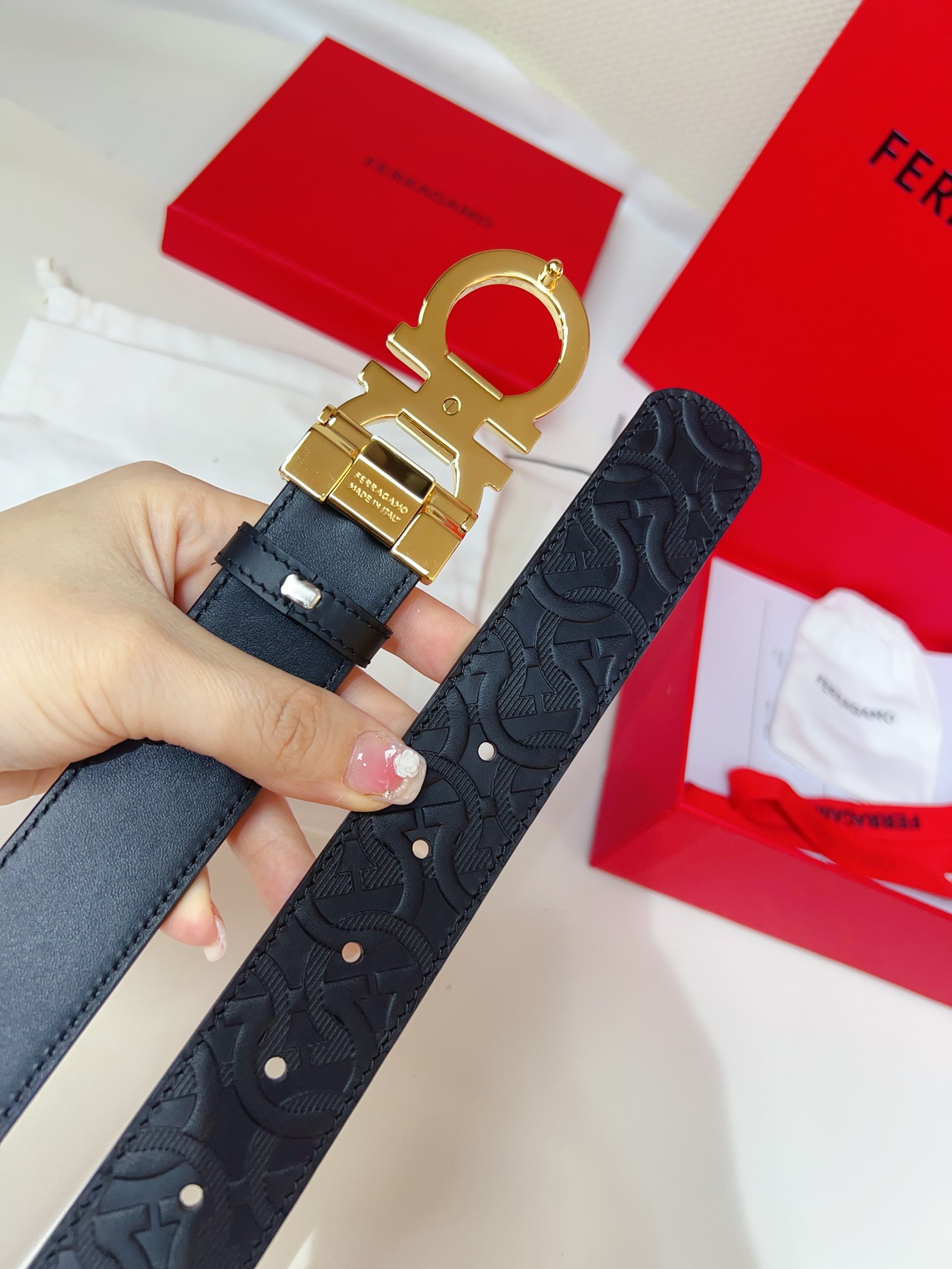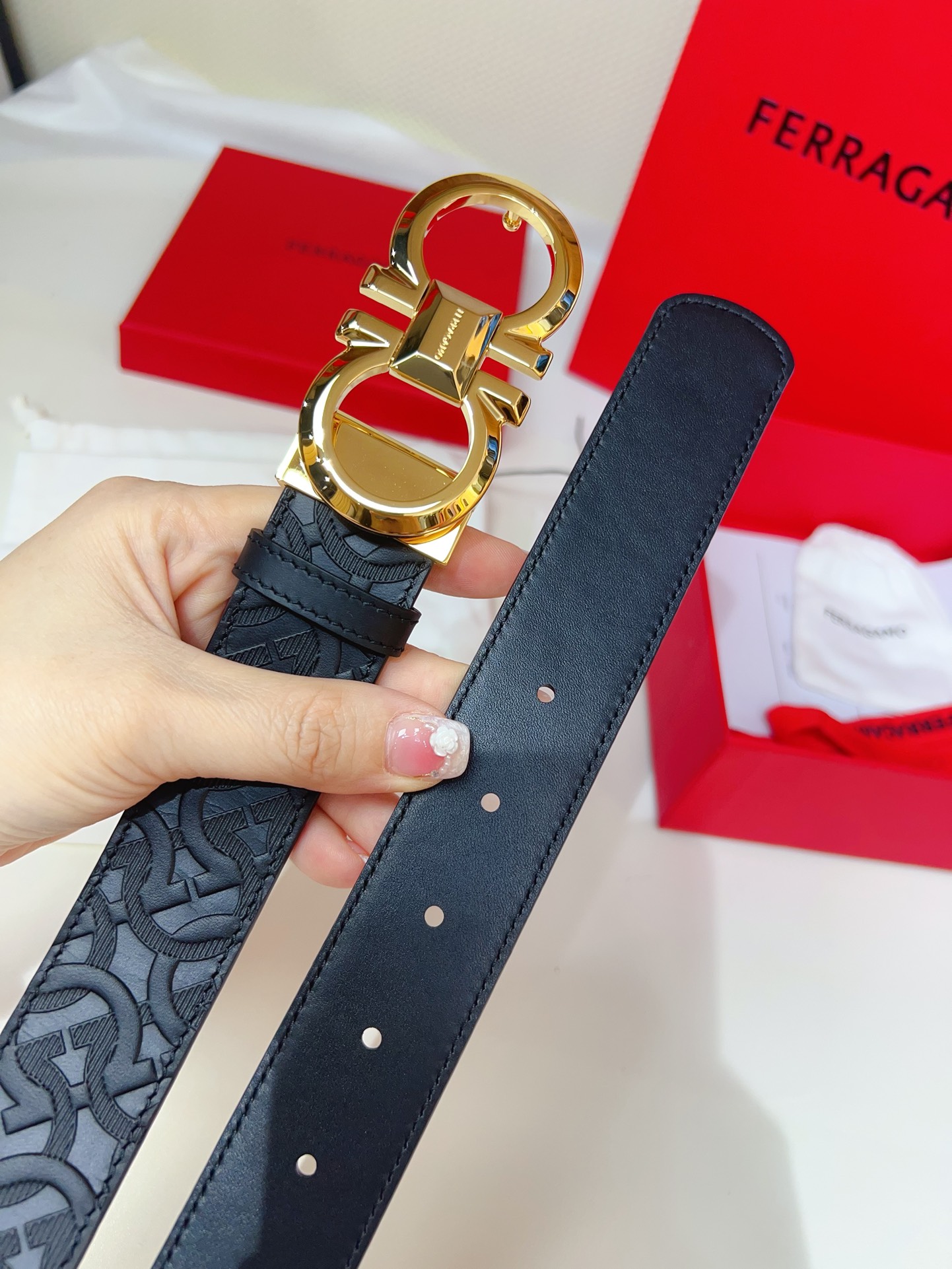 This double-sided belt features an elegant style with a dual-finish design, flexibly adapting to various looks while maintaining a sophisticated tone at all times, making it a staple accessory for the modern refined gentleman. The natural grained calfskin and hammered calfskin are spliced together, creating a bold and eye-catching edge effect. The Gancini buckle is paired with contrasting trim, and the connection point is adorned with a logo. The adjustable length allows for a tailored, slimming effect. The belt can be trimmed or additional eyelets can be added to achieve a tight or loose fit, 3.5 wide.