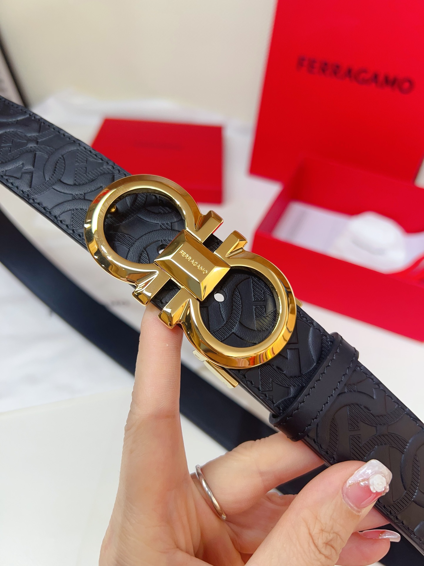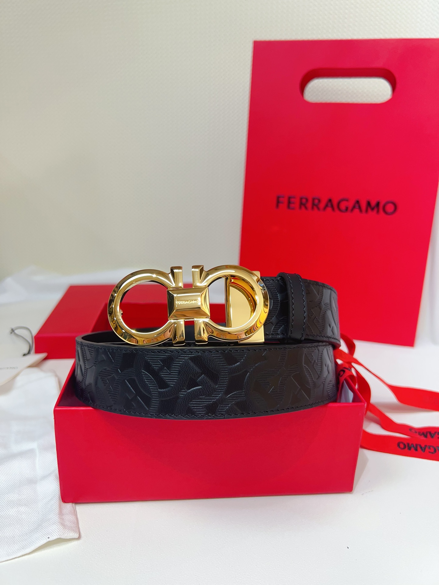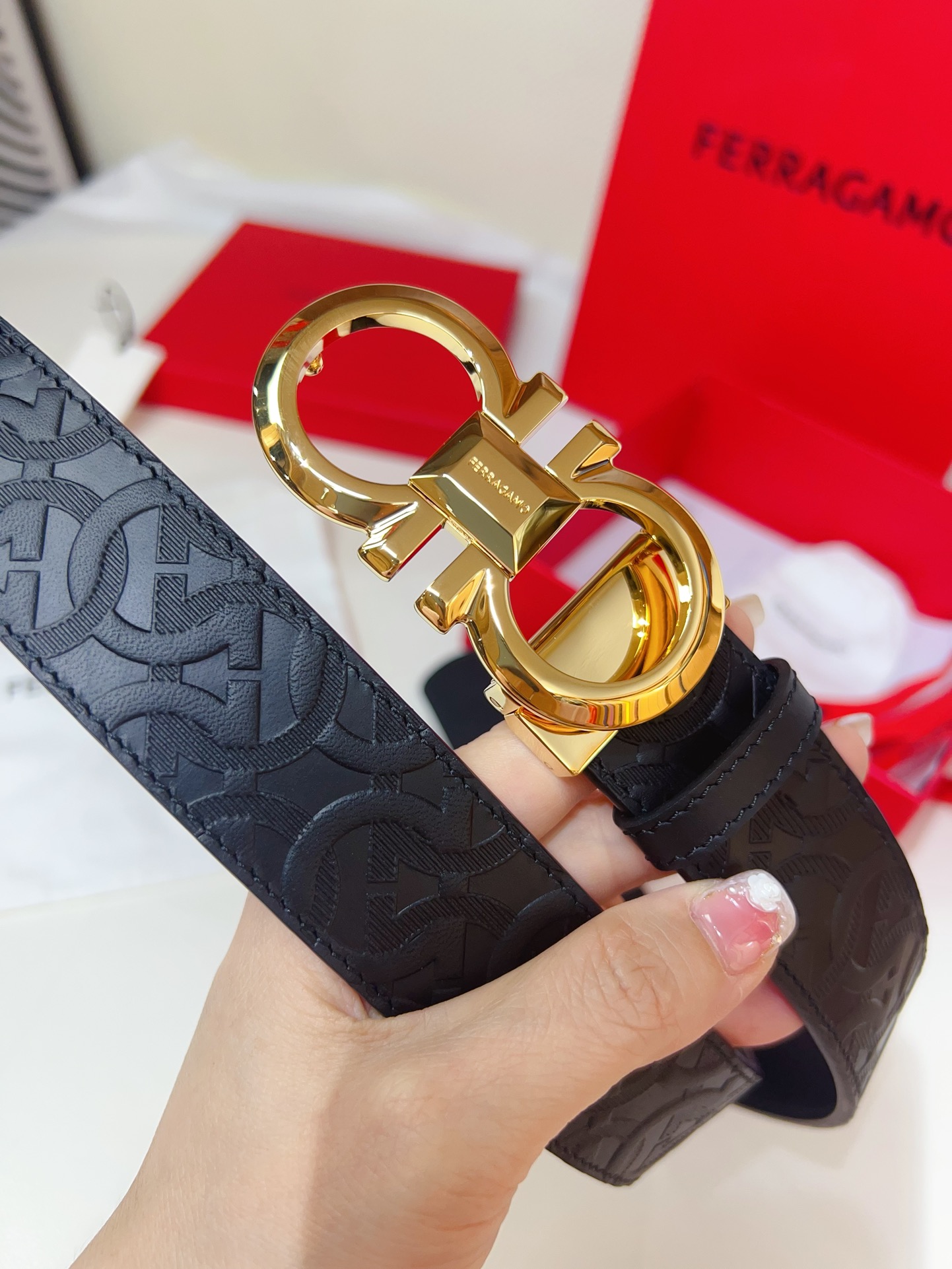 This double-sided belt features an elegant style with a dual-finish design, flexibly adapting to various looks while maintaining a sophisticated tone at all times, making it a staple accessory for the modern refined gentleman. The natural grained calfskin and hammered calfskin are spliced together, creating a bold and eye-catching edge effect. The Gancini buckle is paired with contrasting trim, and the connection point is adorned with a logo. The adjustable length allows for a tailored, slimming effect. The belt can be trimmed or additional eyelets can be added to achieve a tight or loose fit, 3.5 wide.
