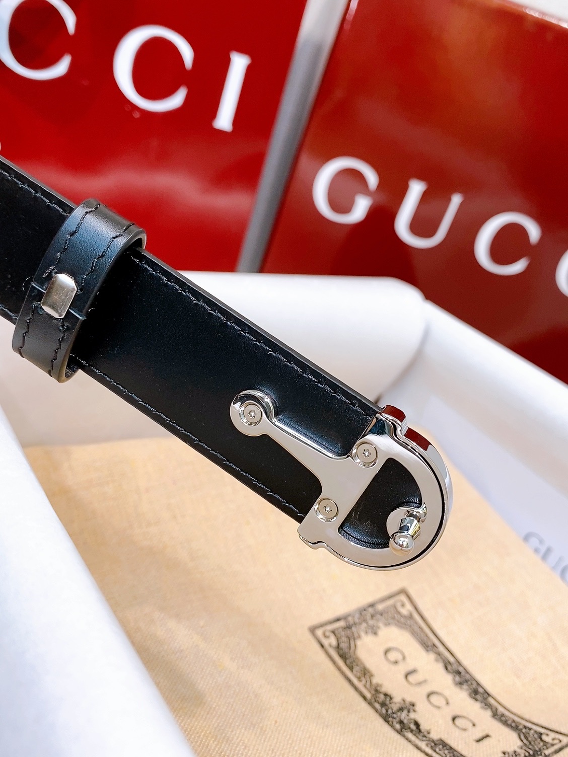 -Gucci Saddle Buckle Brass Metal This everyday belt is part of the early Fall 2025 collection. Inspired by the house's heritage, it is crafted from smooth leather and defined by a semi-Horsebit buckle. Sizes 75-110 European sizes available.