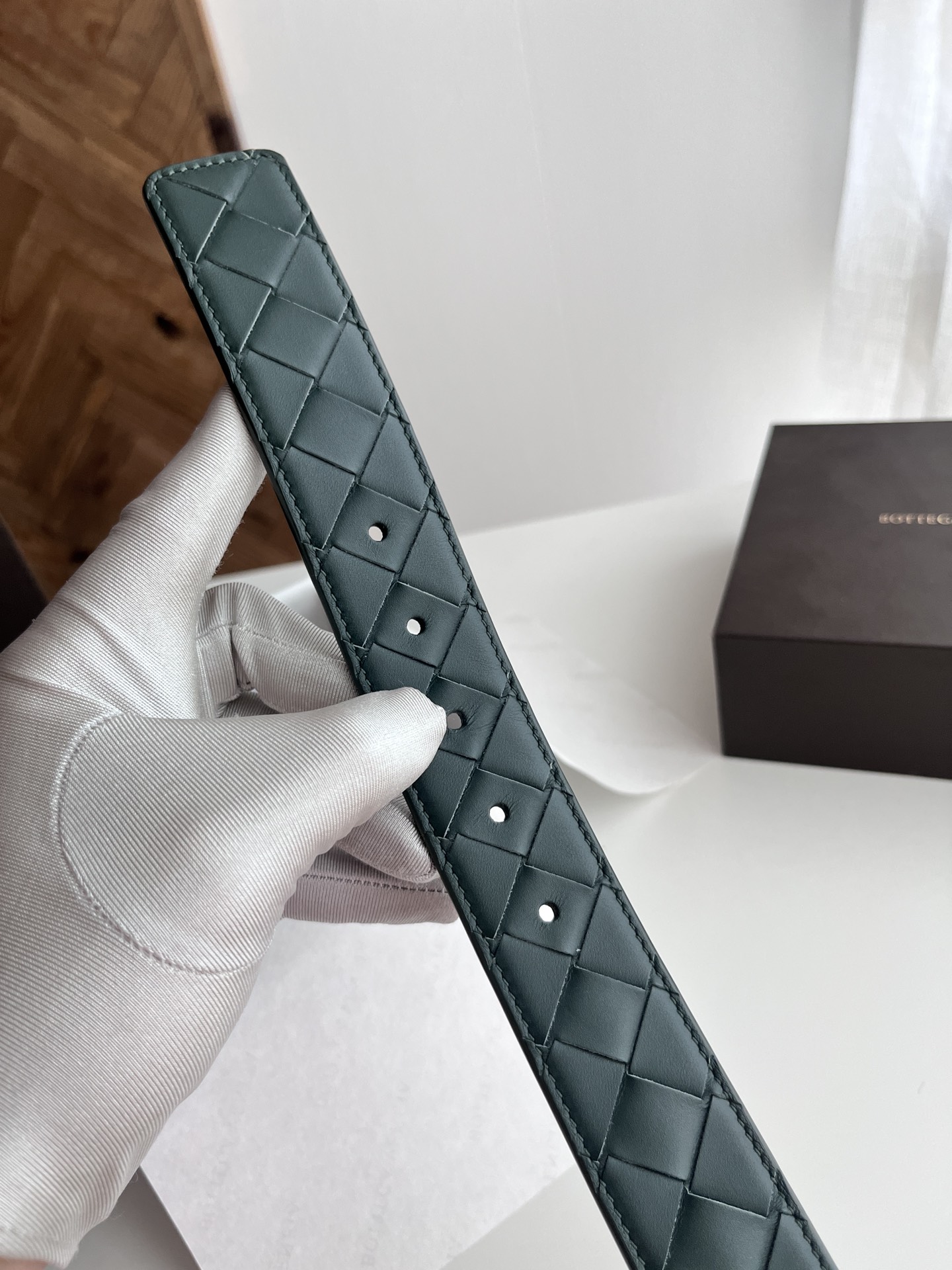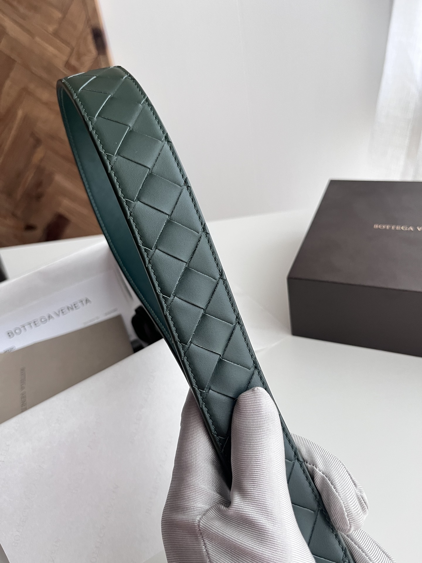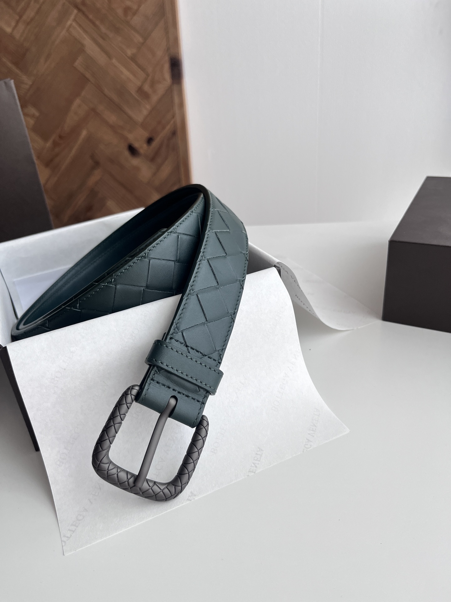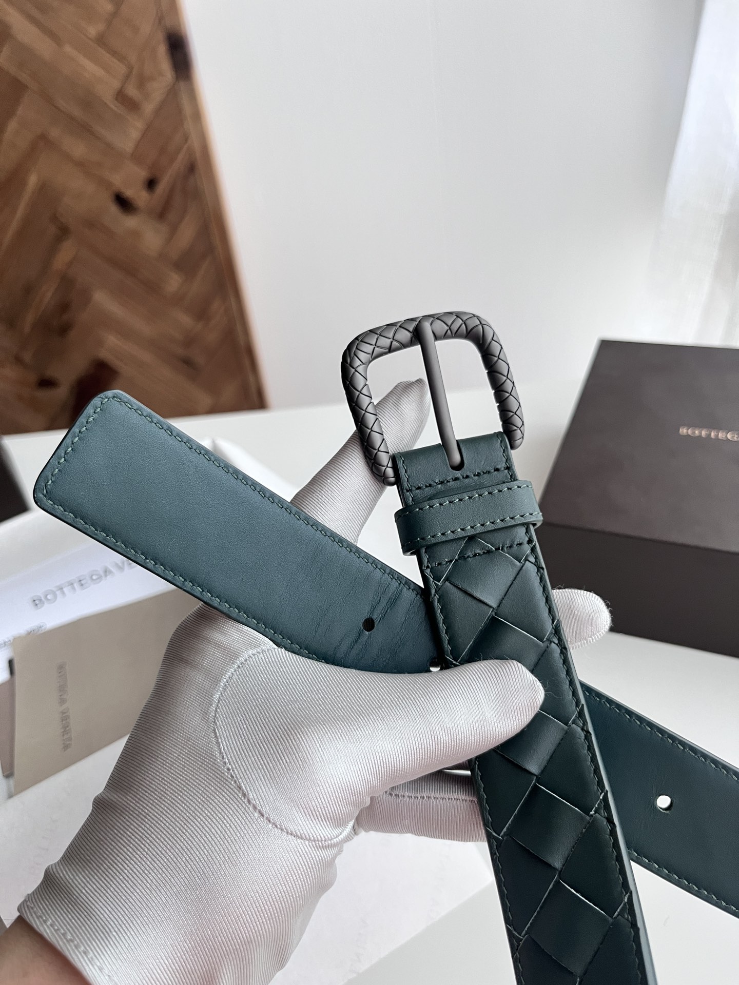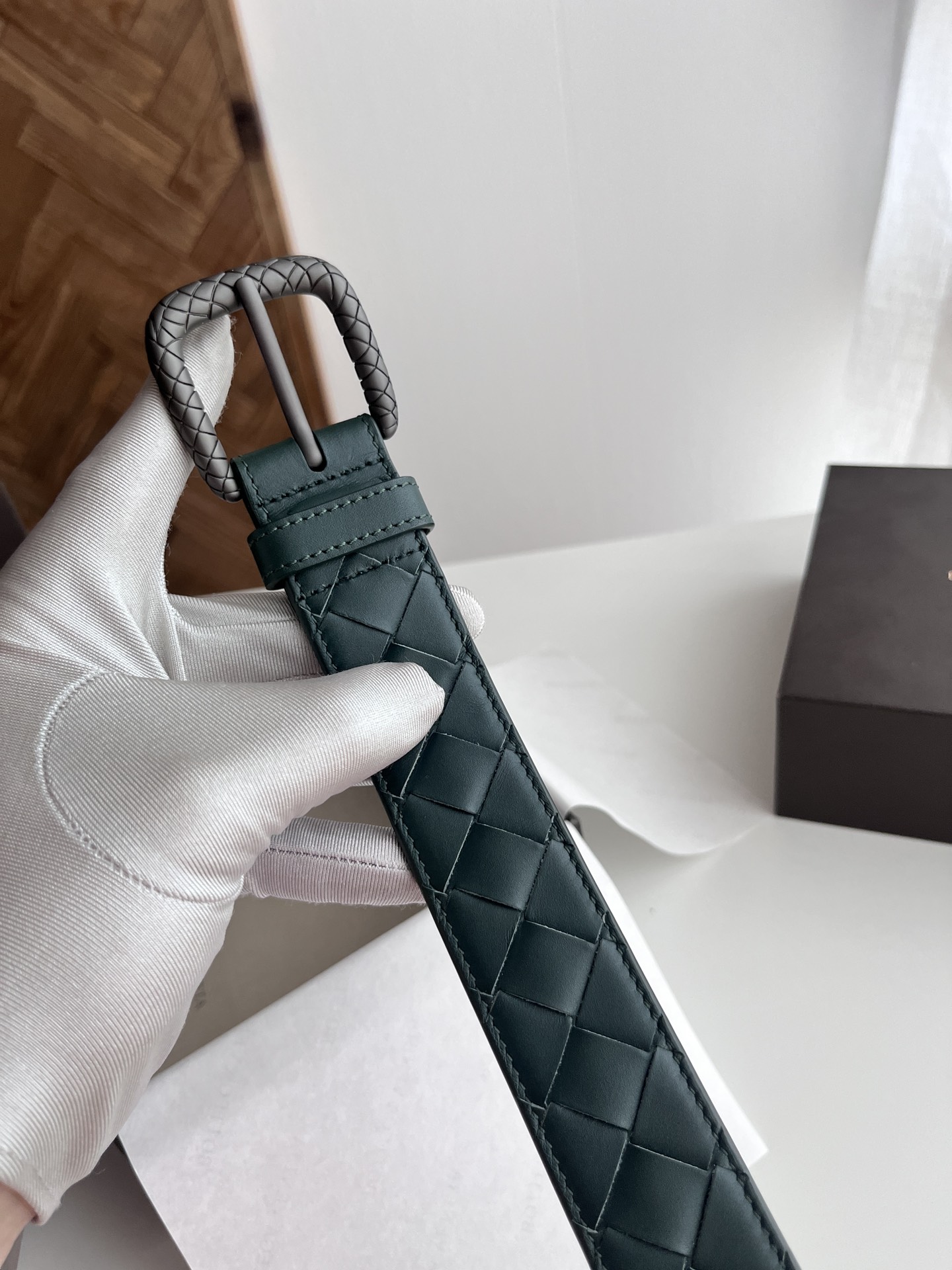 Bv 2024 latest men's woven belt, pure handmade intreccio large grid weaving, double-sided Italian calfskin with vacuum gunmetal woven pattern pin buckle, width 35MM, color: pine green + pine green